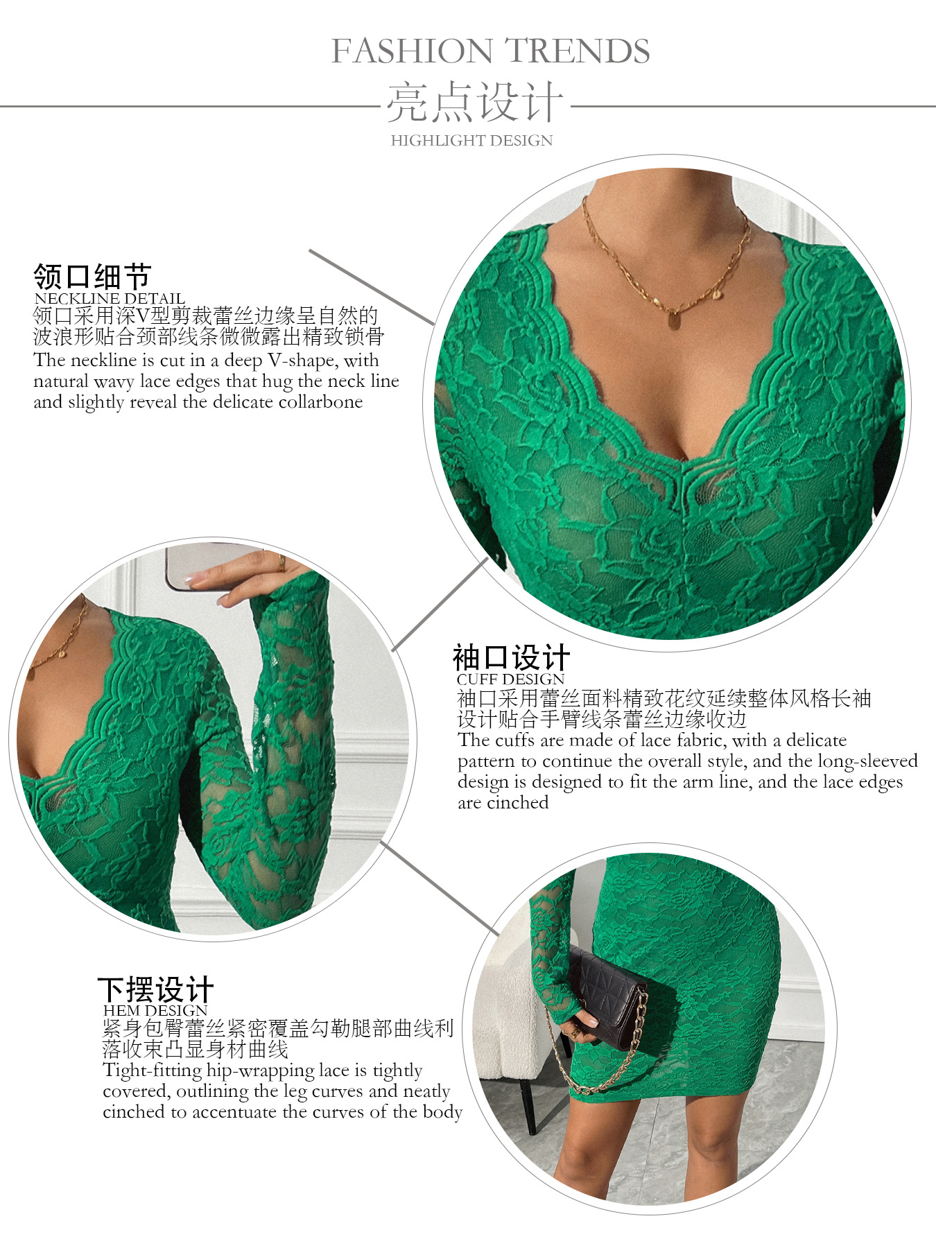 유럽 및 미국 해외직구 아마존 2025 가을 겨울 신상 여성 브이넥 섹시 레이스 슬림 긴팔 드레스 파티용