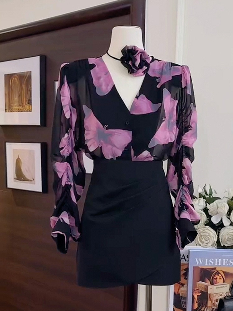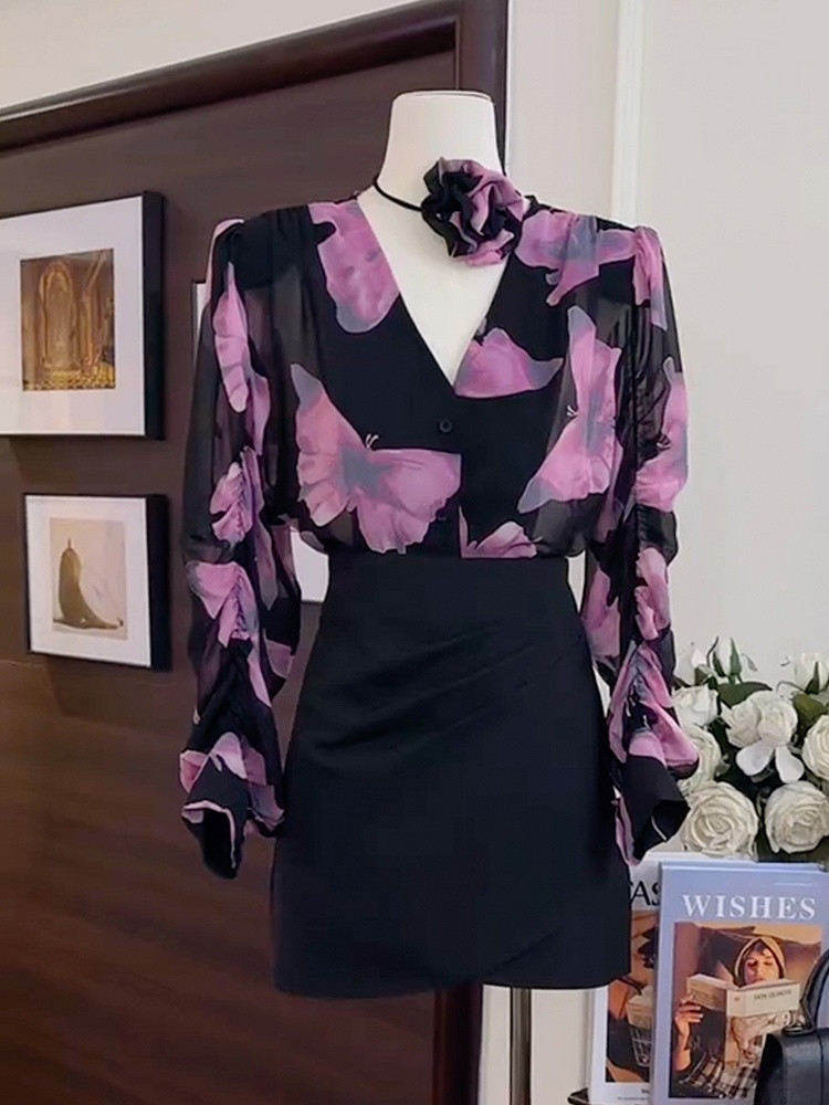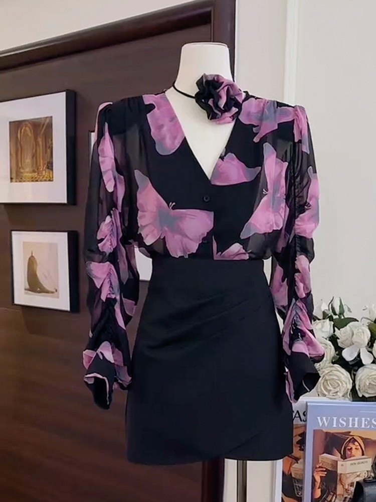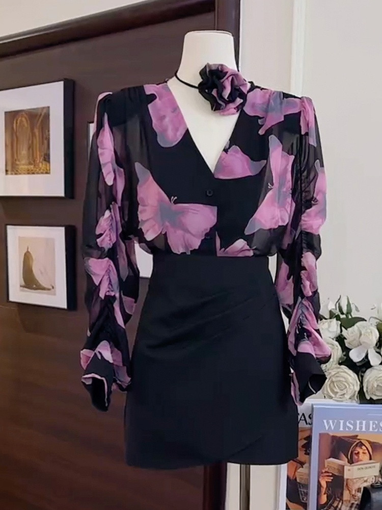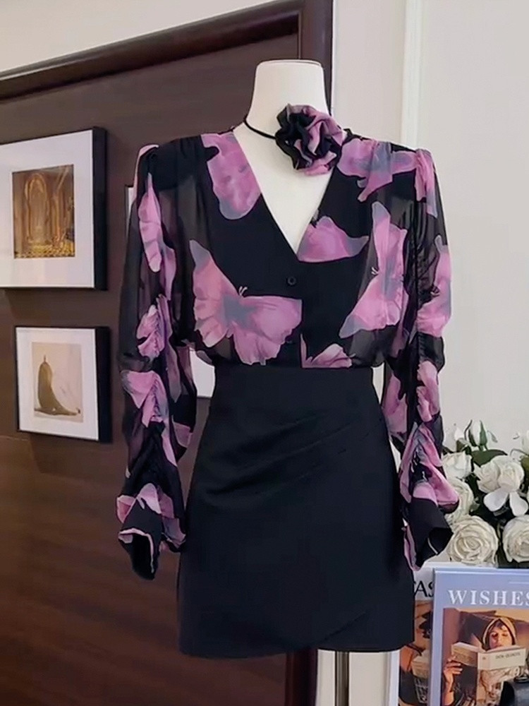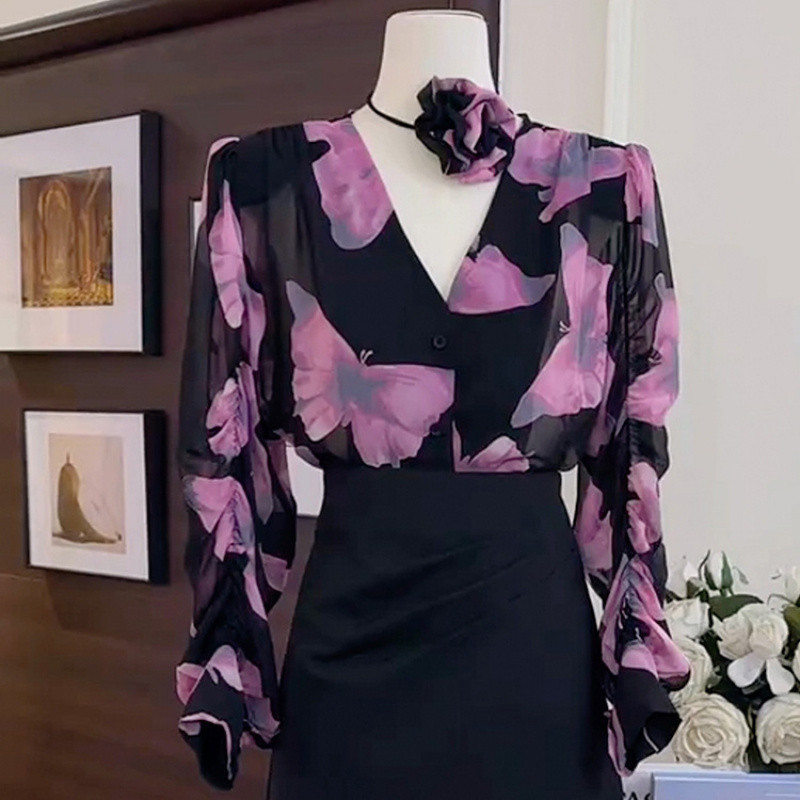 A6C 디자인 센스 니쉬 V-넥 프린트 셔츠 2024 봄과 여름 새로운 여성의 프랑스 스타일 세련된 팬티 탑스토어 가기