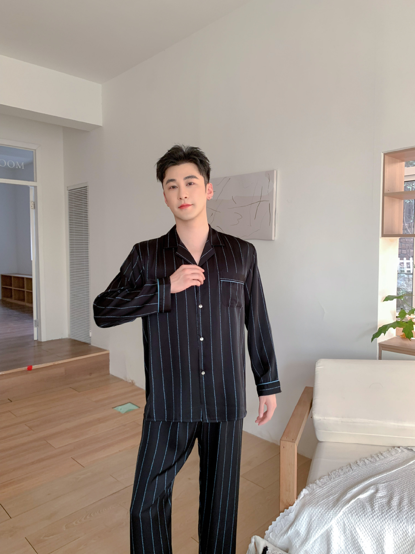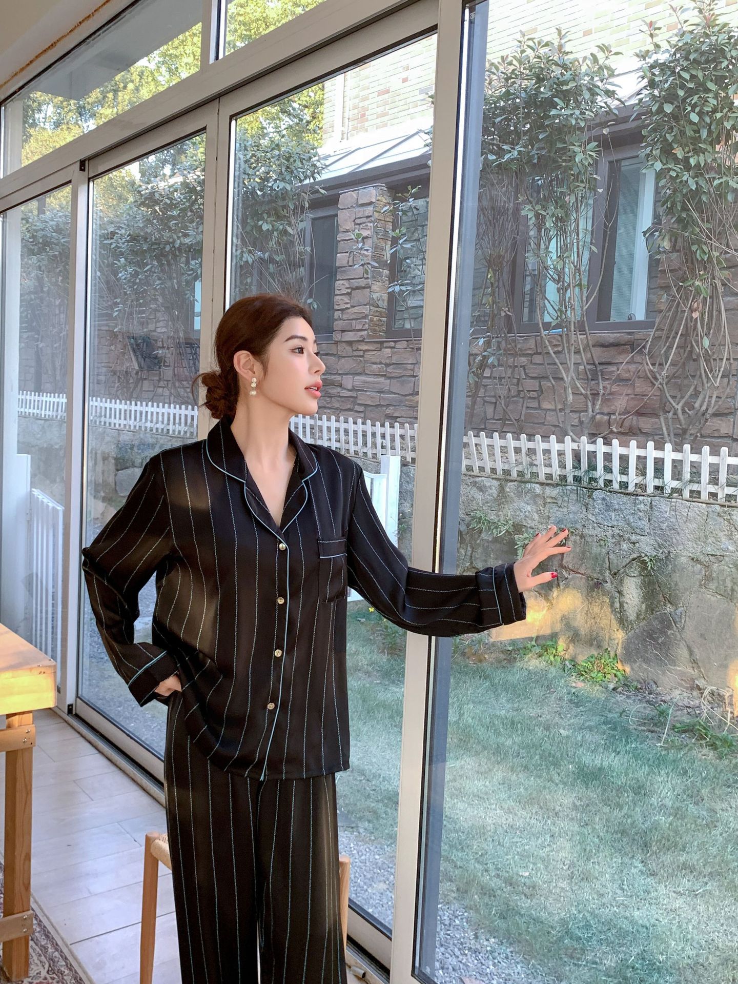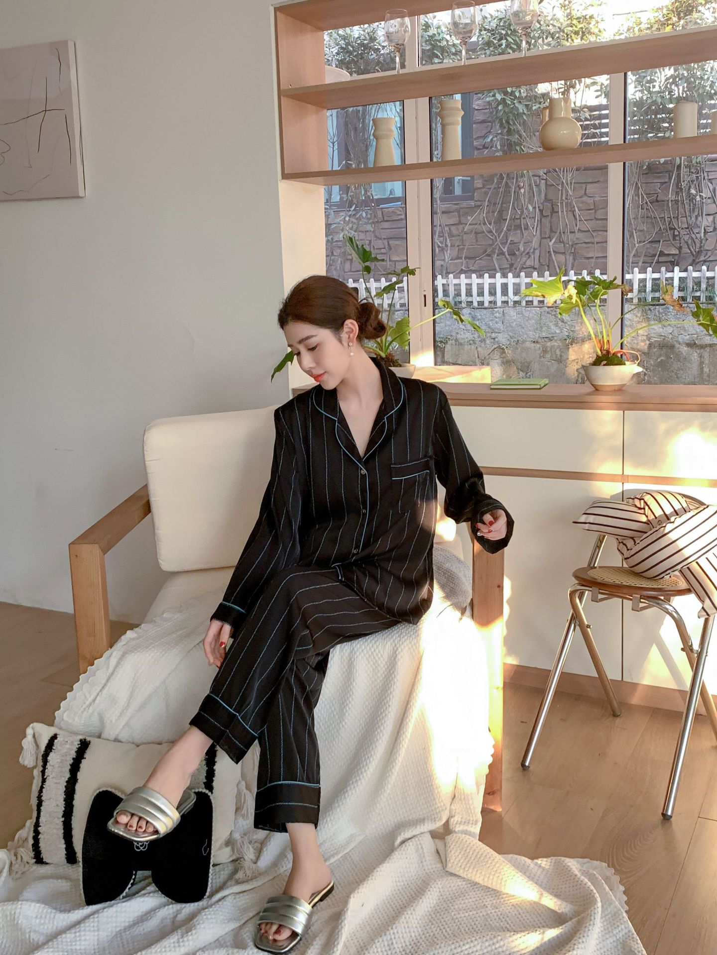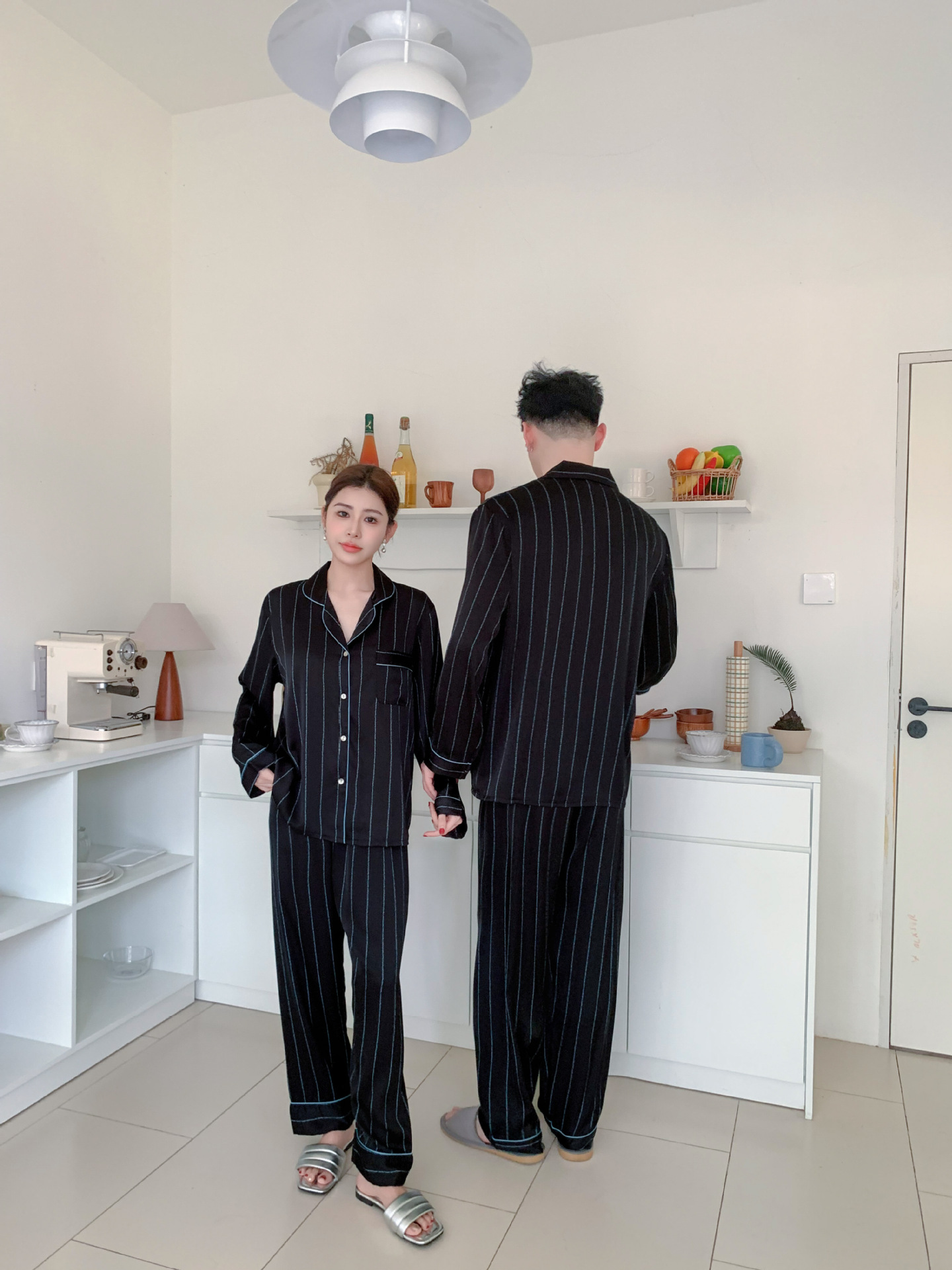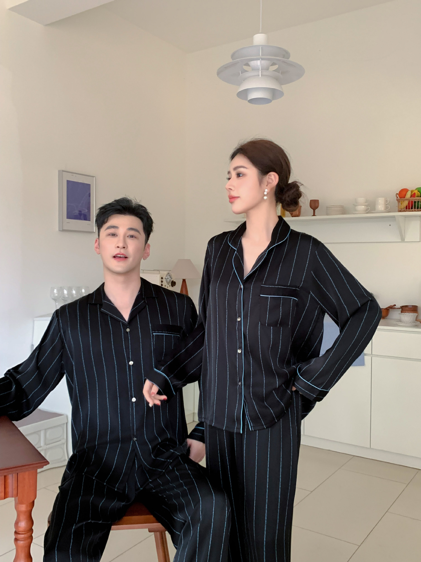 2026년 신상 아이스 실크 커플 스트라이프 블루 라펠 얇은 스타일 외출 가능 남성 고급 캐주얼 여성 홈웨어 세트스토어 가기