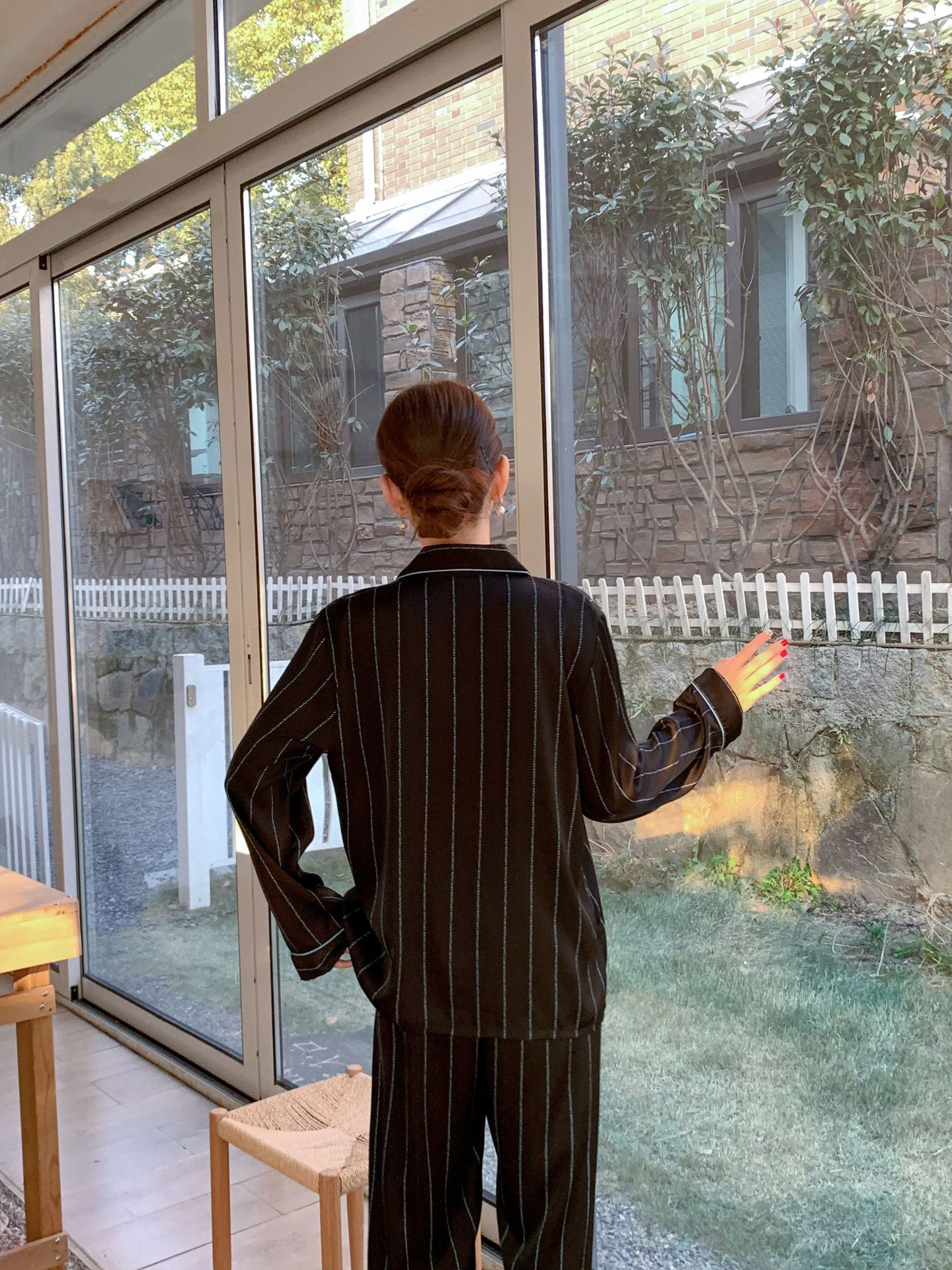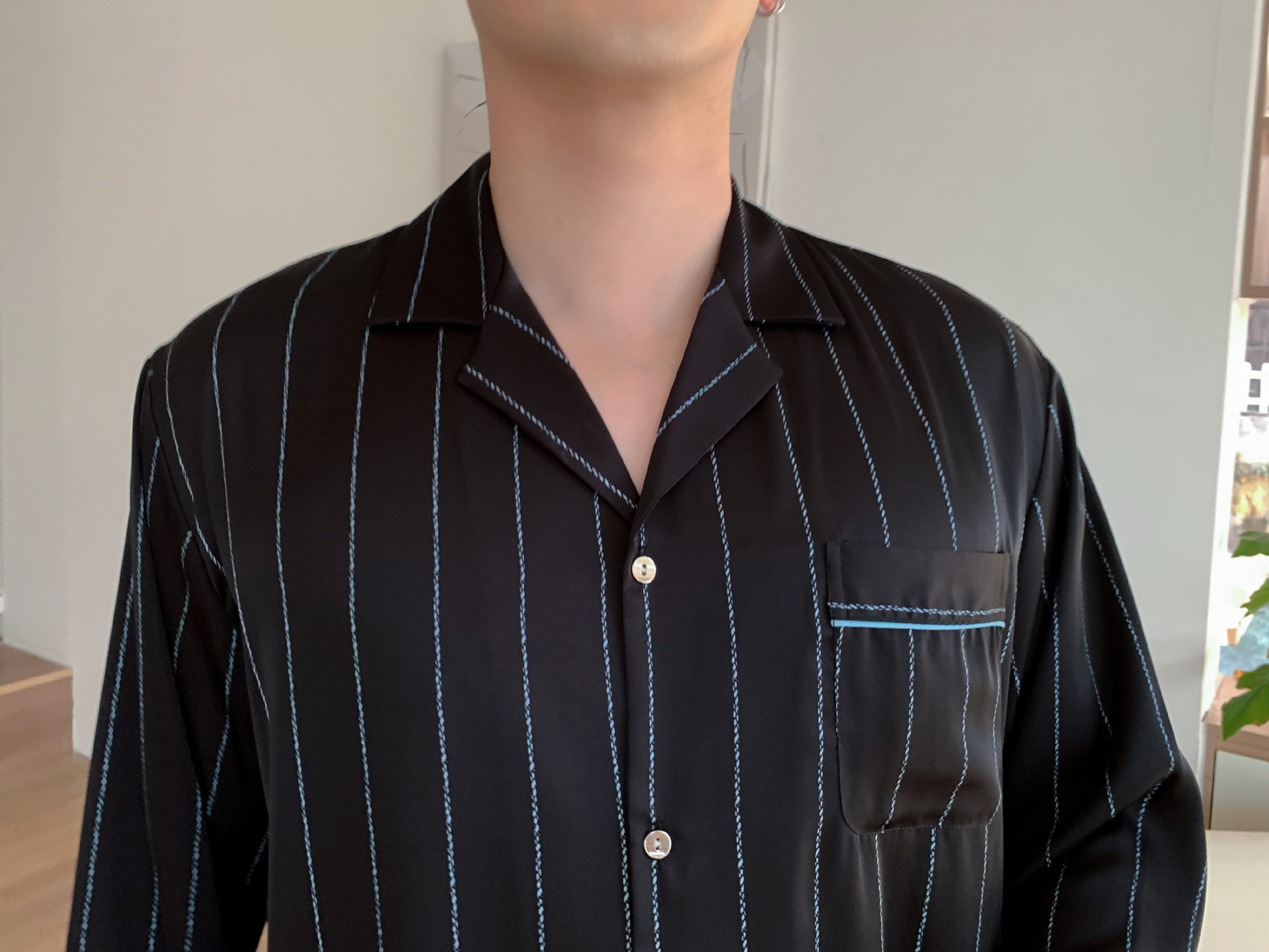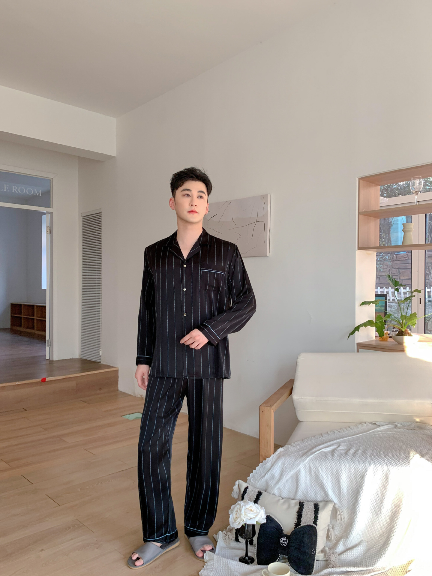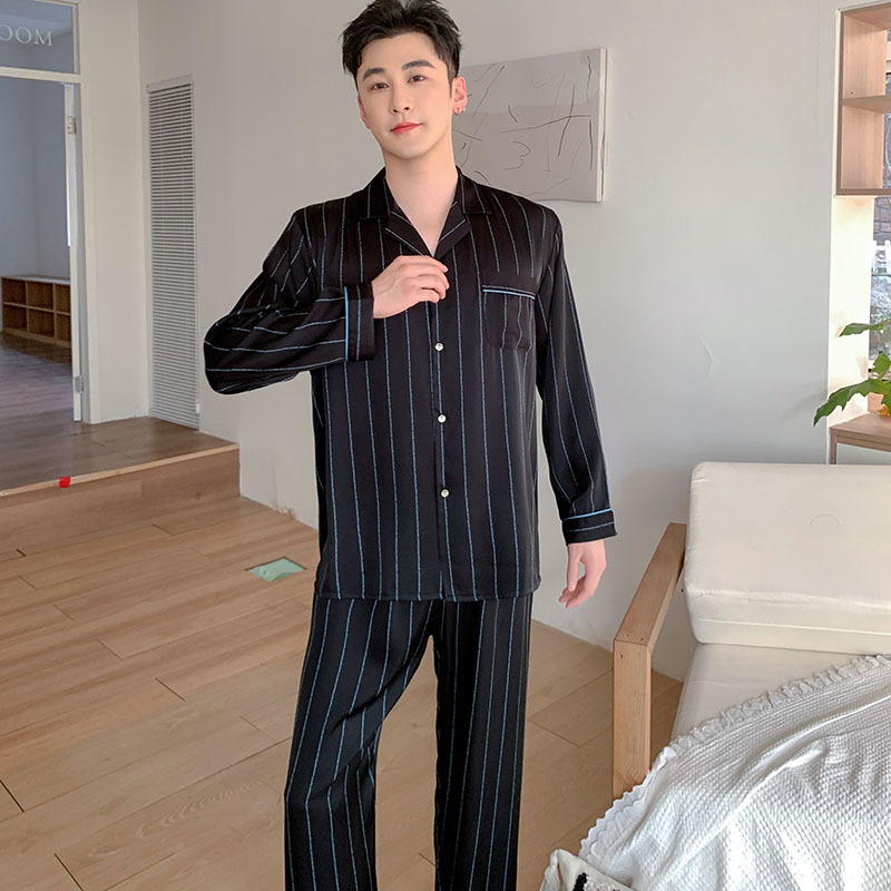 2026년 신상 아이스 실크 커플 스트라이프 블루 라펠 얇은 스타일 외출 가능 남성 고급 캐주얼 여성 홈웨어 세트스토어 가기
