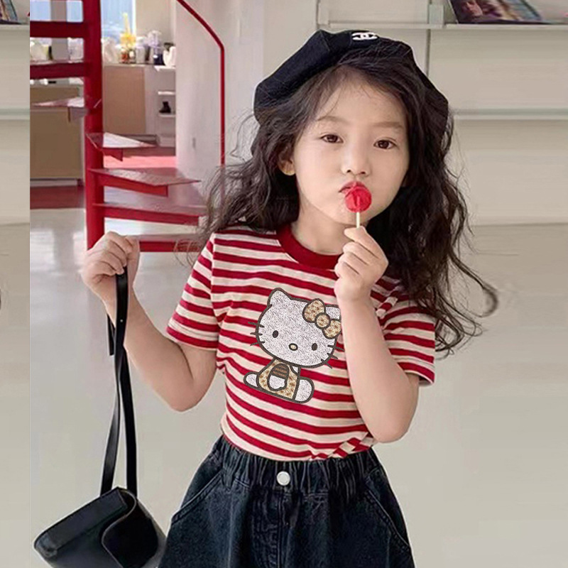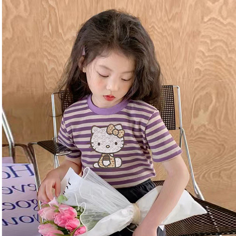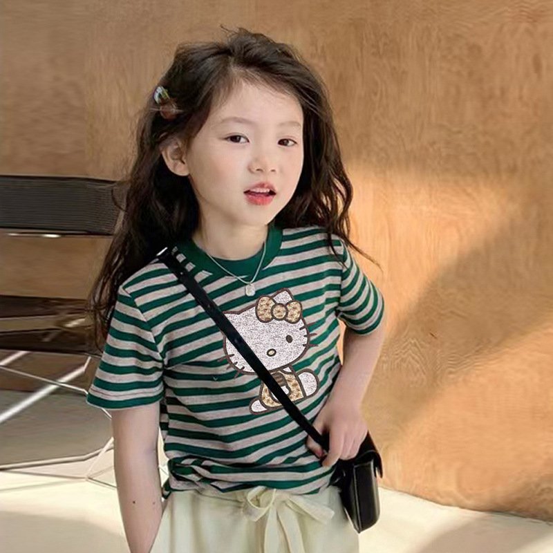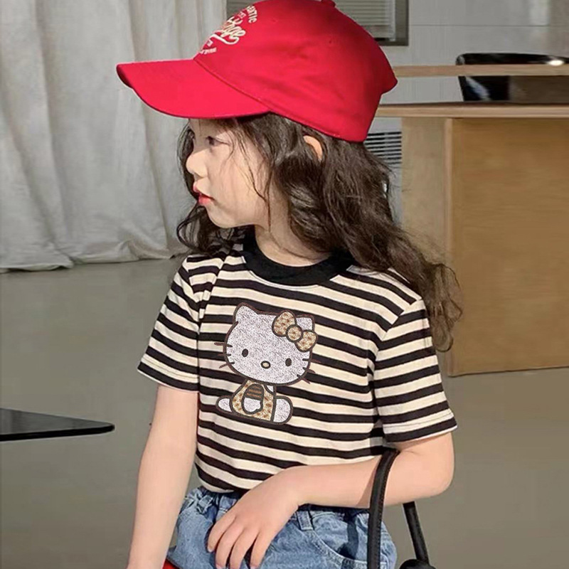 국경 간 소녀의 만화 키티 고양이 줄무늬 반팔 탑 코튼 여름 원피스 소녀의 얇은 티셔츠 아동베이스 셔츠스토어 가기