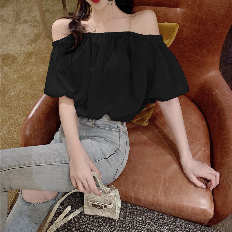 여름 새로운 섹시한 오프 숄더 칼라 버블 슬리브 슬링 셔츠 여성 느슨한 짧은 기질 탑 트렌디 도매스토어 가기