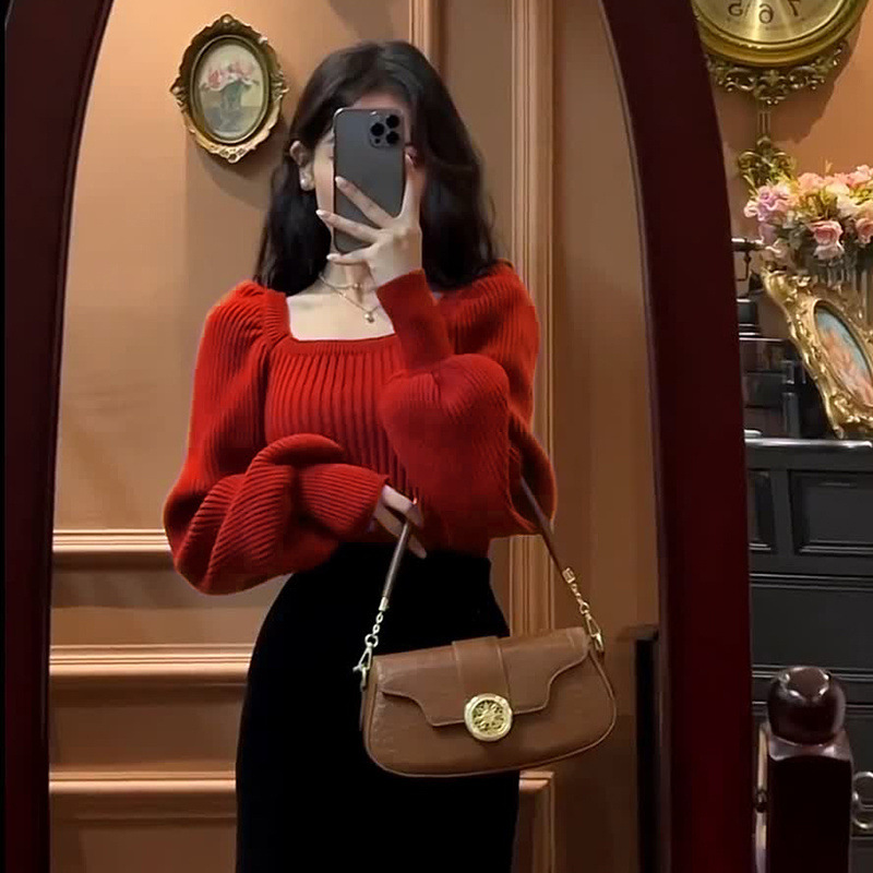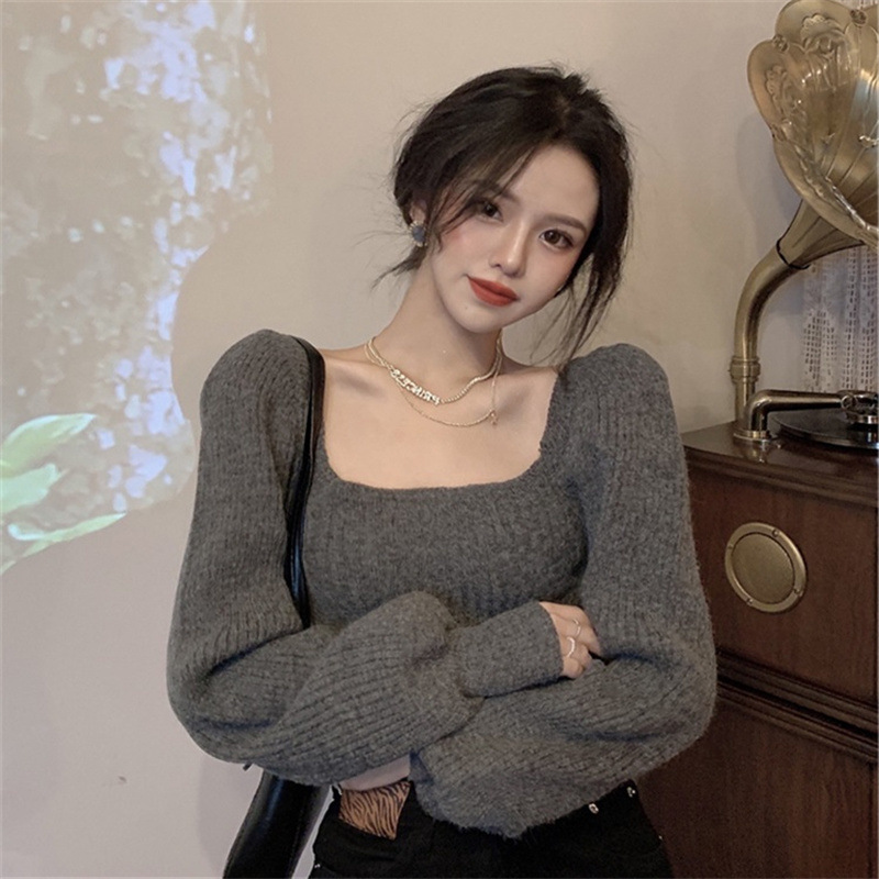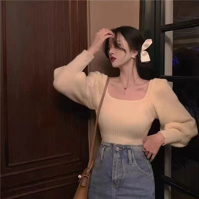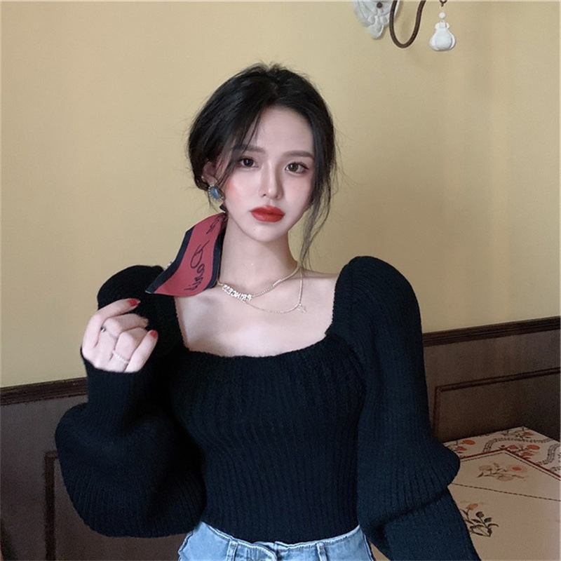 한국 스타일 부드러운 스퀘어 칼라 니트 웨스턴 스타일 탑 여성의 봄과 가을 새로운 스타일 랜턴 슬리브 세련된 아름다운베이스 셔츠 스웨터스토어 가기