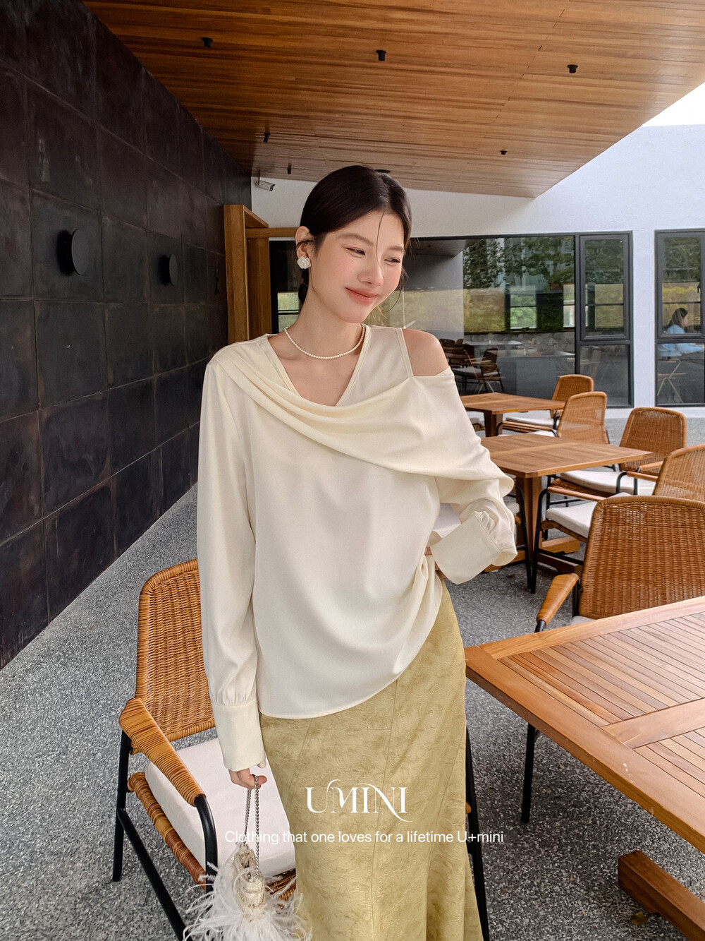 U 미니 13 라인 7039 새로운 봄 새로운 프랑스 스타일 실키 광택 어깨 소매 디자인 V-넥 셔츠 탑