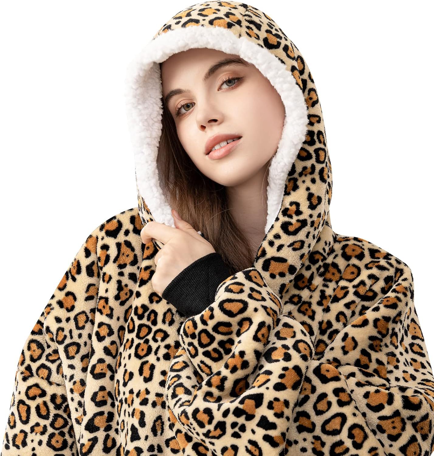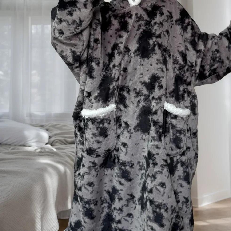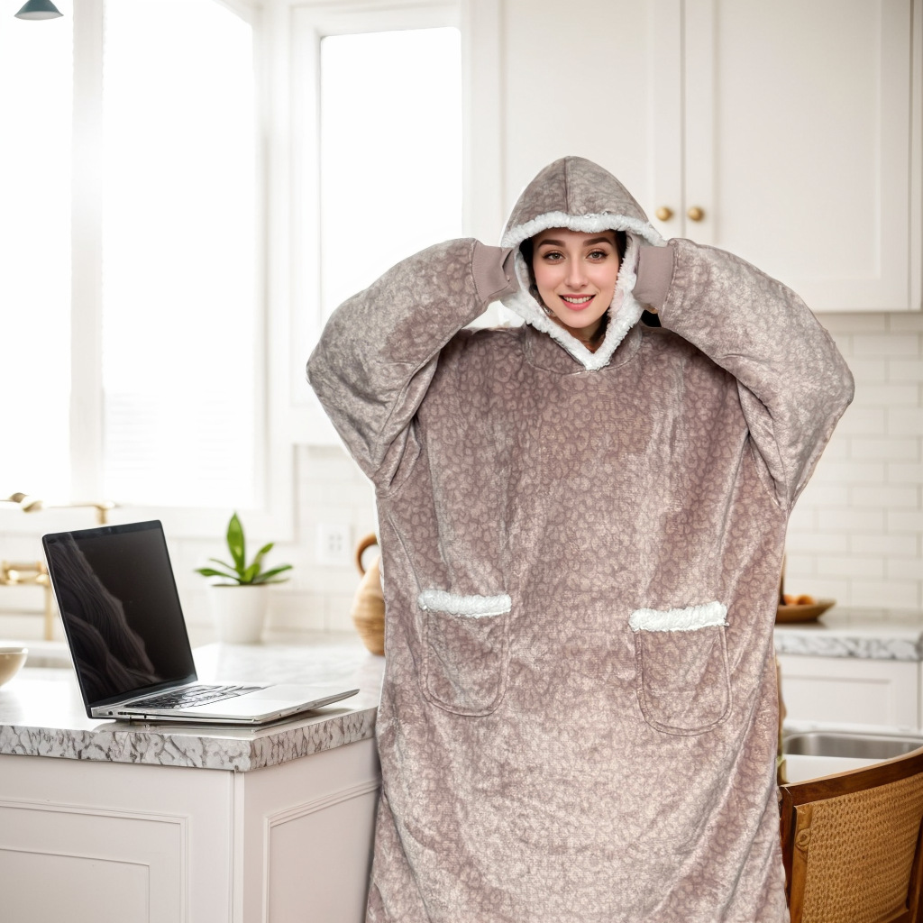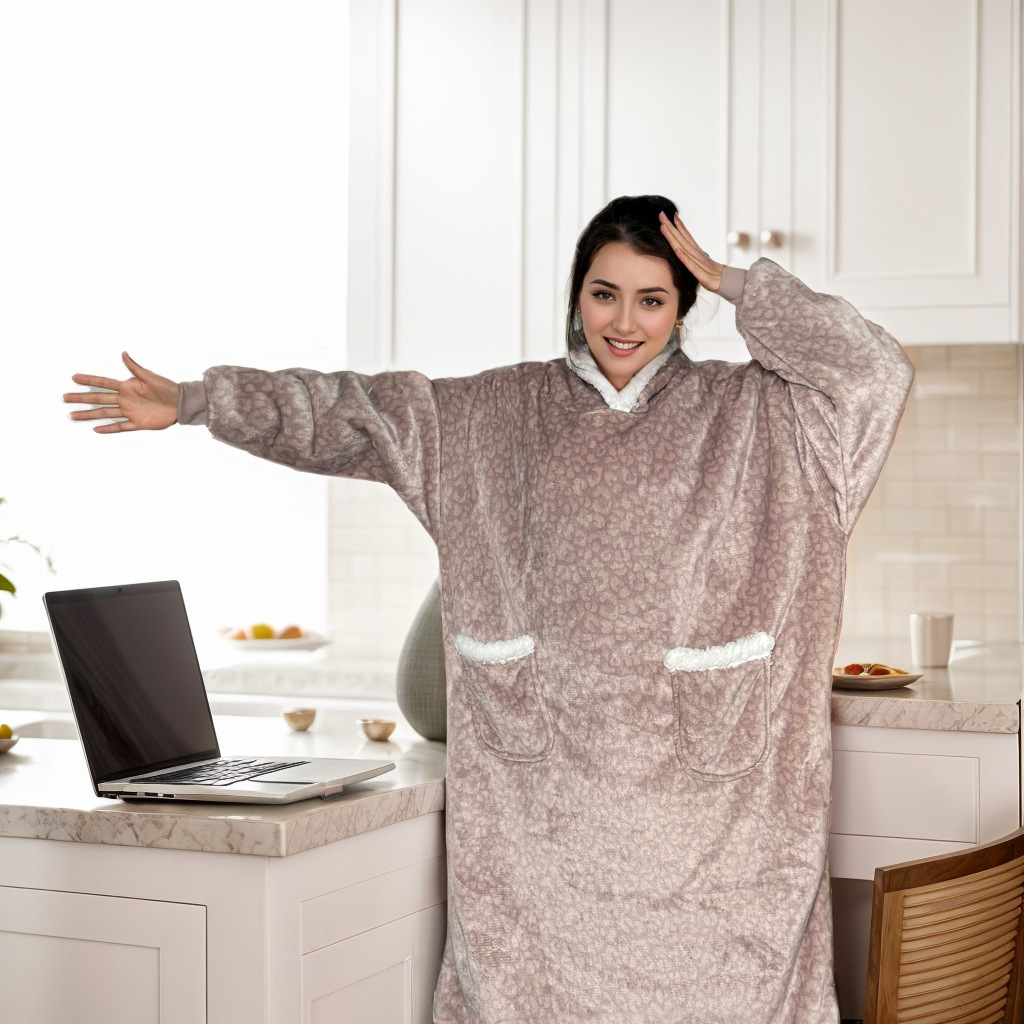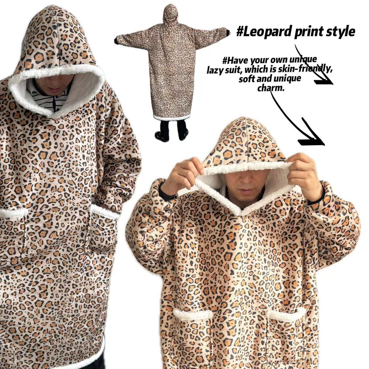 후드티 잠옷 겨울용 레오파드 프린트 사이드 포켓 담요 플란넬 양털 담요로도 활용 가능 홈웨어 크리스마스 잠옷