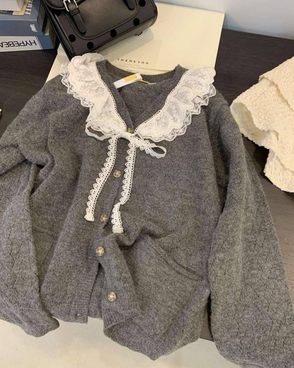 인형 칼라 스웨터 여성의 봄 게으른 귀여운 달콤한 레이스 칼라 니트 카디건 재킷 일본 스타일 젠틀 탑