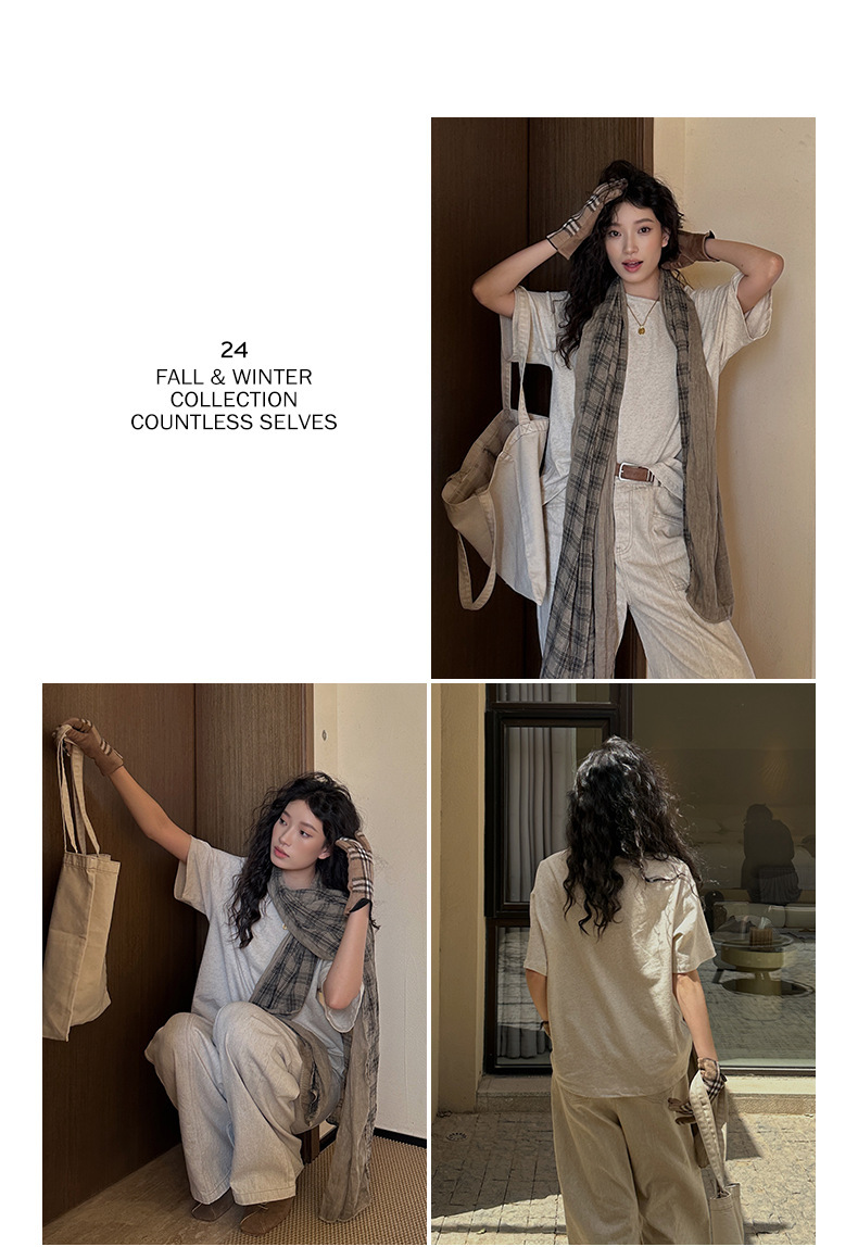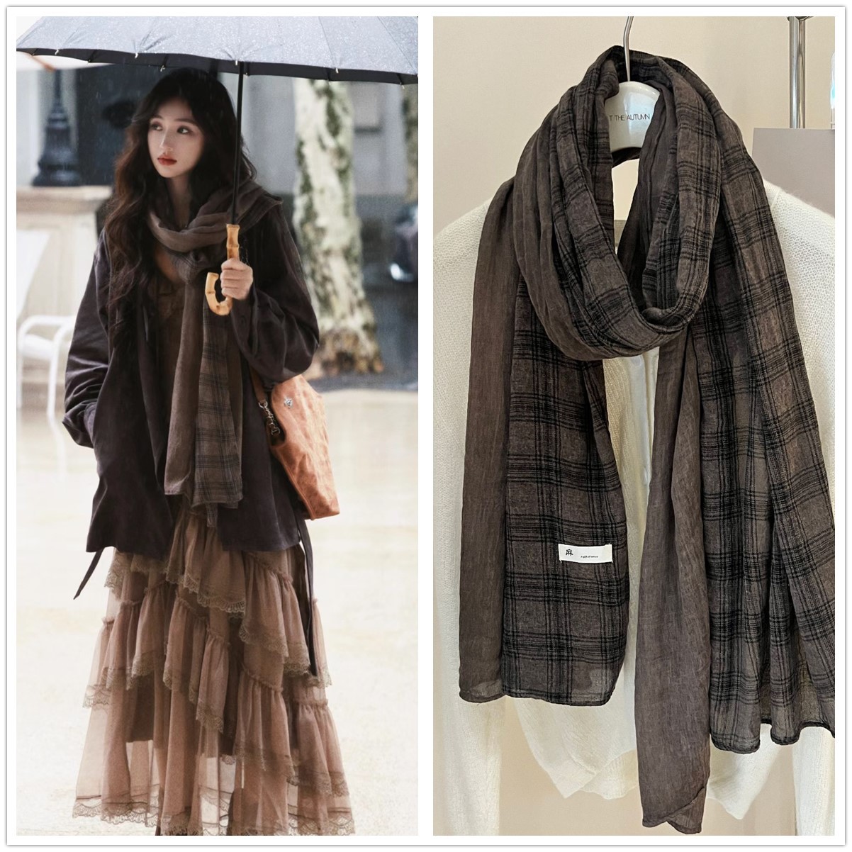 가을과 겨울 예술 레트로 다재다능한 격자 무늬 리넨 스카프 여성의 한국 스타일 분위기 단색 면 리넨 따뜻한 목도리스토어 가기