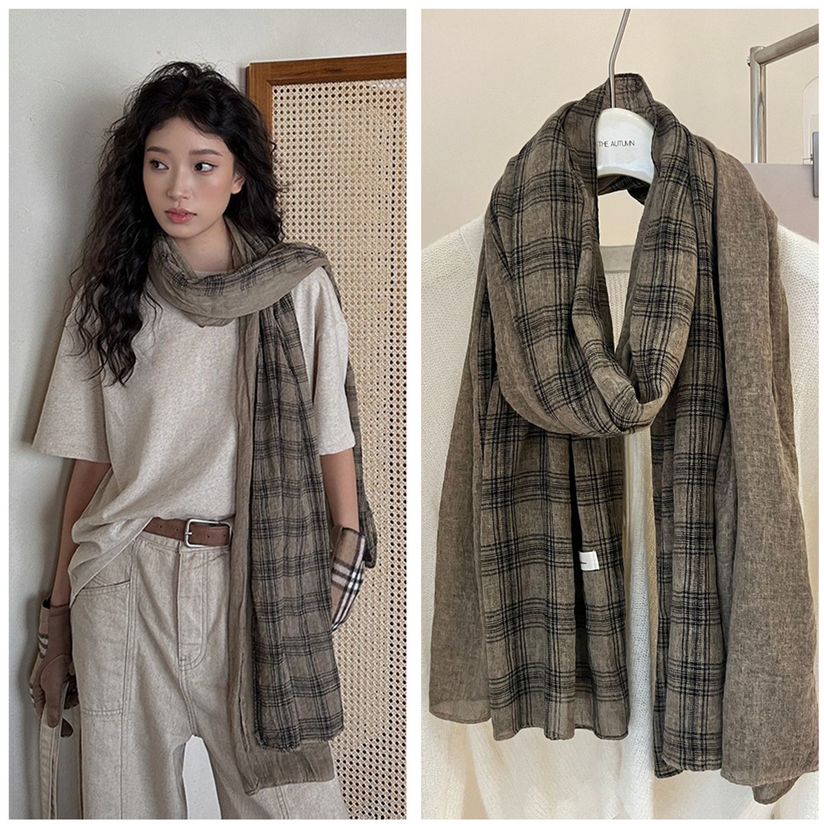 가을과 겨울 예술 레트로 다재다능한 격자 무늬 리넨 스카프 여성의 한국 스타일 분위기 단색 면 리넨 따뜻한 목도리