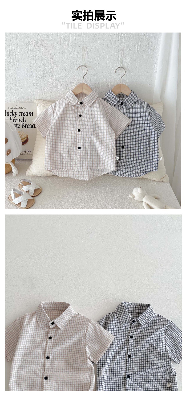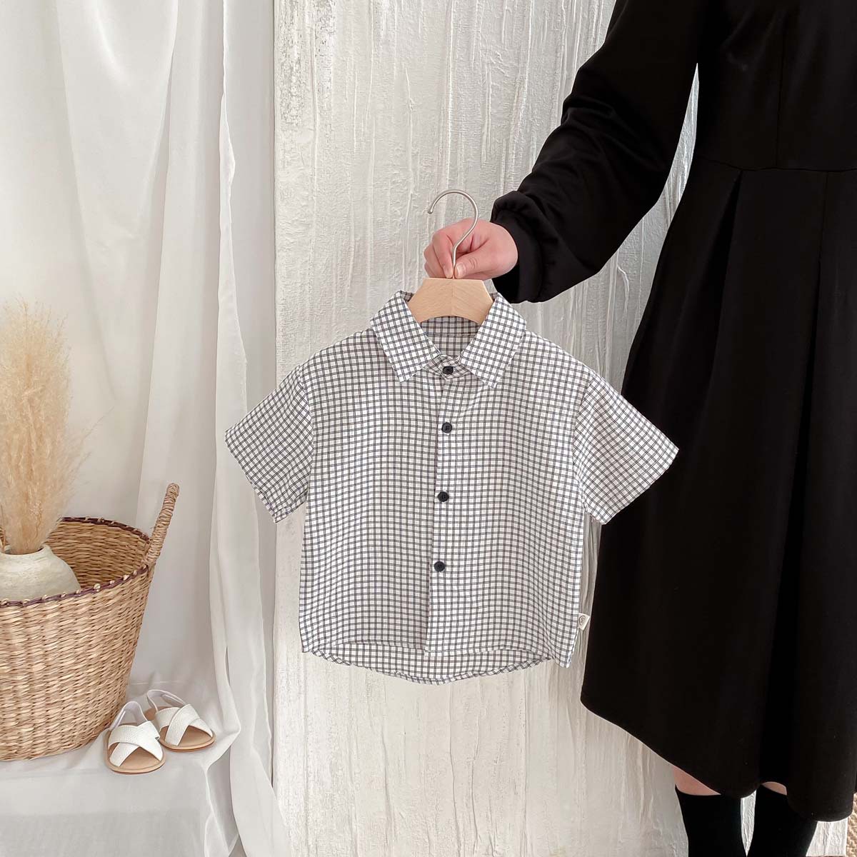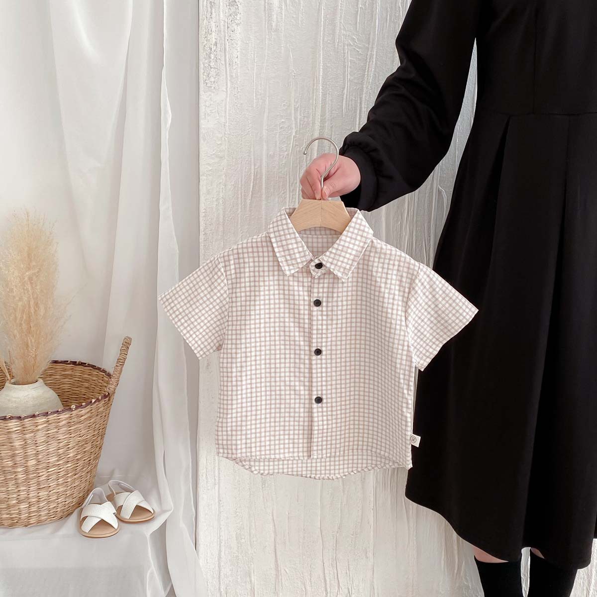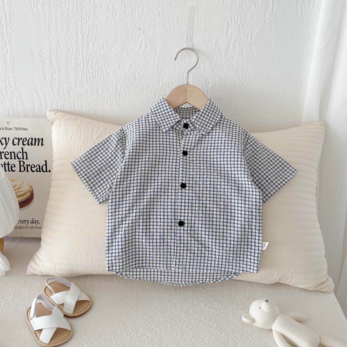 여름 여름 2025 소년 반팔 격자 무늬 셔츠 얇은 어린이 서양식 캐주얼 셔츠 어린이 마을 밖 유행 옷스토어 가기