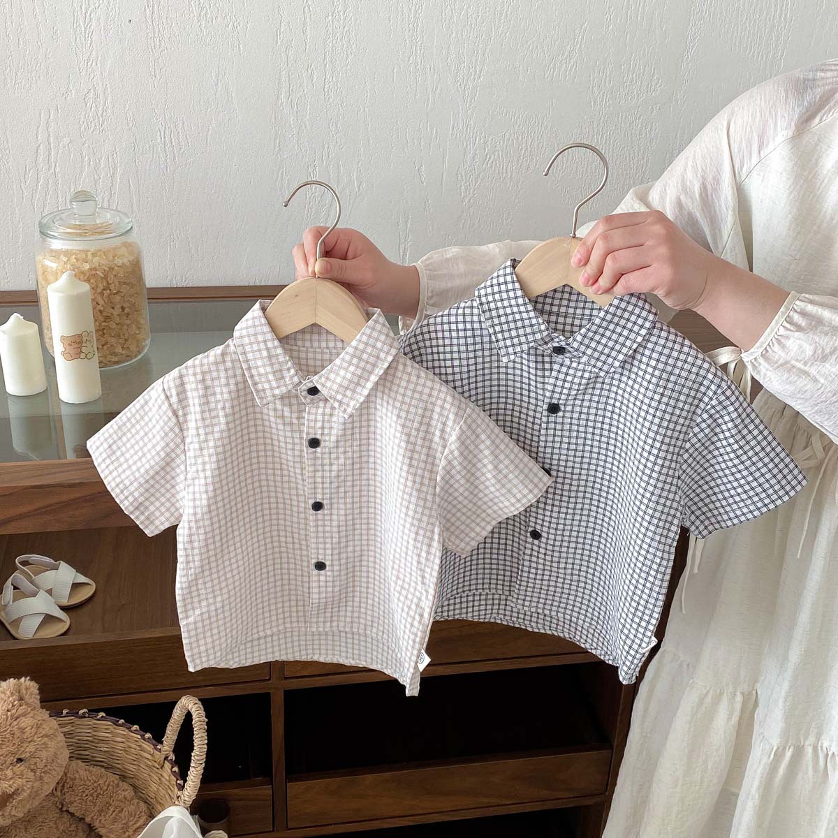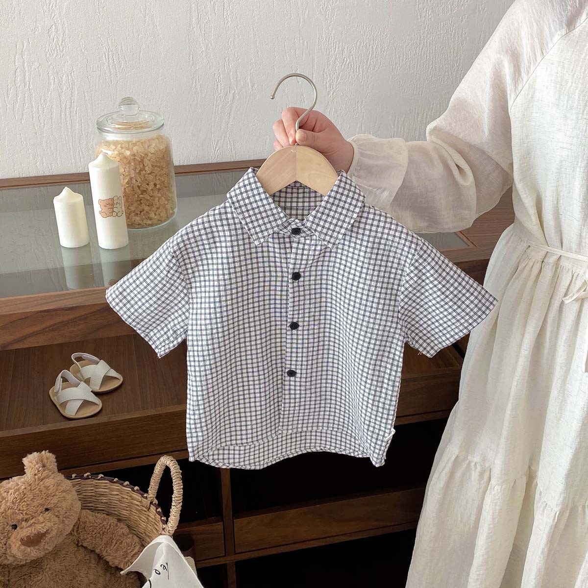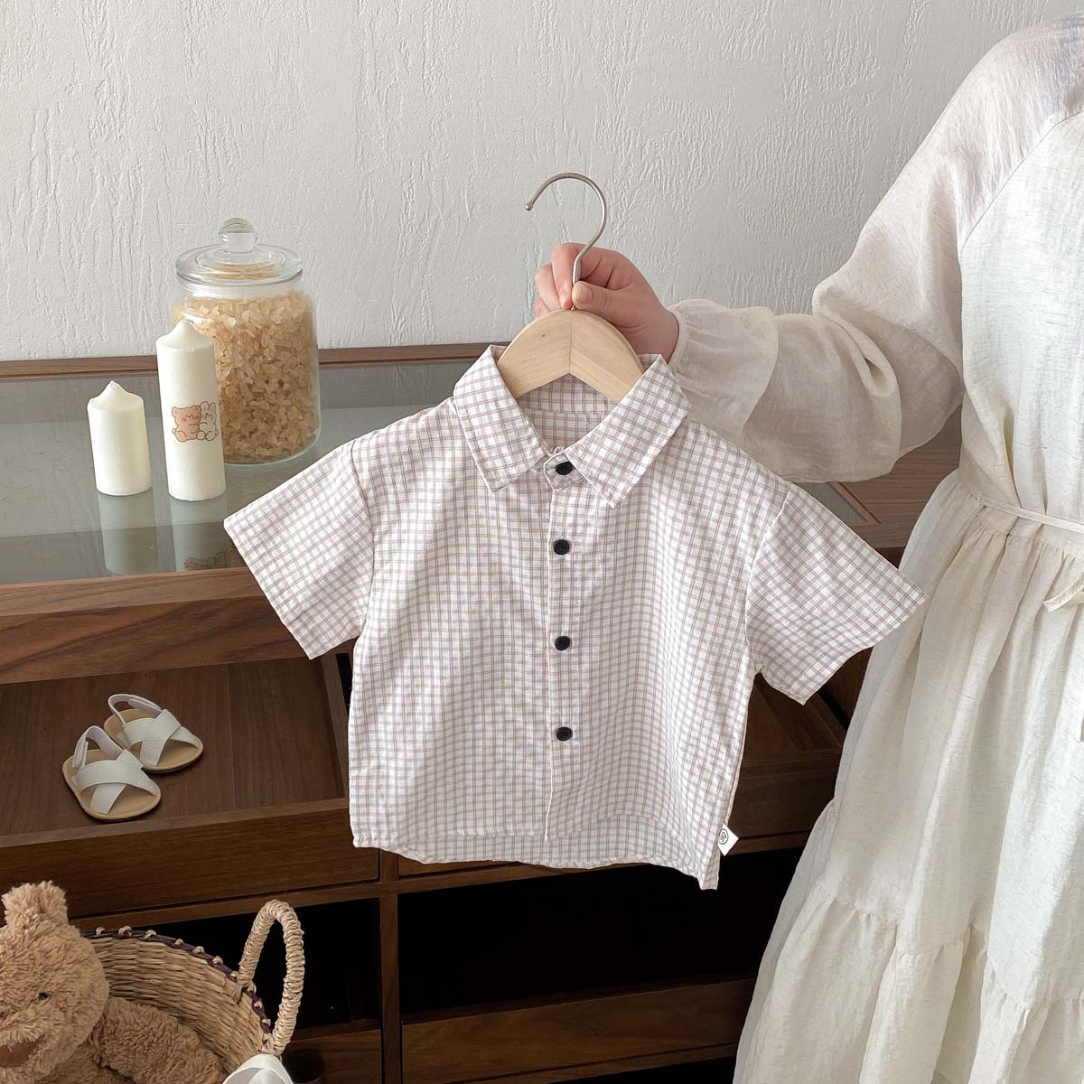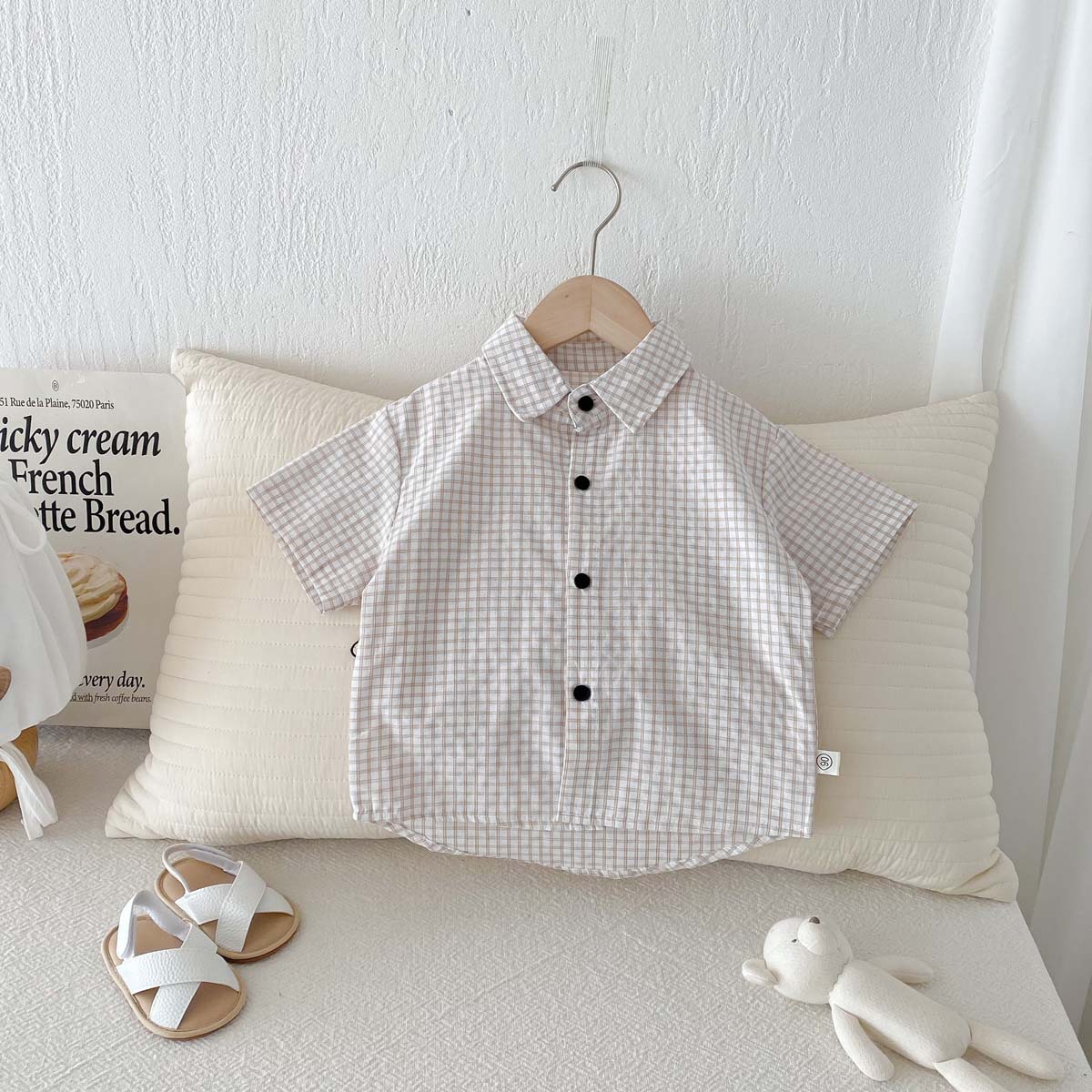 여름 여름 2025 소년 반팔 격자 무늬 셔츠 얇은 어린이 서양식 캐주얼 셔츠 어린이 마을 밖 유행 옷스토어 가기