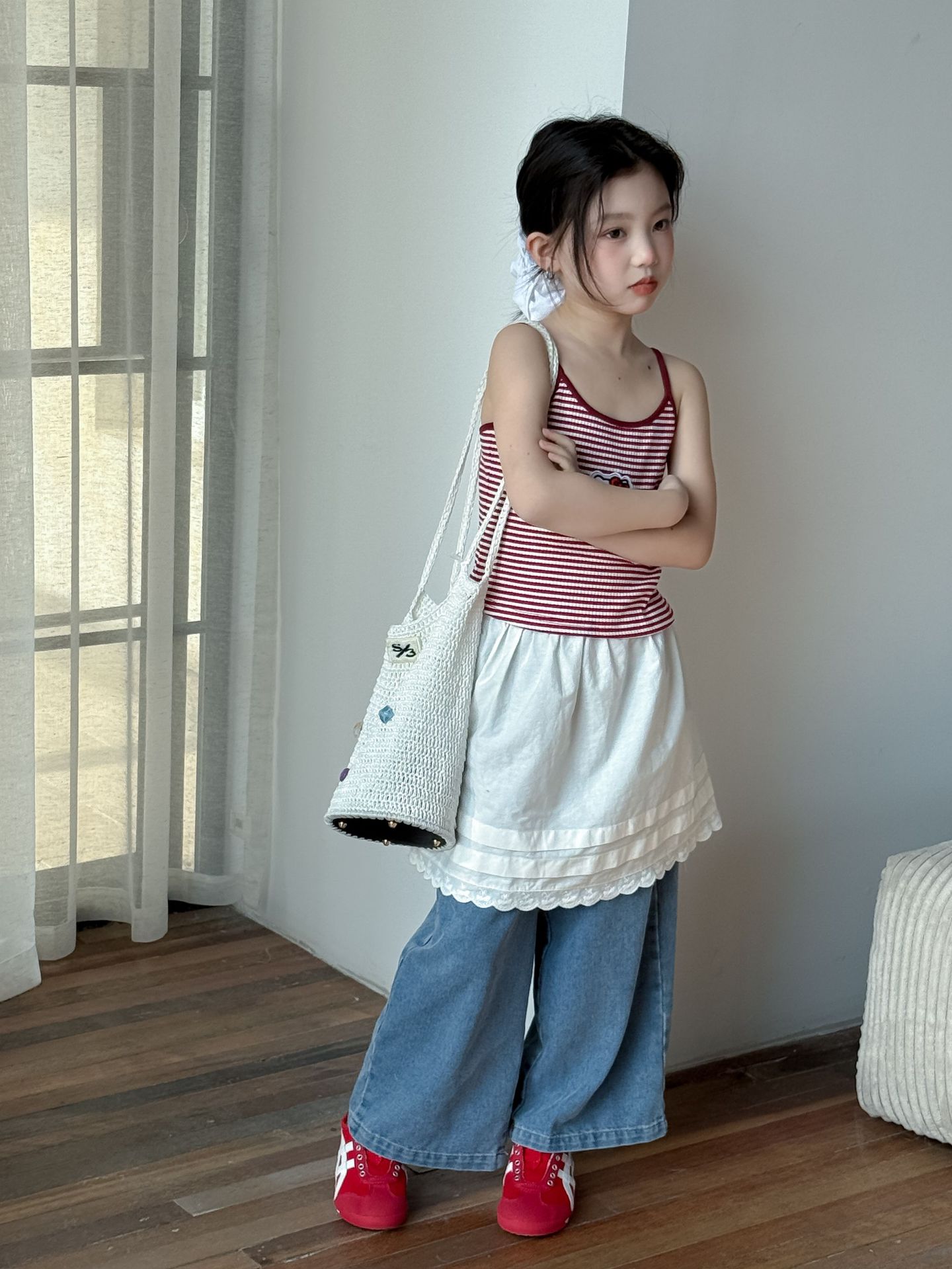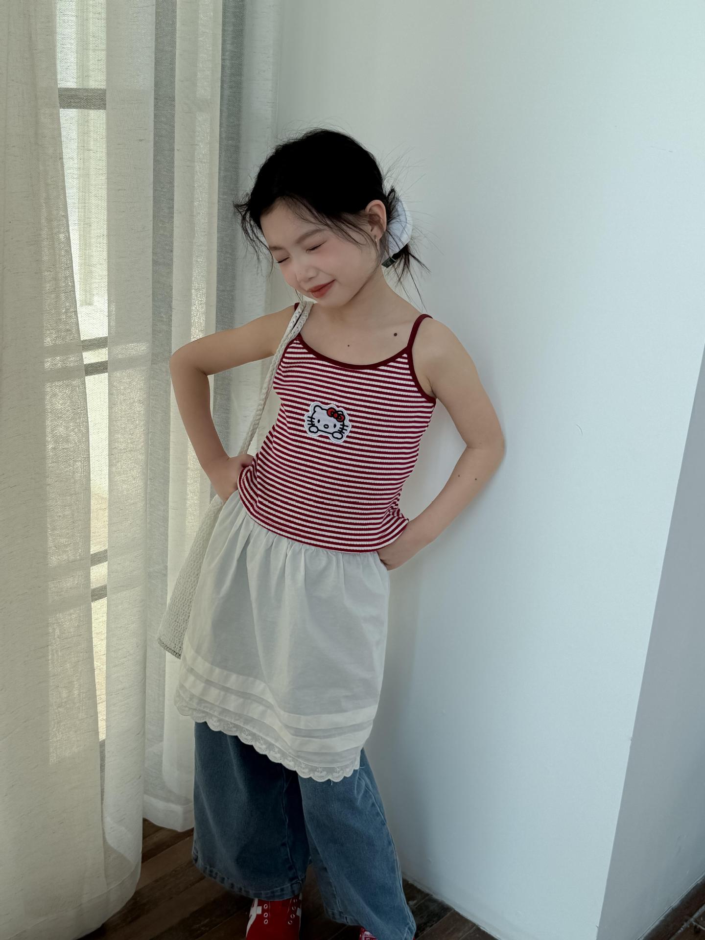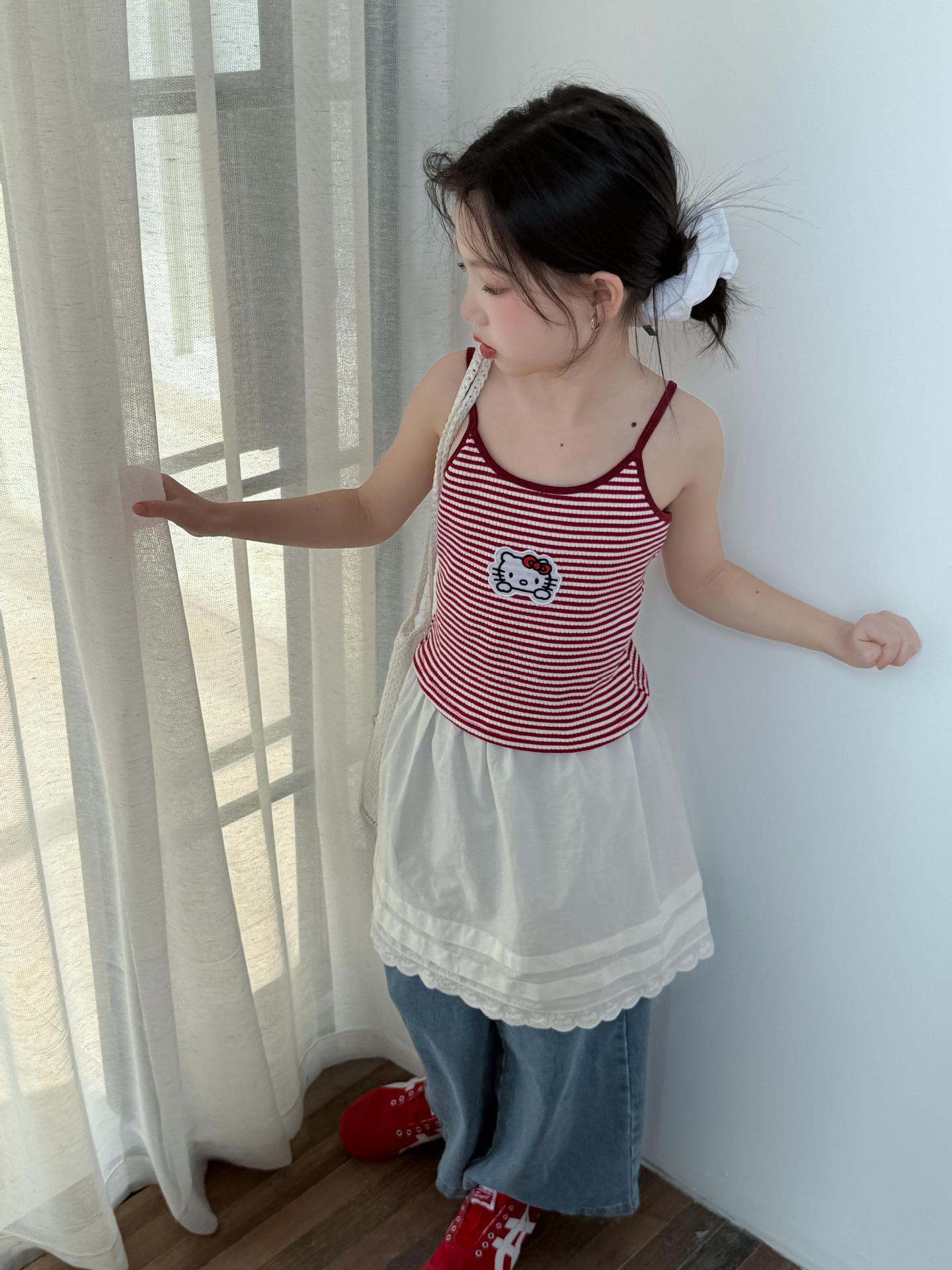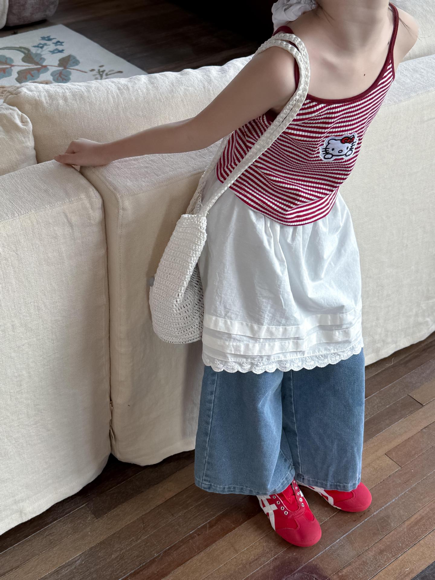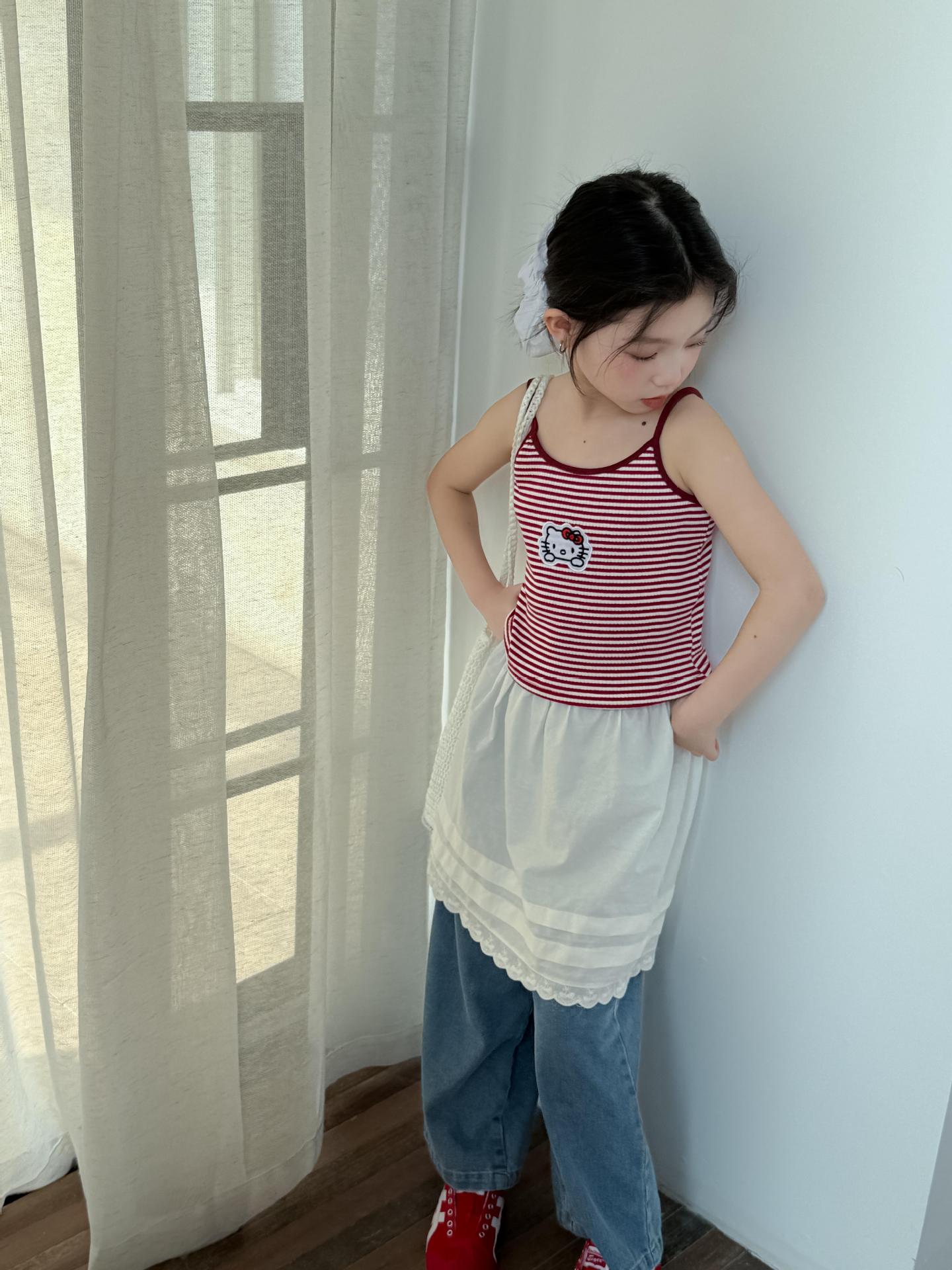 어린이 바지 2025 여름 새 소녀 레이스 앞치마 커튼 어린이 스택 스커트 청바지 세트 투피스 세트스토어 가기