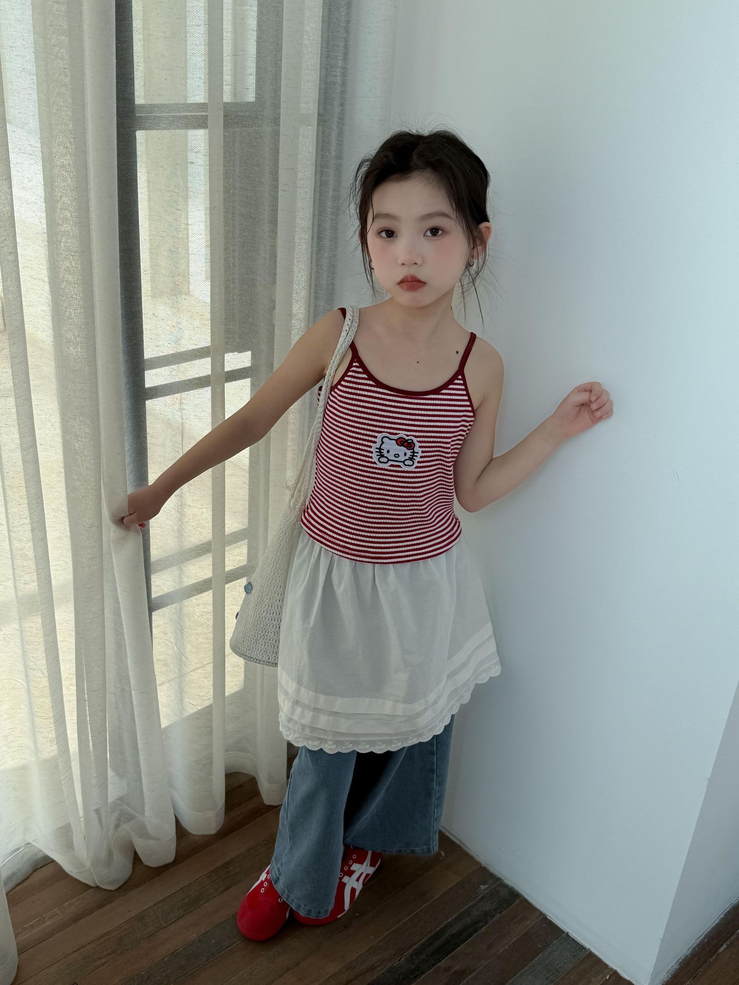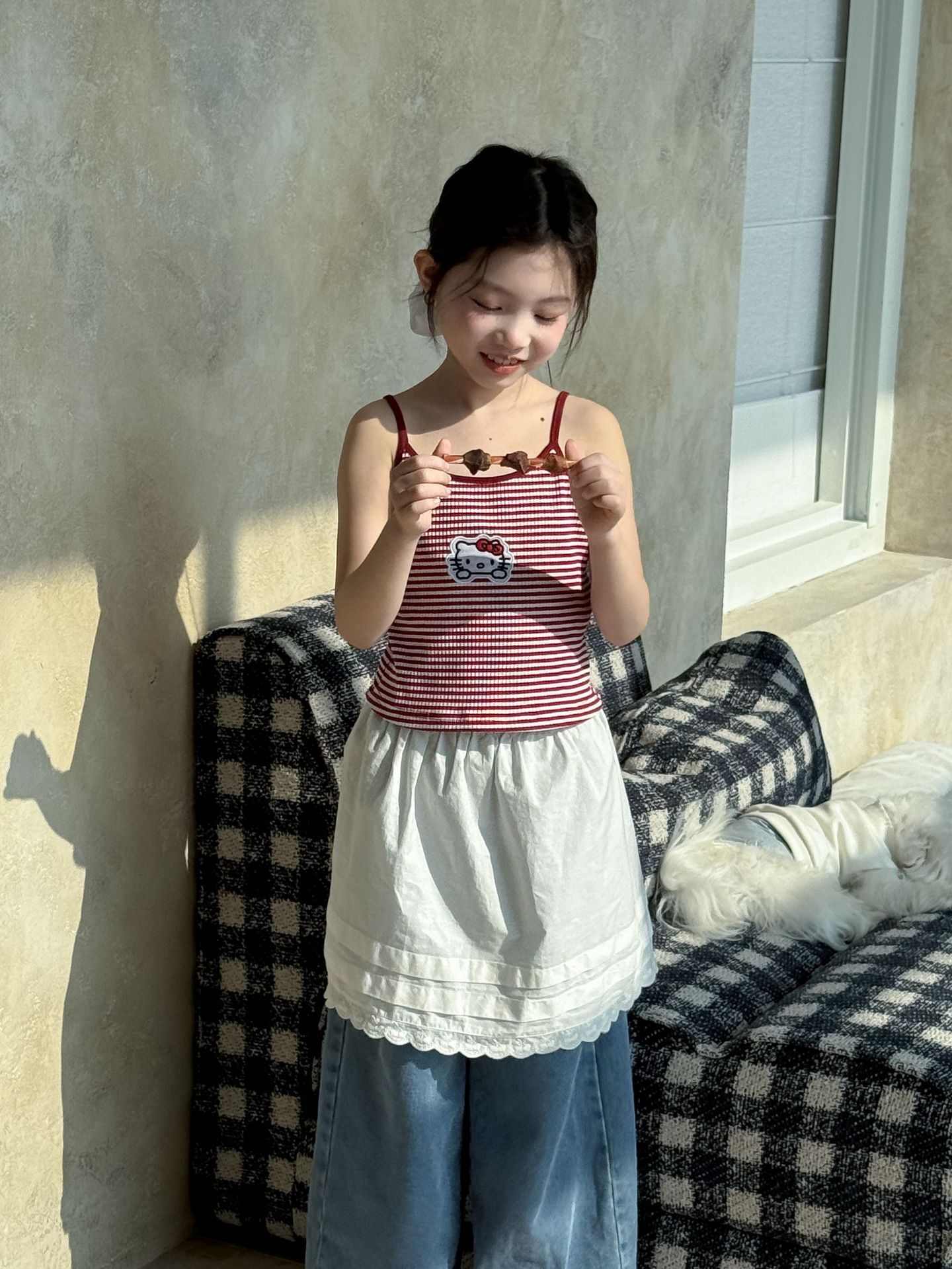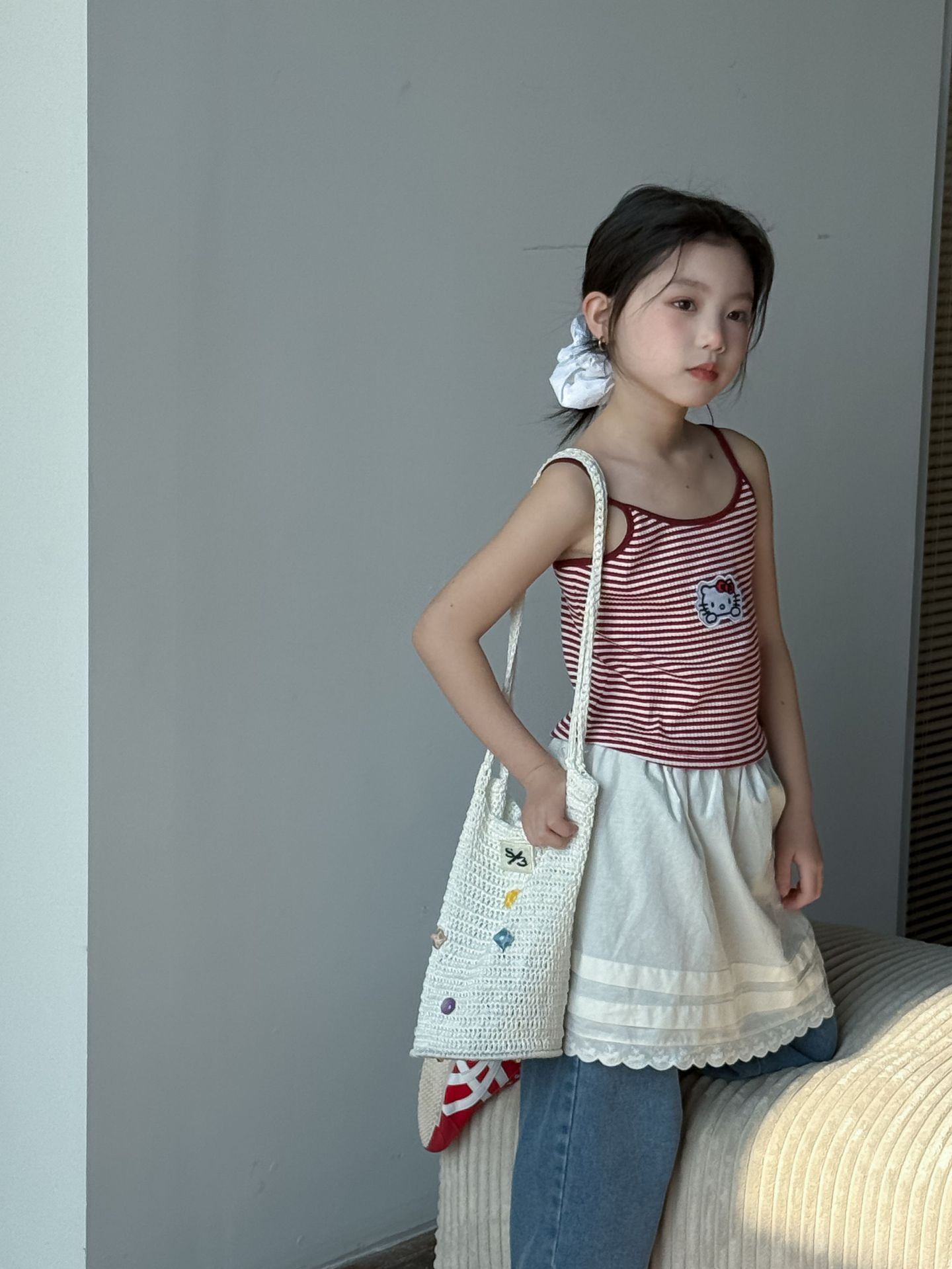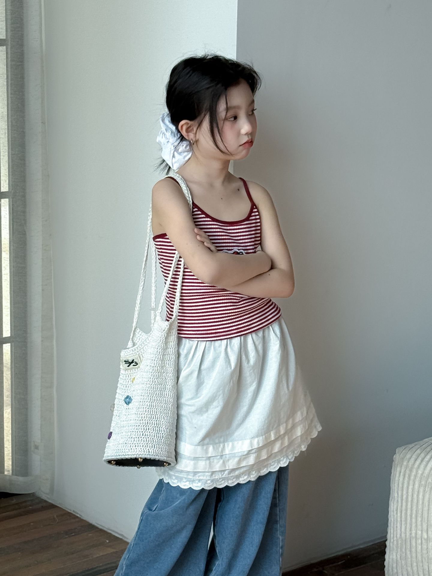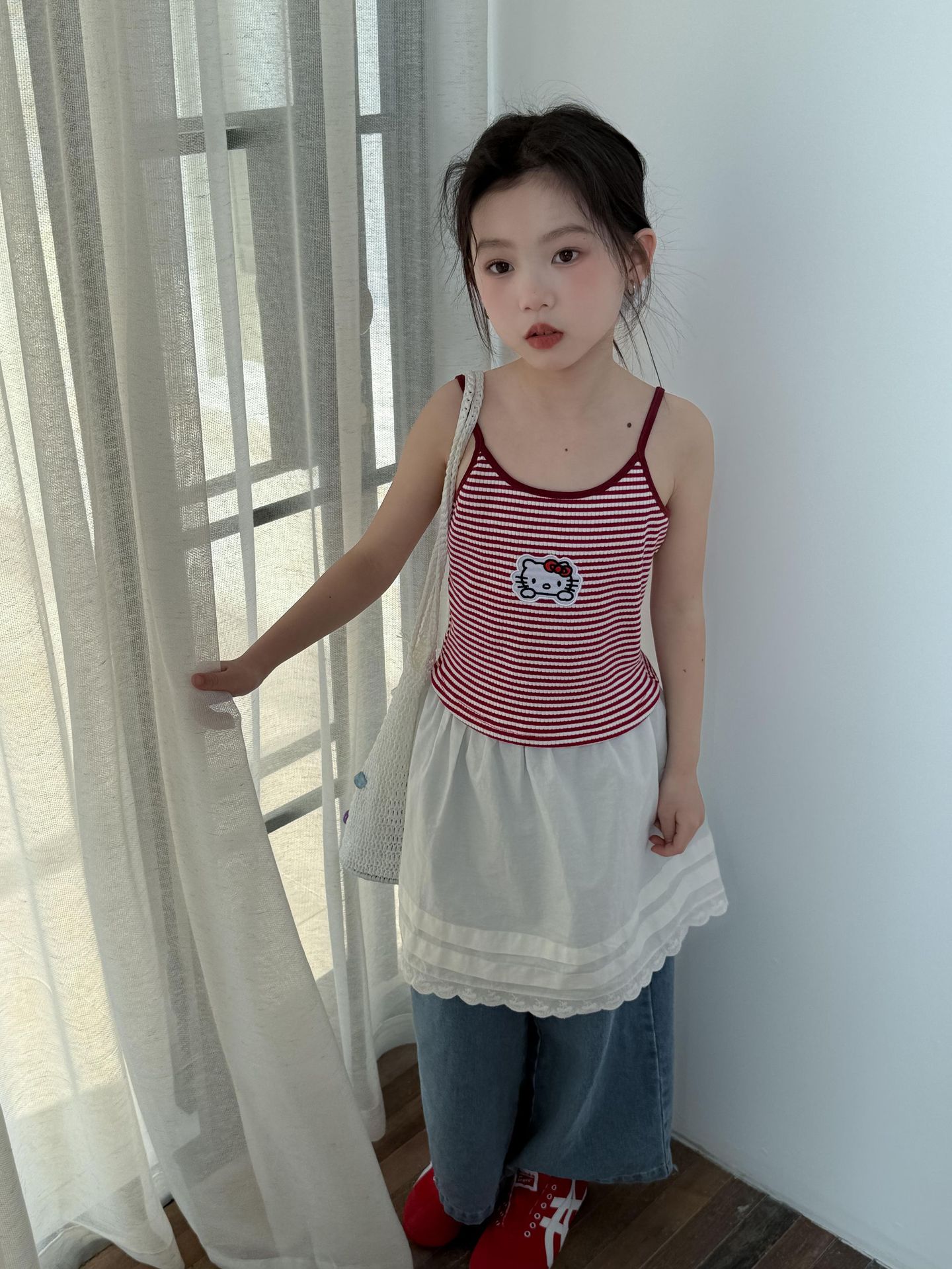 어린이 바지 2025 여름 새 소녀 레이스 앞치마 커튼 어린이 스택 스커트 청바지 세트 투피스 세트스토어 가기