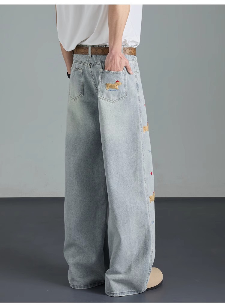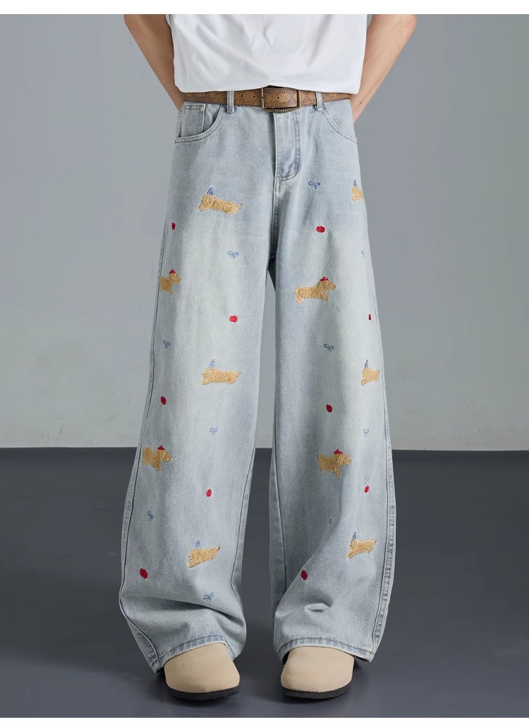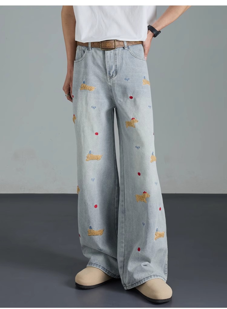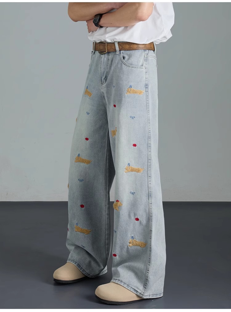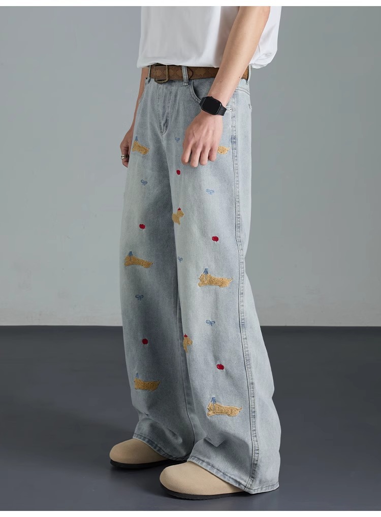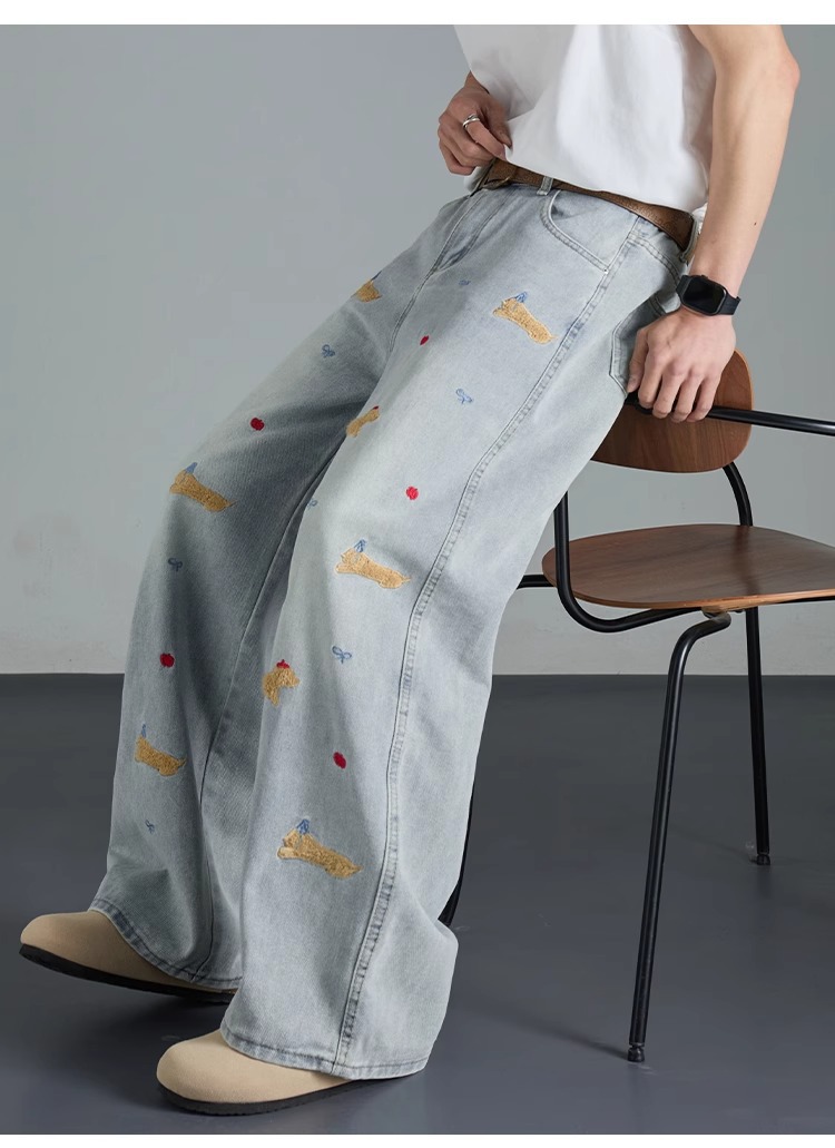 새로운 게으른 패션 미국 청바지 남성 닥스 훈트 개 자수 직선 다리 넓은 다리 바지 바지 우아한 하라주쿠 패션스토어 가기