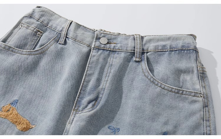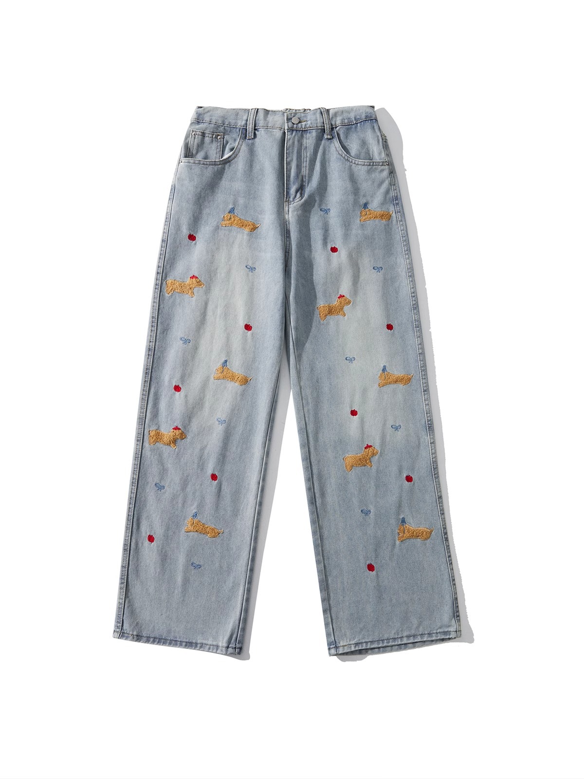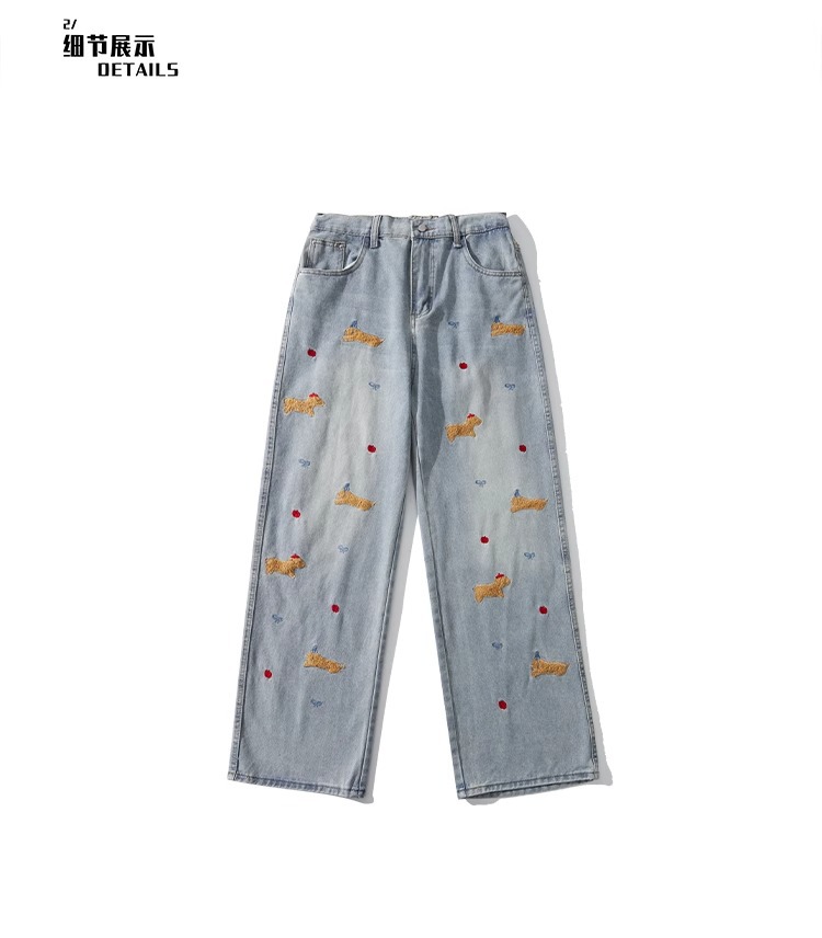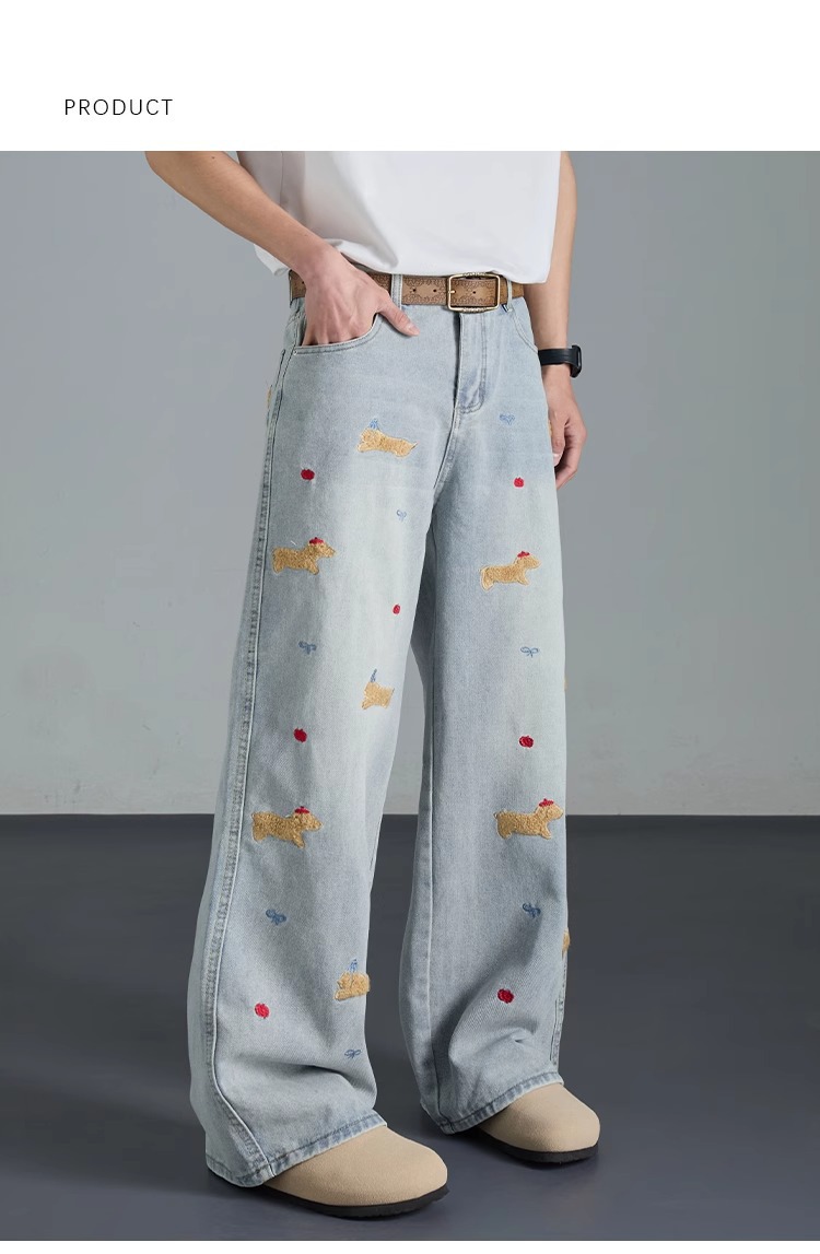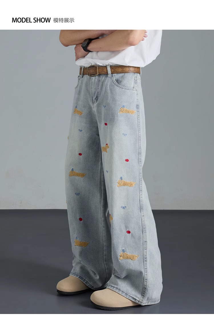 새로운 게으른 패션 미국 청바지 남성 닥스 훈트 개 자수 직선 다리 넓은 다리 바지 바지 우아한 하라주쿠 패션스토어 가기
