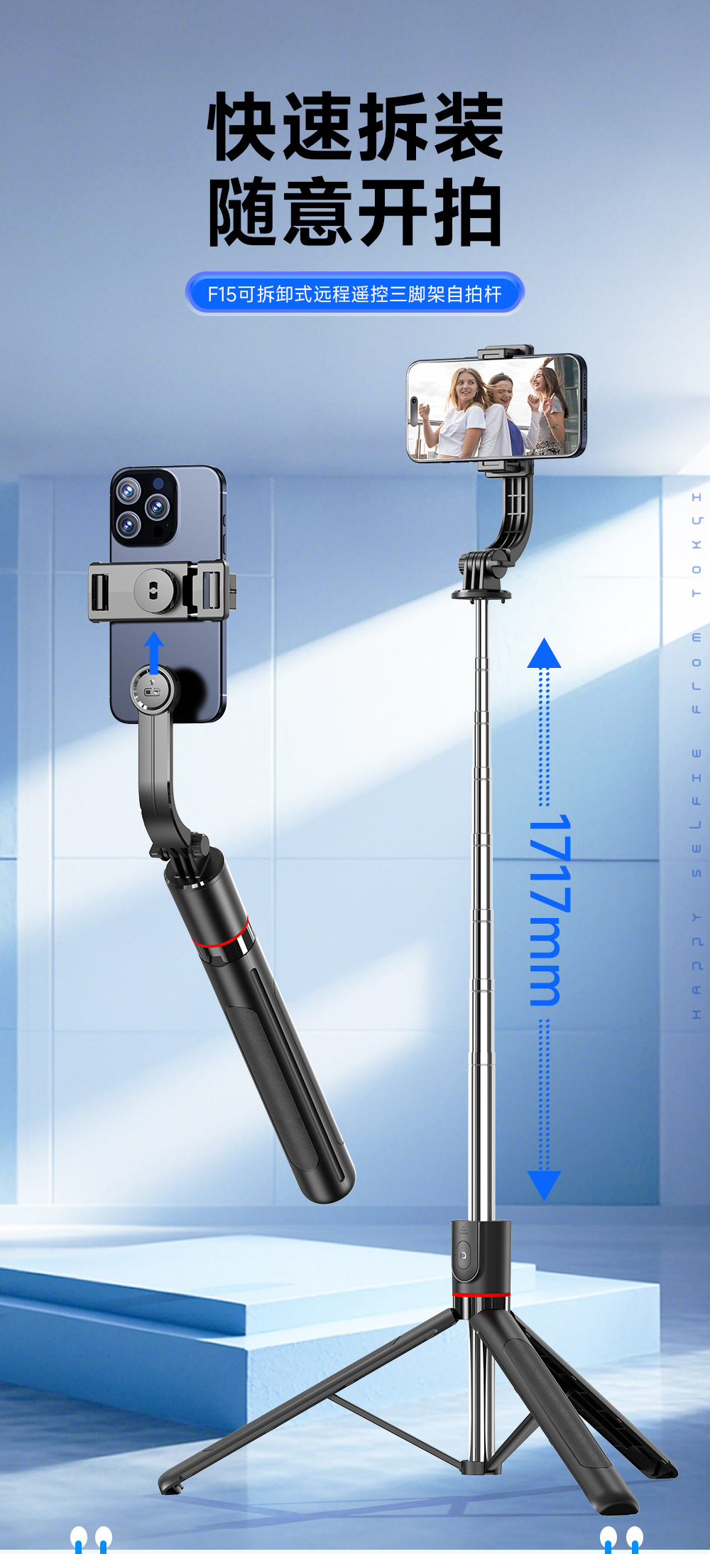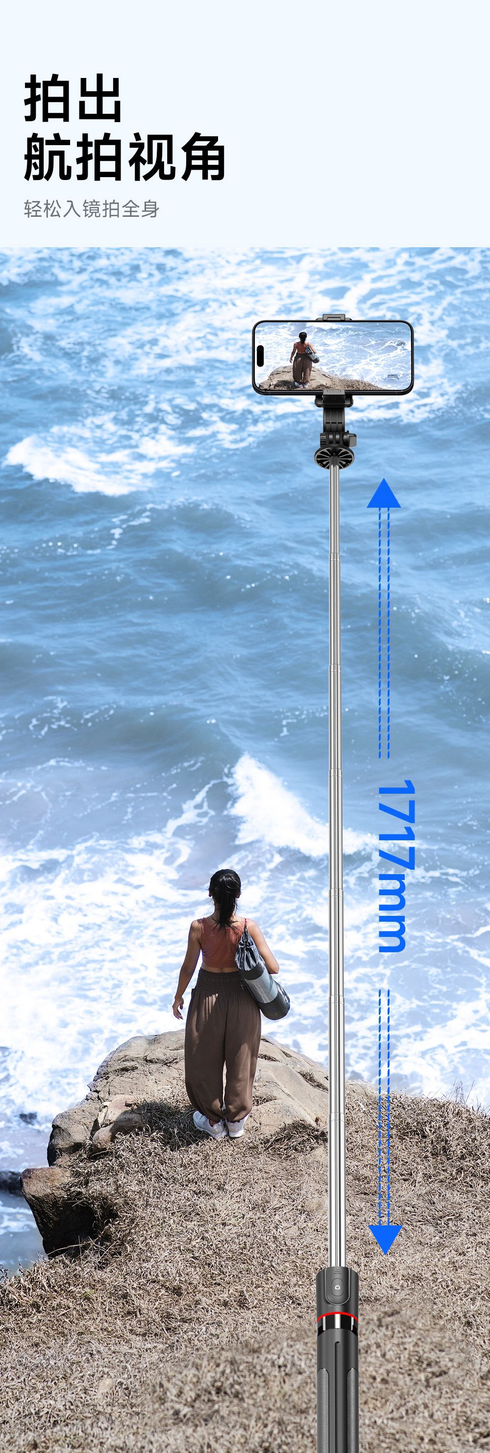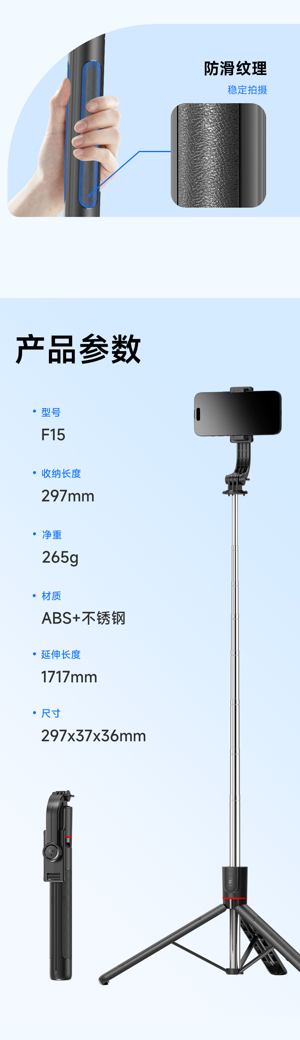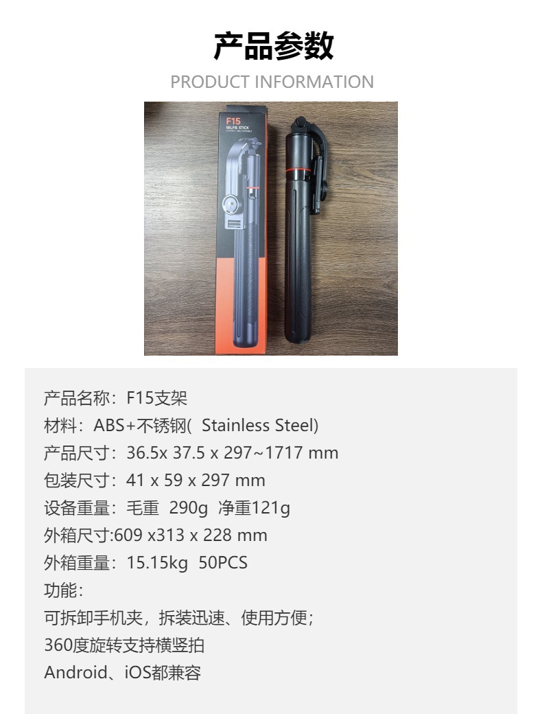 • 【F15 스탠다드 버전】 1.7m 길이 조절 스탠드 + 블루투스 리모컨 + 용골 지지대 + 탈착식 휴대폰 거치대