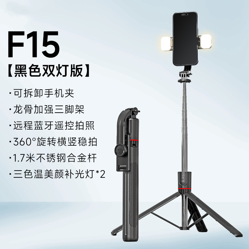 • [F15 듀얼 라이트 버전] 1.7m 텔레스코픽 폴 + 블루투스 리모콘 + 용골 지지대 + 탈착식 휴대폰 클립 + 필 라이트
