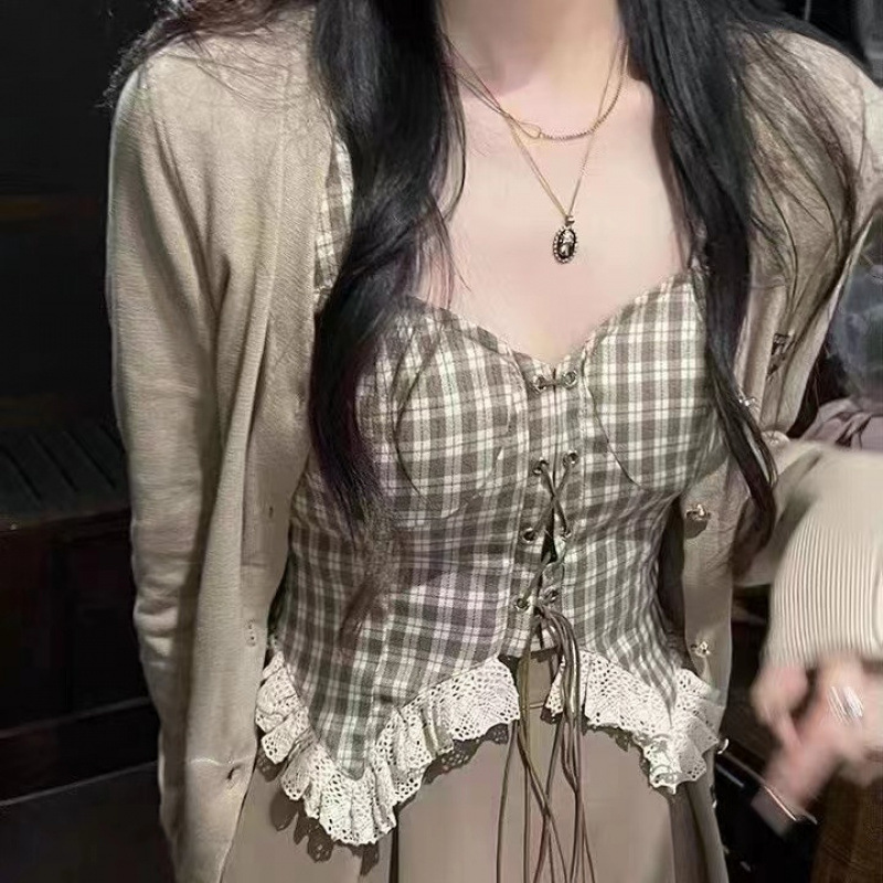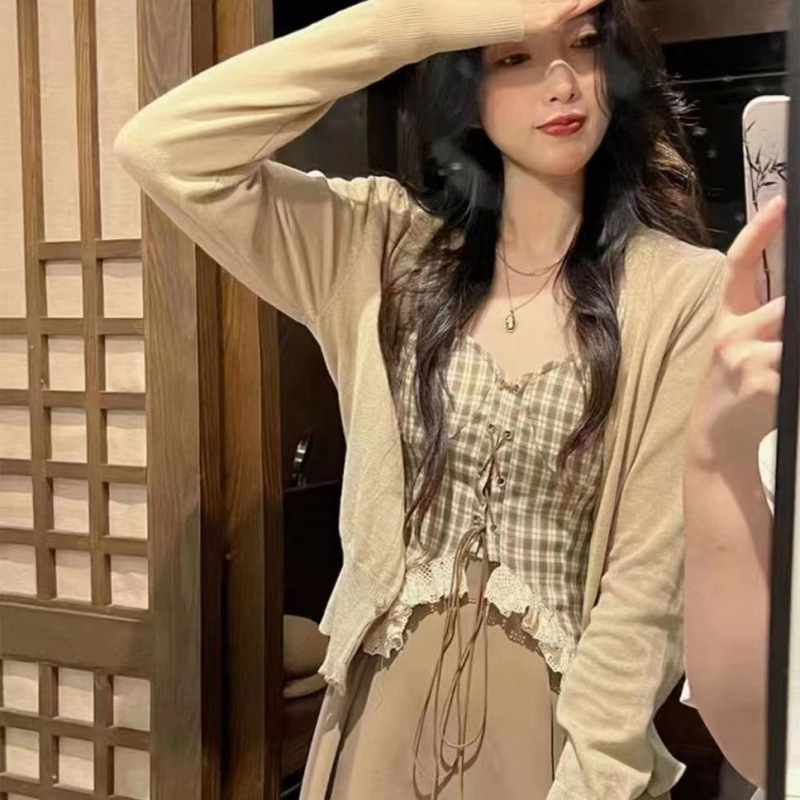 빈티지 홍콩 스타일 격자 무늬 스트랩 슬링 조끼 세트 여성 봄과 여름 새로운 니트 카디건 하프 길이 원피스 3 피스 세트