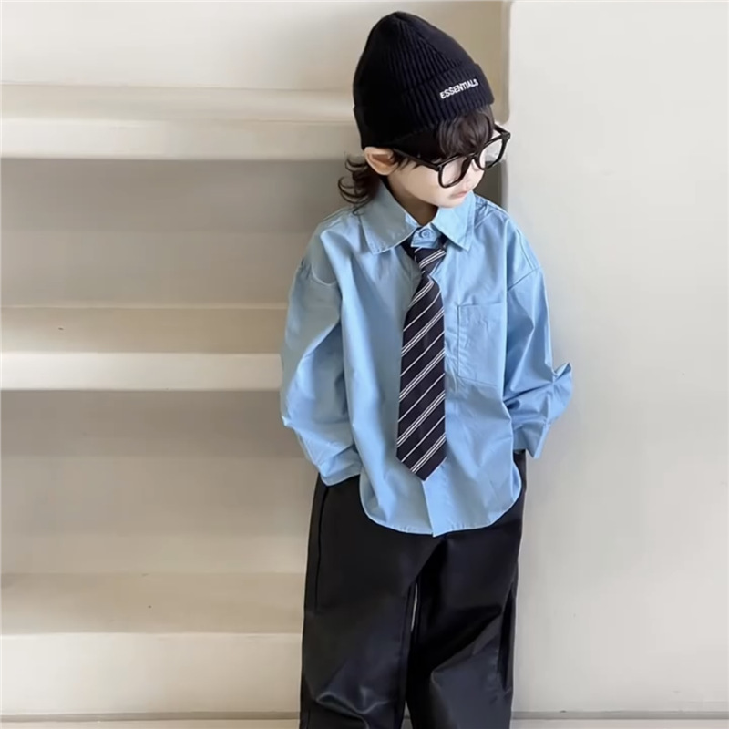 봄과 여름 2025 새로운 소년 넥타이 셔츠 한국 아동복 어린이 블루 셔츠 아기 소년 서양식 탑