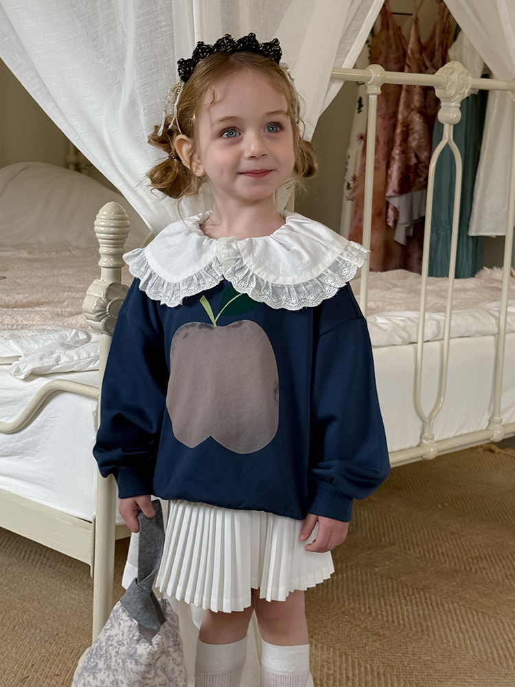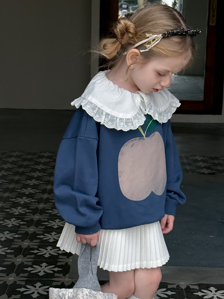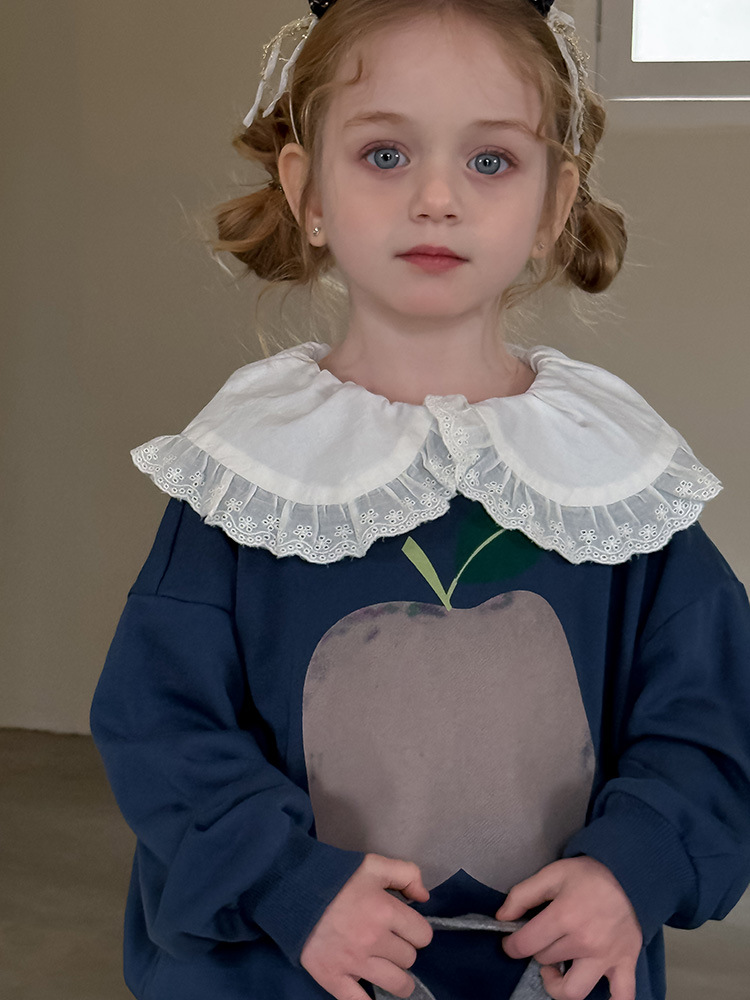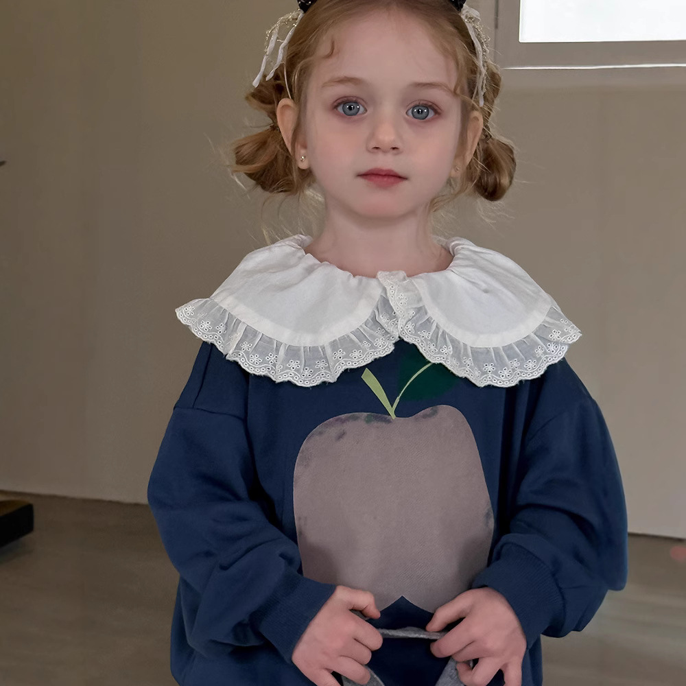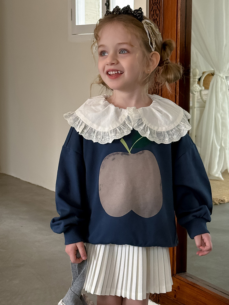 여아용 애플 카라 스웨트셔츠 2025 봄 가을 신상 한국판 아동 만화 프린트 레이스 카라 긴팔 스웨트셔츠