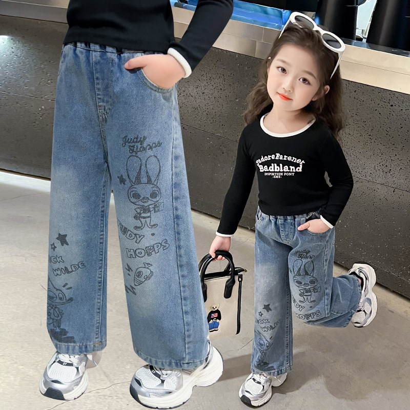 소녀 바지 봄과 가을 2025 새로운 서양 스타일 유행 어린이 스트레이트 와이드 다리 바지 아기 소녀의 봄 청바지스토어 가기