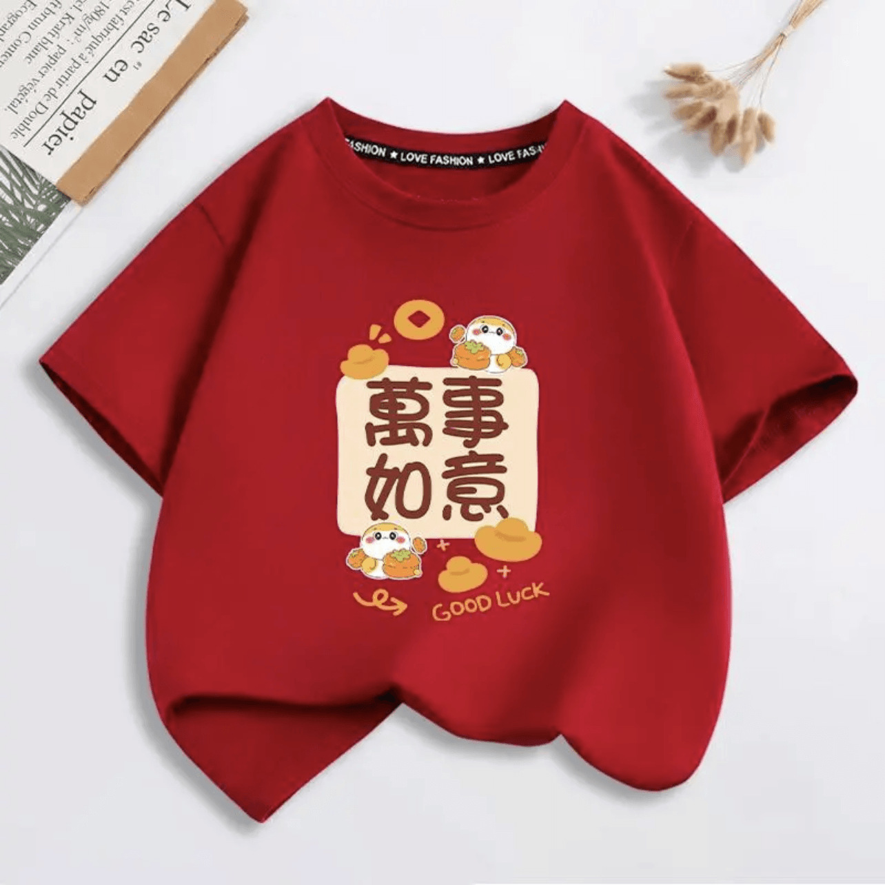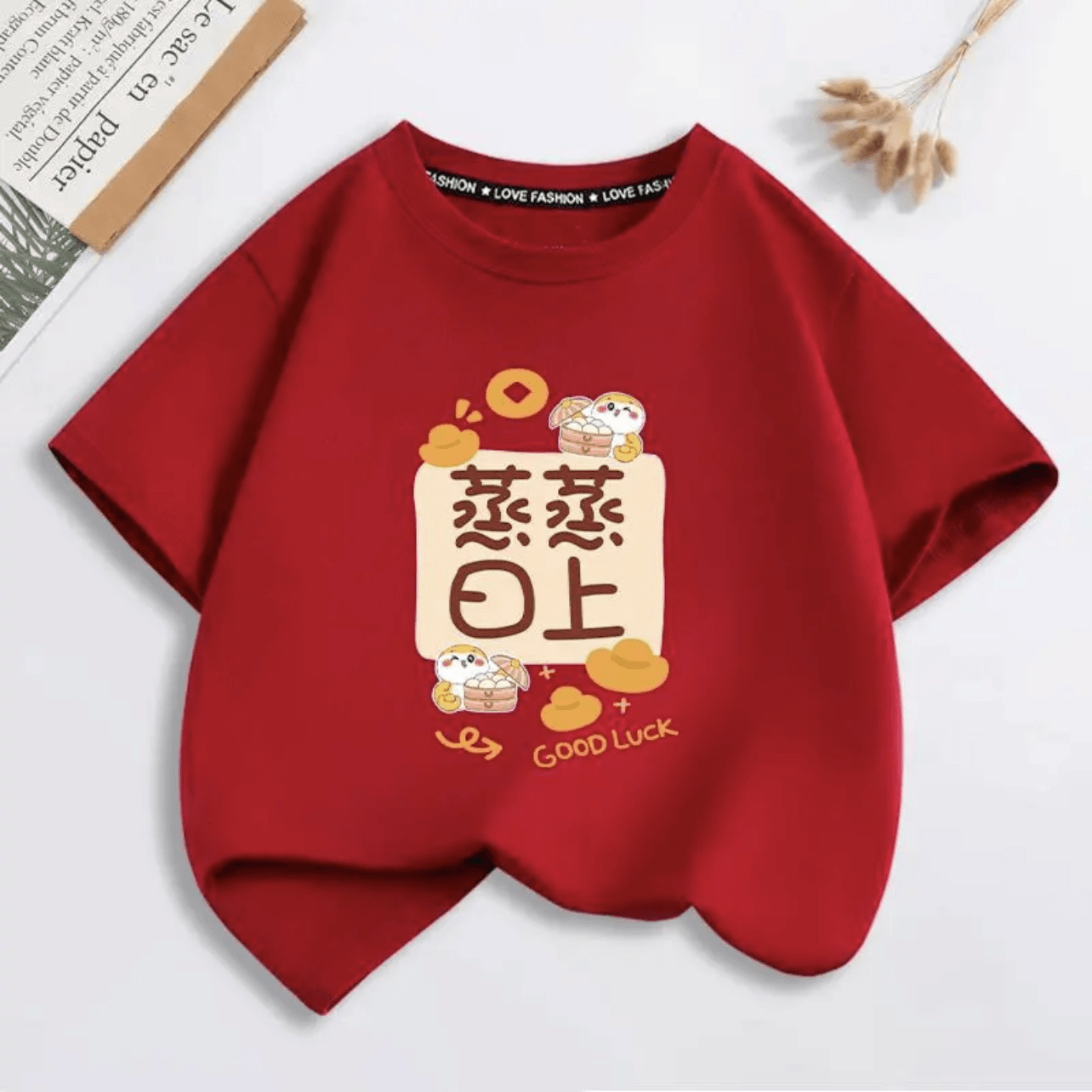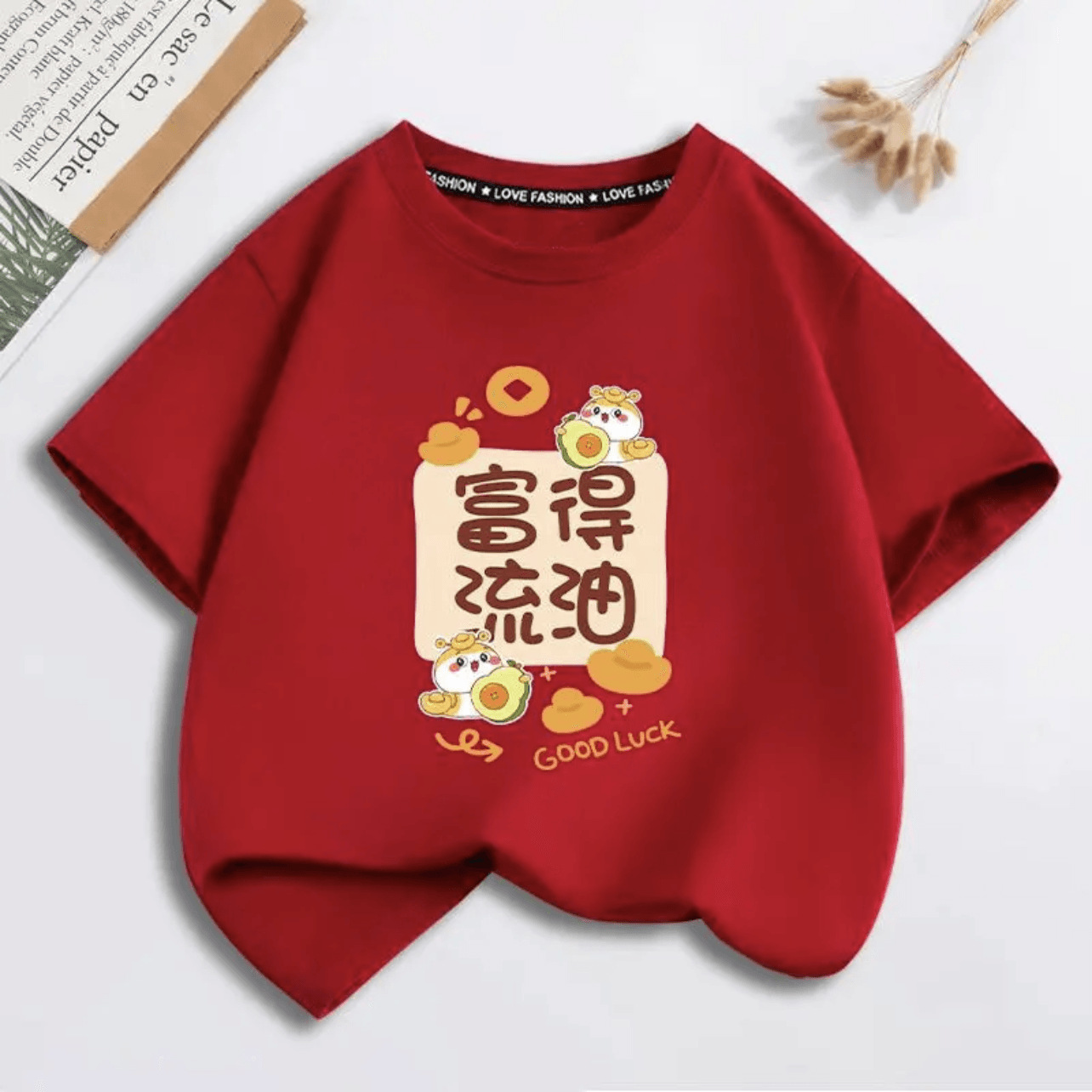 2025 년 새해 어린이 여름 면화 반팔 여름 레드 축제 서양식 소년 소녀 반팔 티셔츠스토어 가기