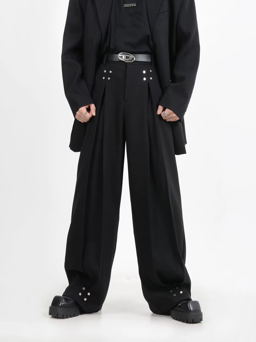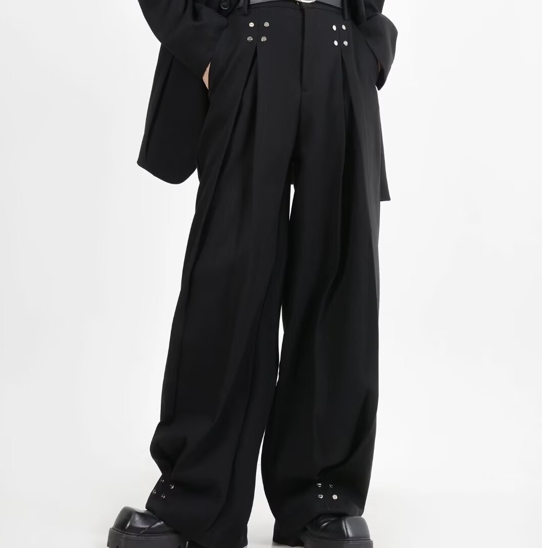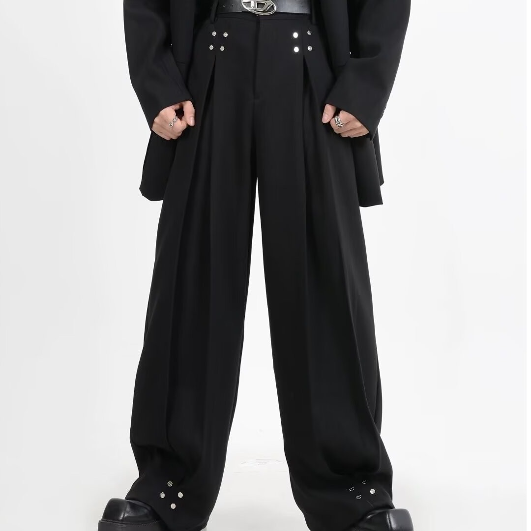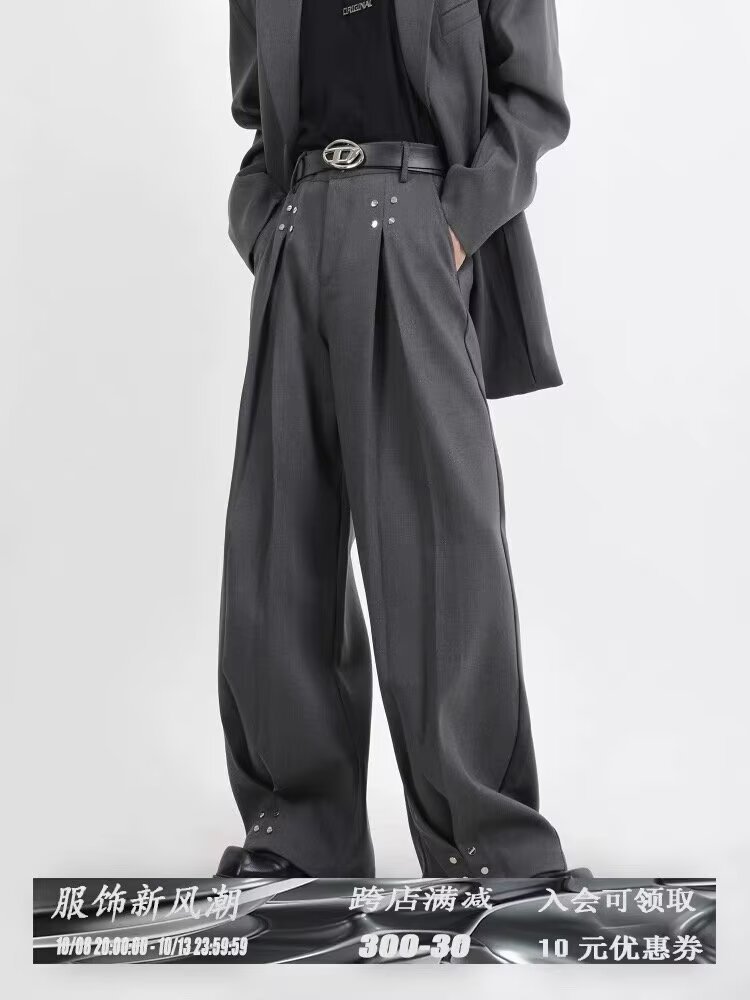 나폴리 디자인 센스 바지 남성용 봄 미국 분위기 리벳 플리츠 와이드 레그 팬츠 패션 브랜드 스트레이트 바지