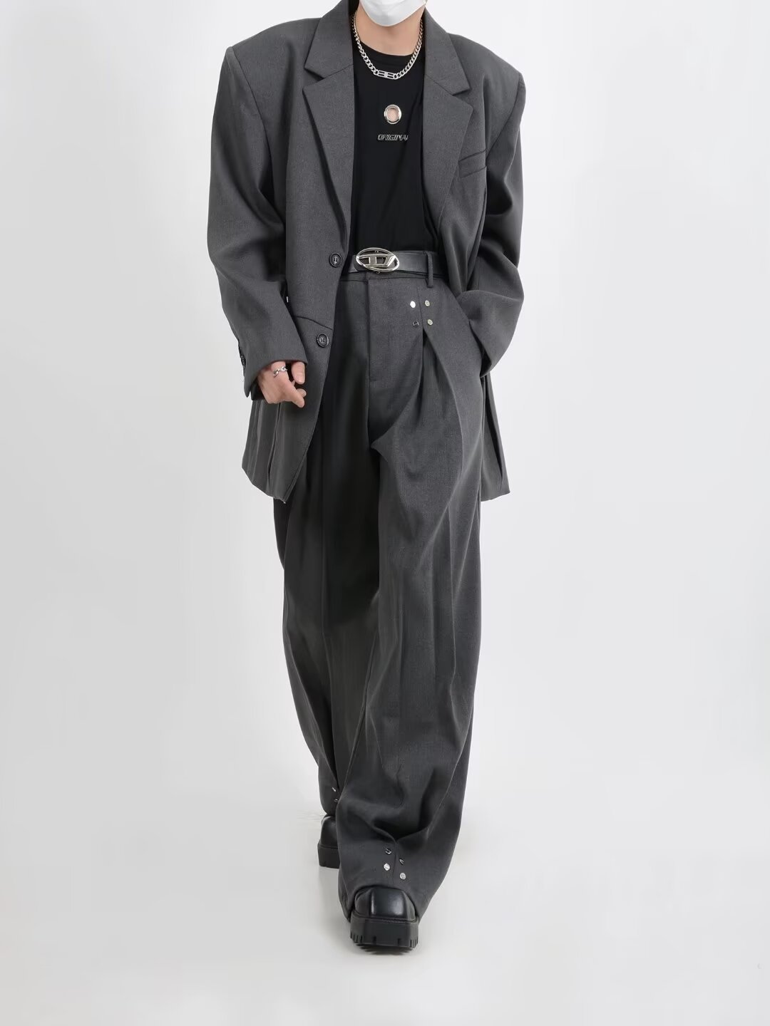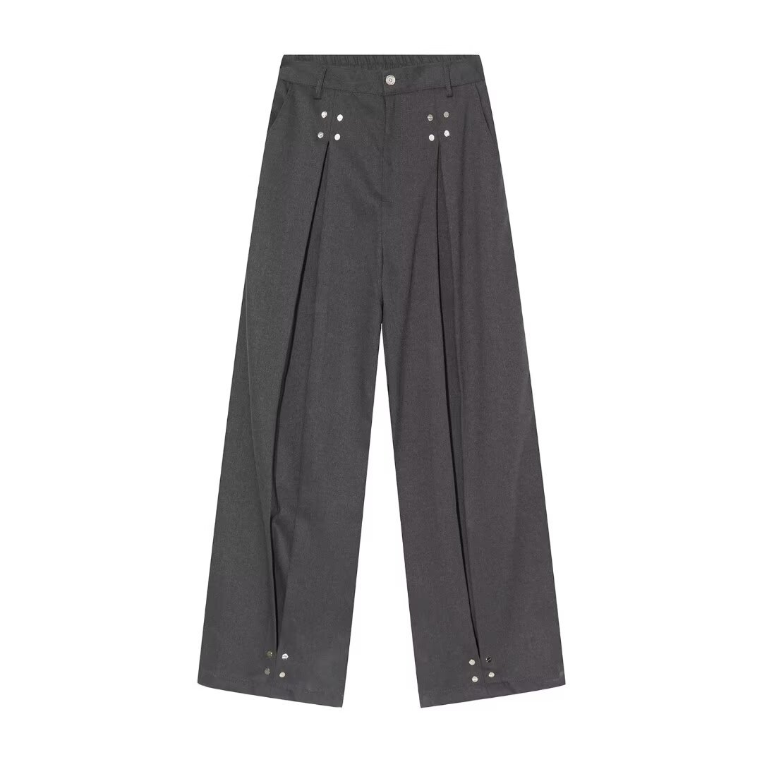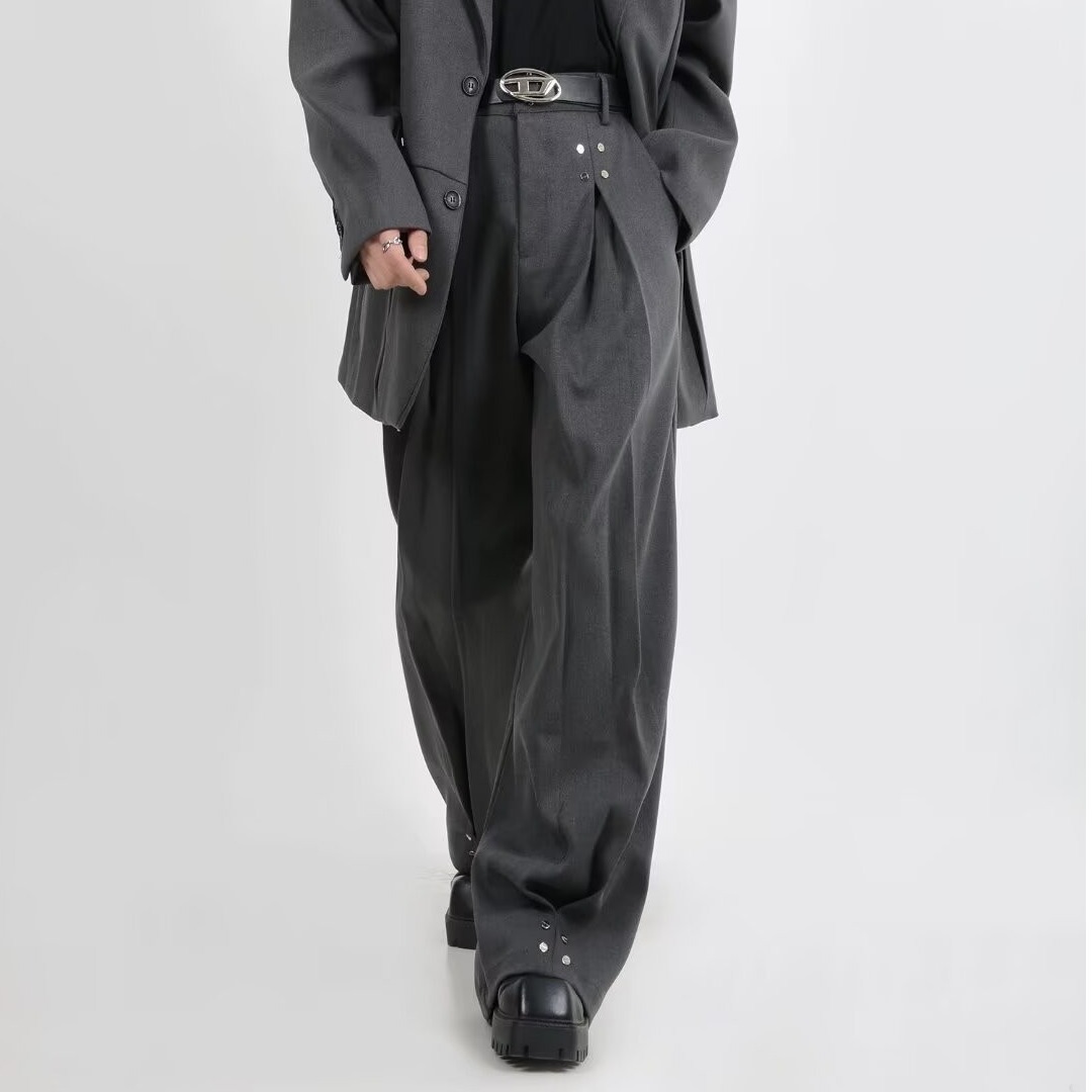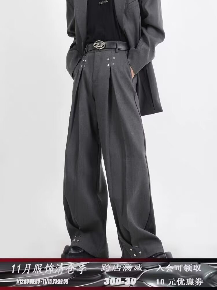 나폴리 디자인 센스 바지 남성용 봄 미국 분위기 리벳 플리츠 와이드 레그 팬츠 패션 브랜드 스트레이트 바지스토어 가기