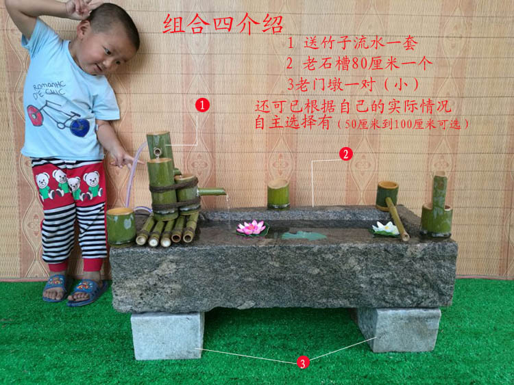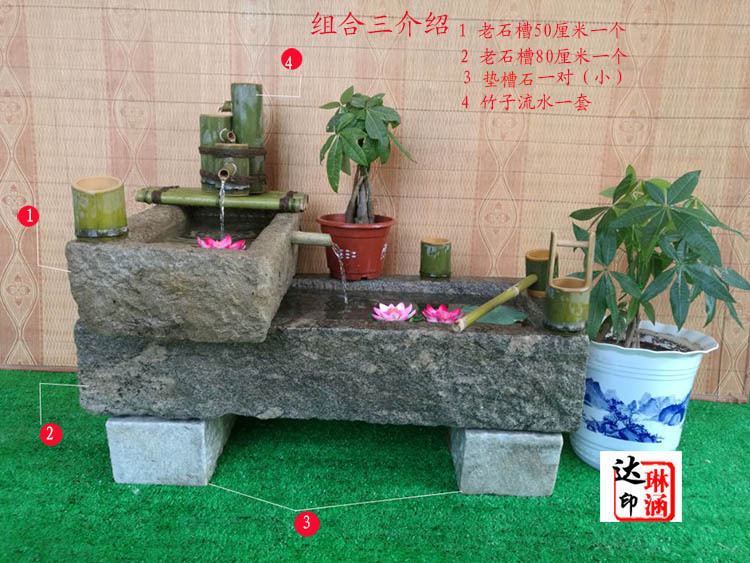 물고기 수조, 작은 돌로, 오래된 돌로, 소 사료통, 말 사료통, 돼지 사료통, 물고기 및 꽃 식재, 세면대, 실내 안뜰, 베이스