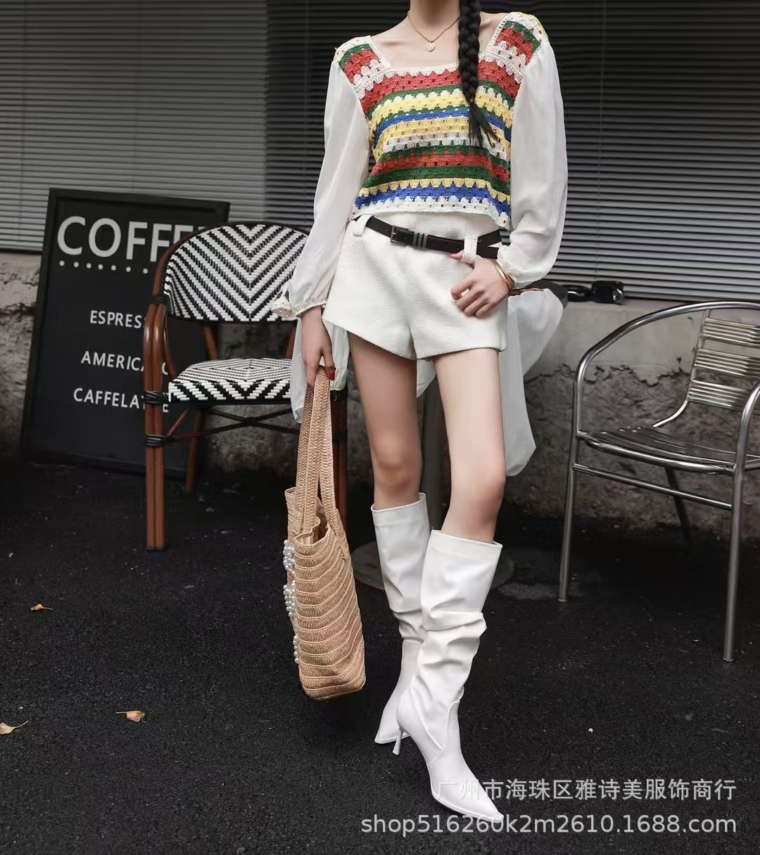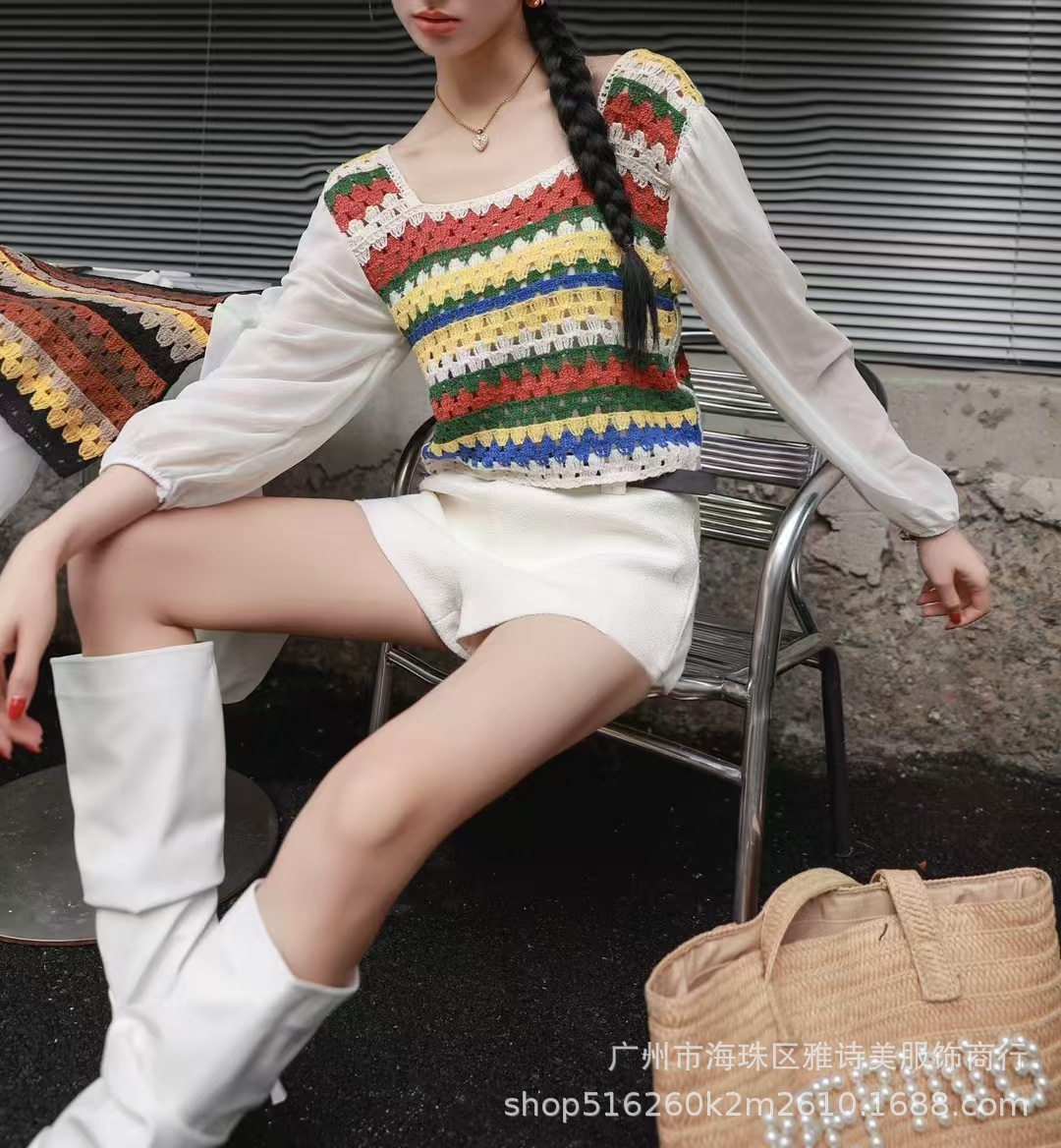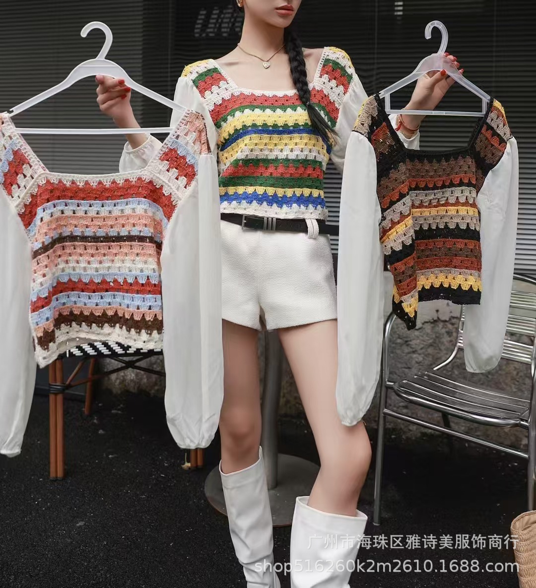 봄 달콤한 컬러 스티칭 빈 퍼프 슬리브 쉬폰 셔츠 여성의 새로운 디자인 센스 올매치 루즈 쇼트 탑