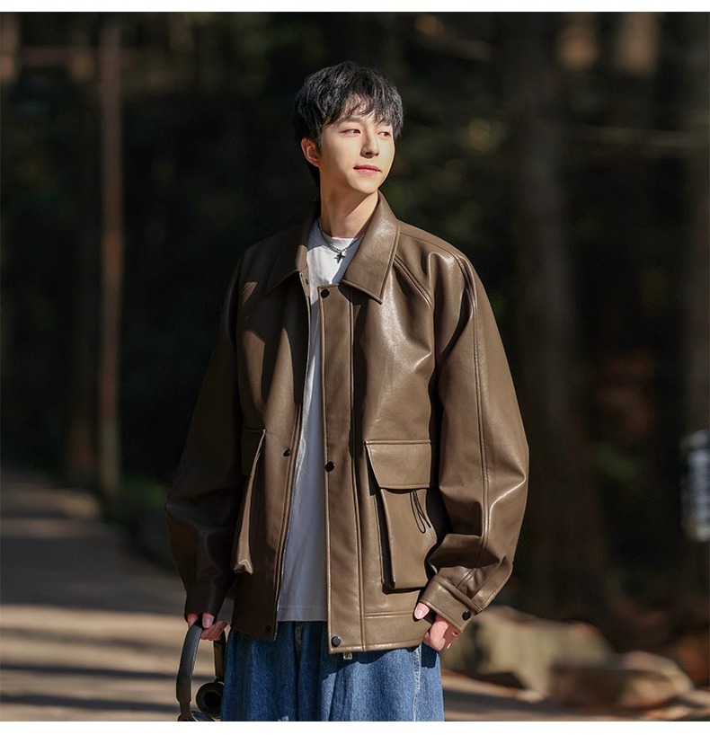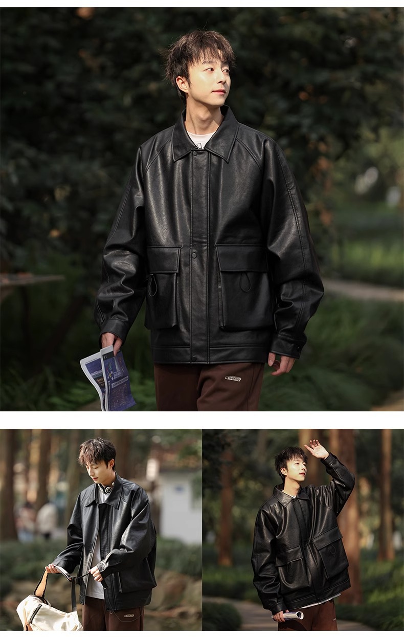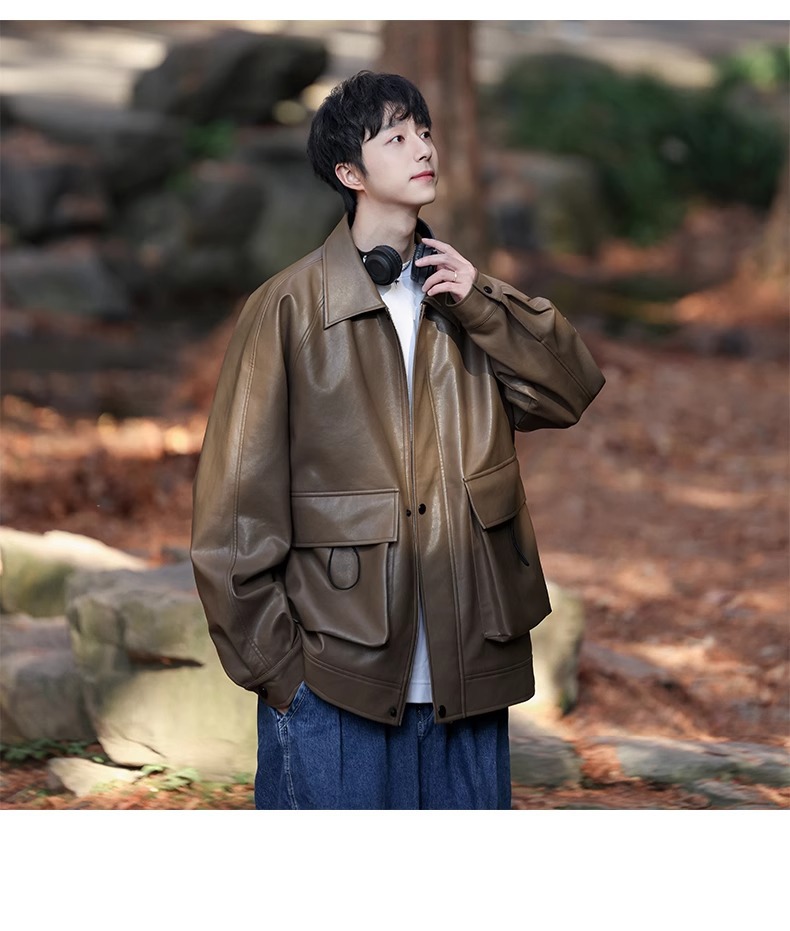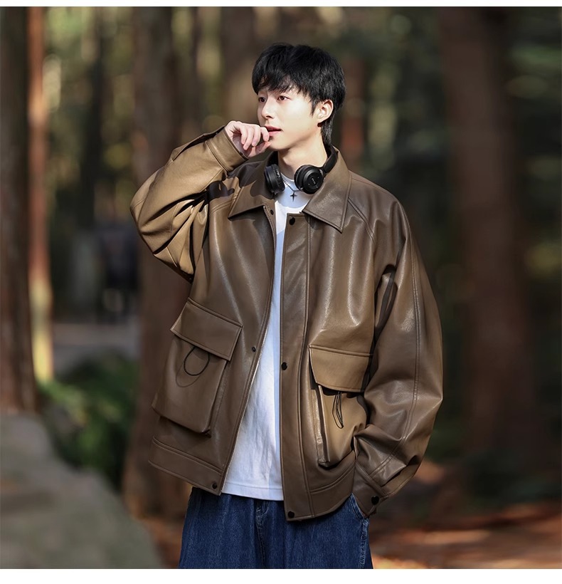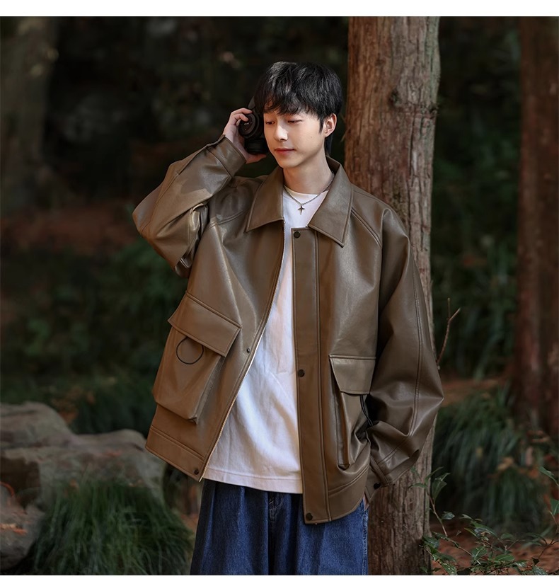 NASA 옷깃 가죽 자켓 남자의 봄과 가을 2025 오토바이 스타일 미국 스타일 야외 느슨한 도구 가죽 자켓스토어 가기