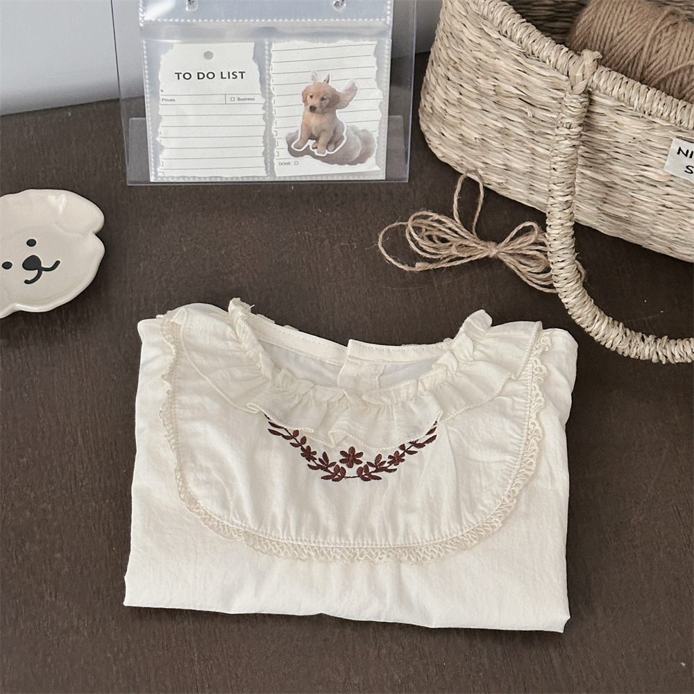 INS 봄과 가을 아기 쉬폰 Zou Zou 작은 연꽃 잎 칼라 가슴 수 놓은 긴 소매 셔츠 여성의 보물스토어 가기