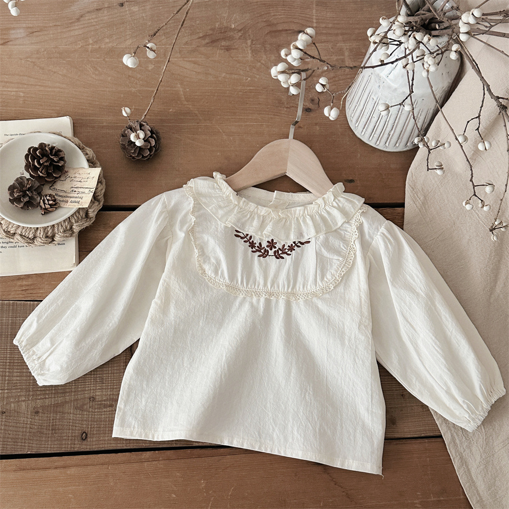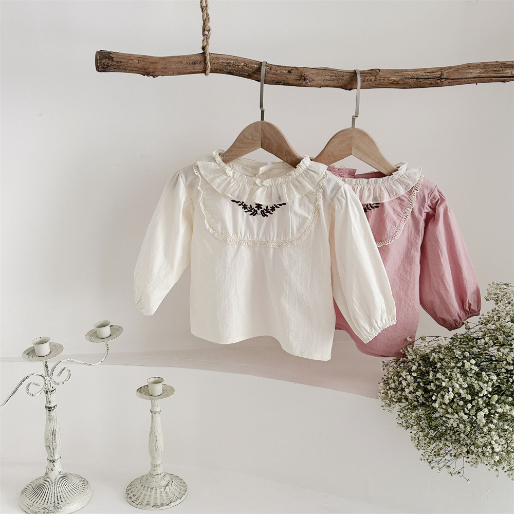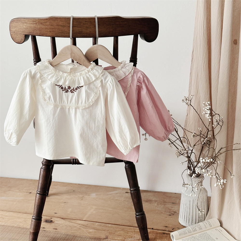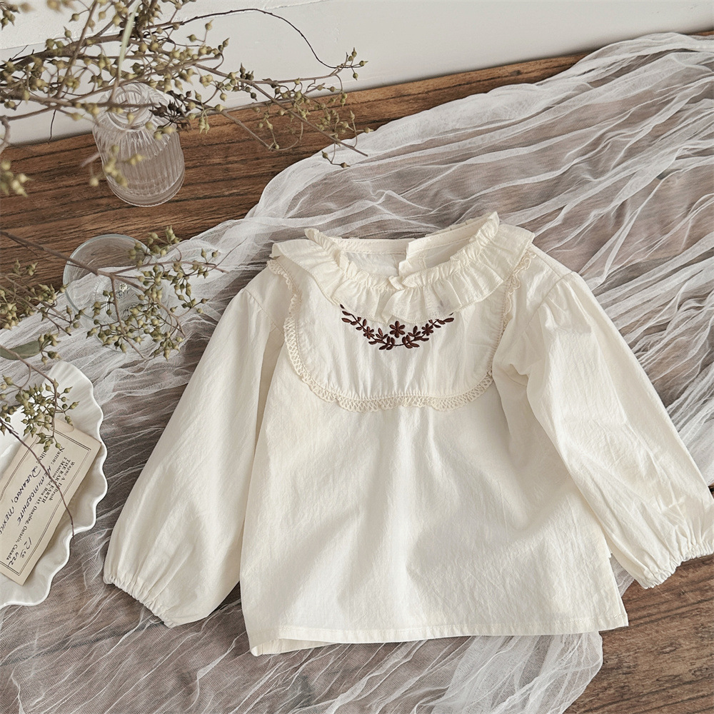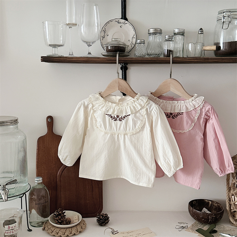 INS 봄과 가을 아기 쉬폰 Zou Zou 작은 연꽃 잎 칼라 가슴 수 놓은 긴 소매 셔츠 여성의 보물