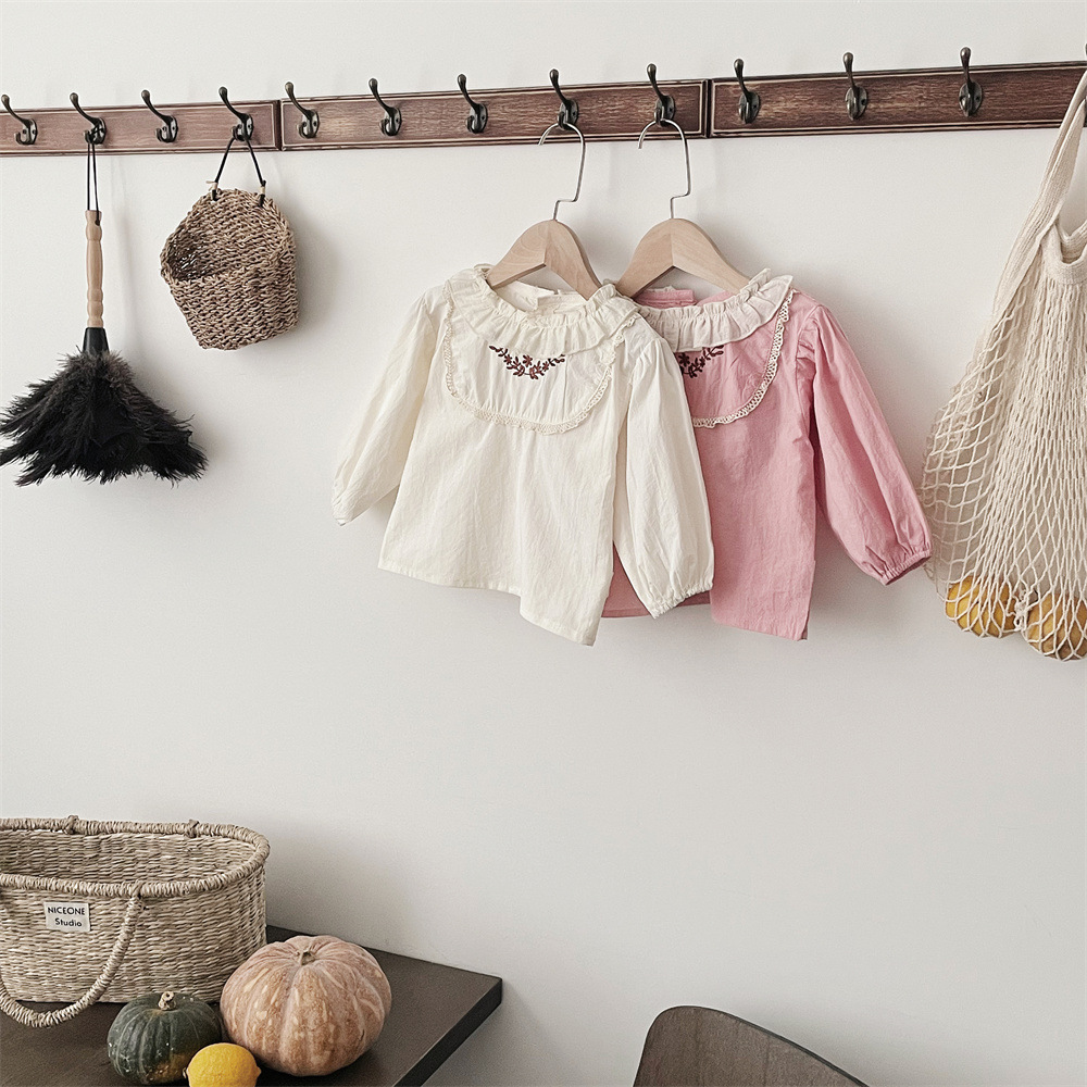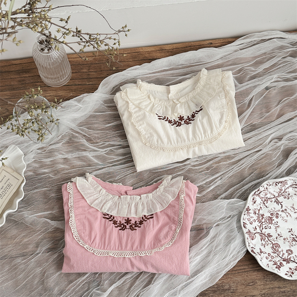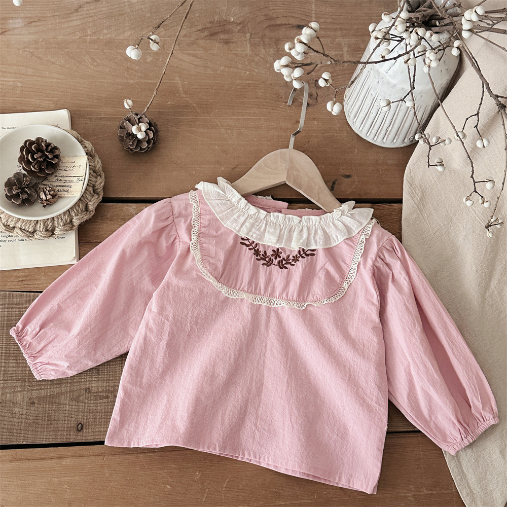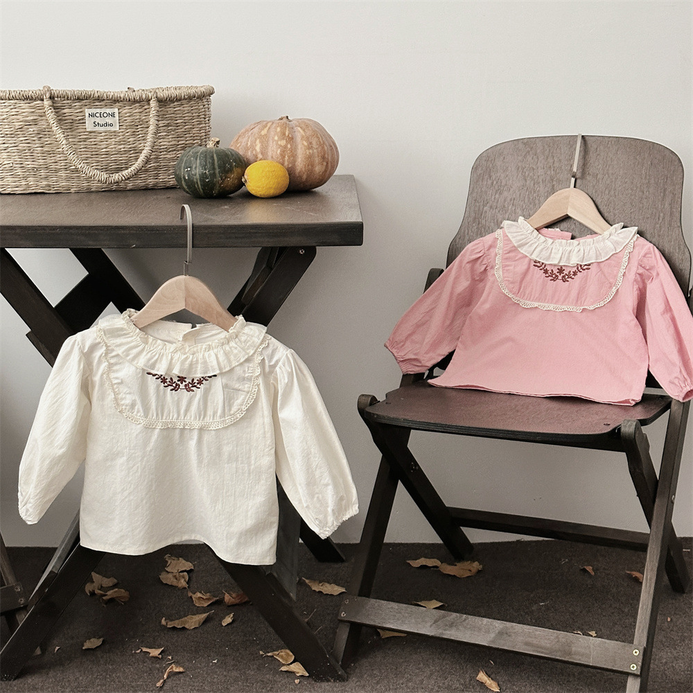 INS 봄과 가을 아기 쉬폰 Zou Zou 작은 연꽃 잎 칼라 가슴 수 놓은 긴 소매 셔츠 여성의 보물