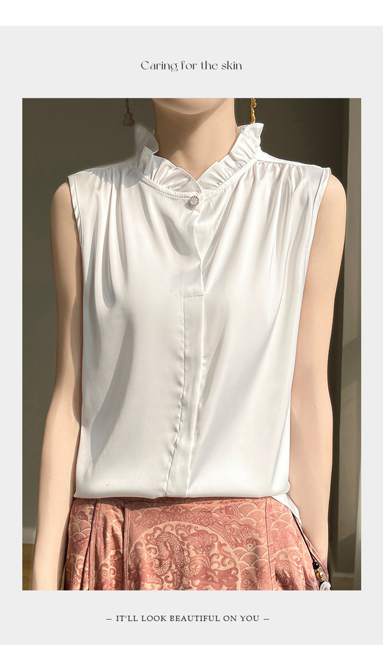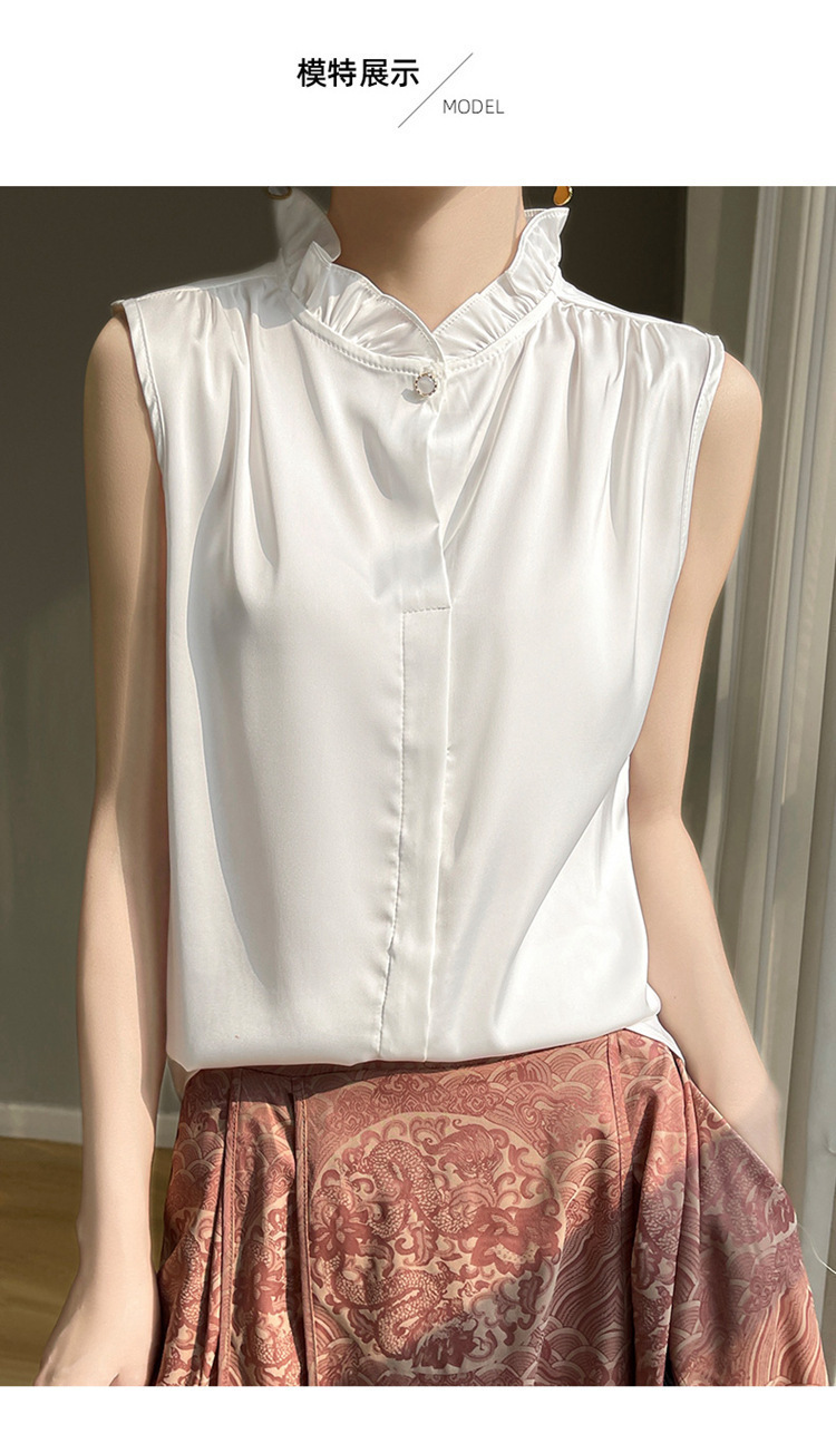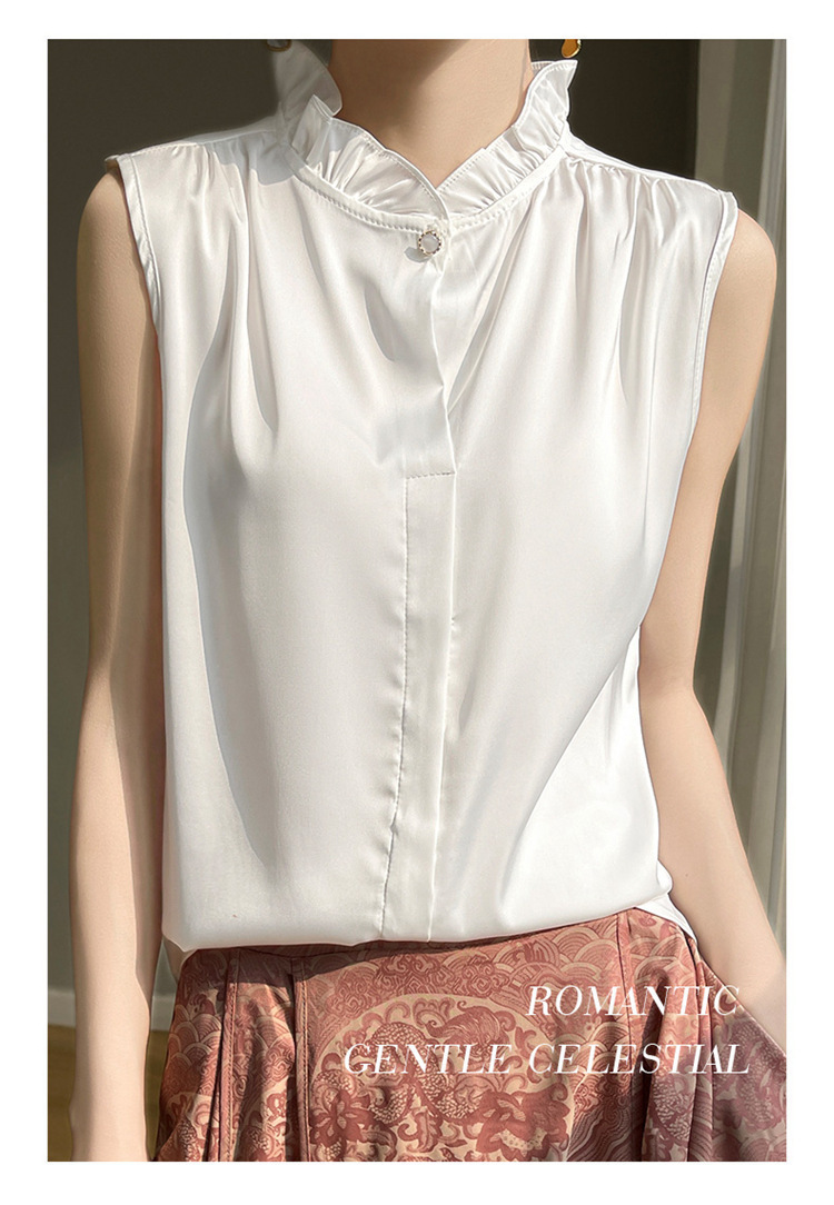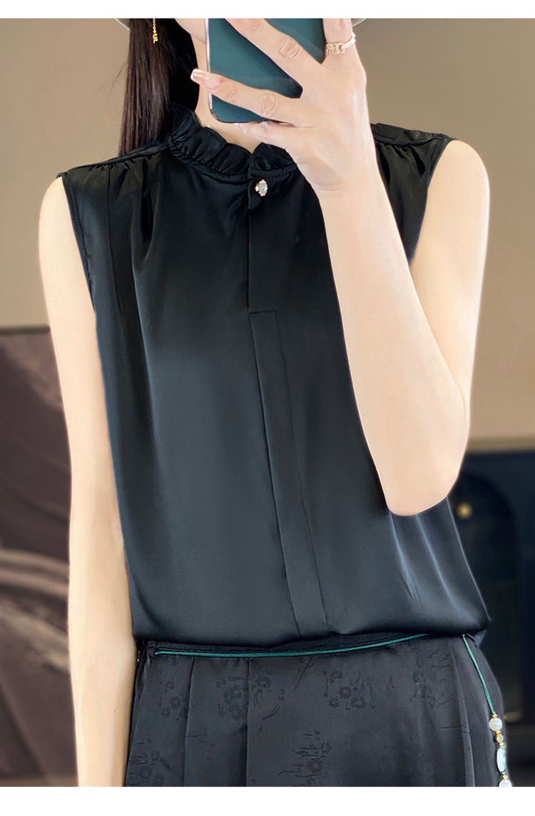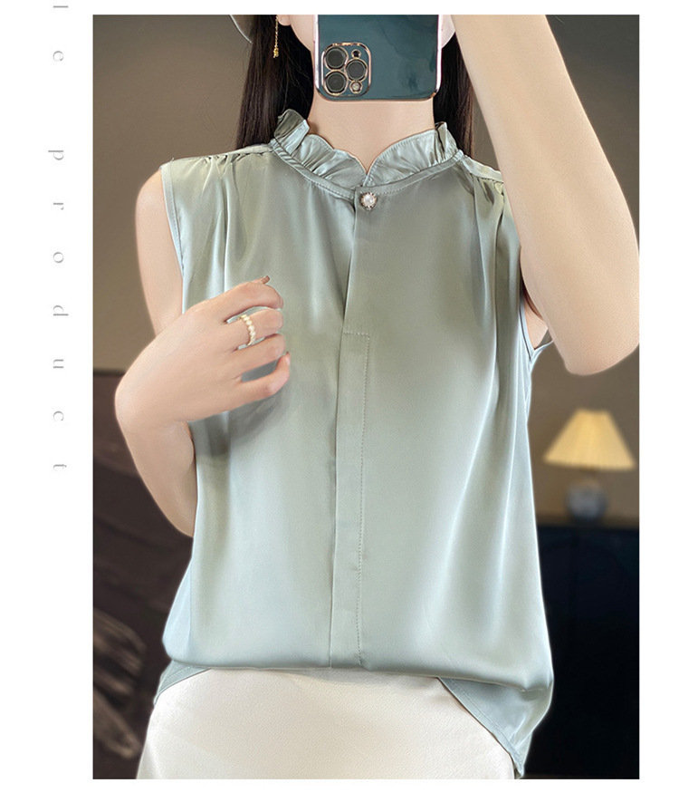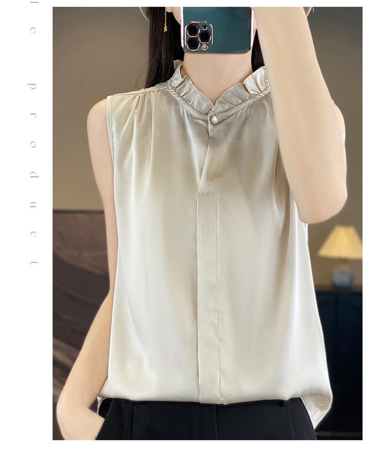 새로운 봄과 여름 곰팡이 레이스 칼라 여성용 민소매 원 버튼 조끼 새틴 슬림 얇은 우아한 셔츠