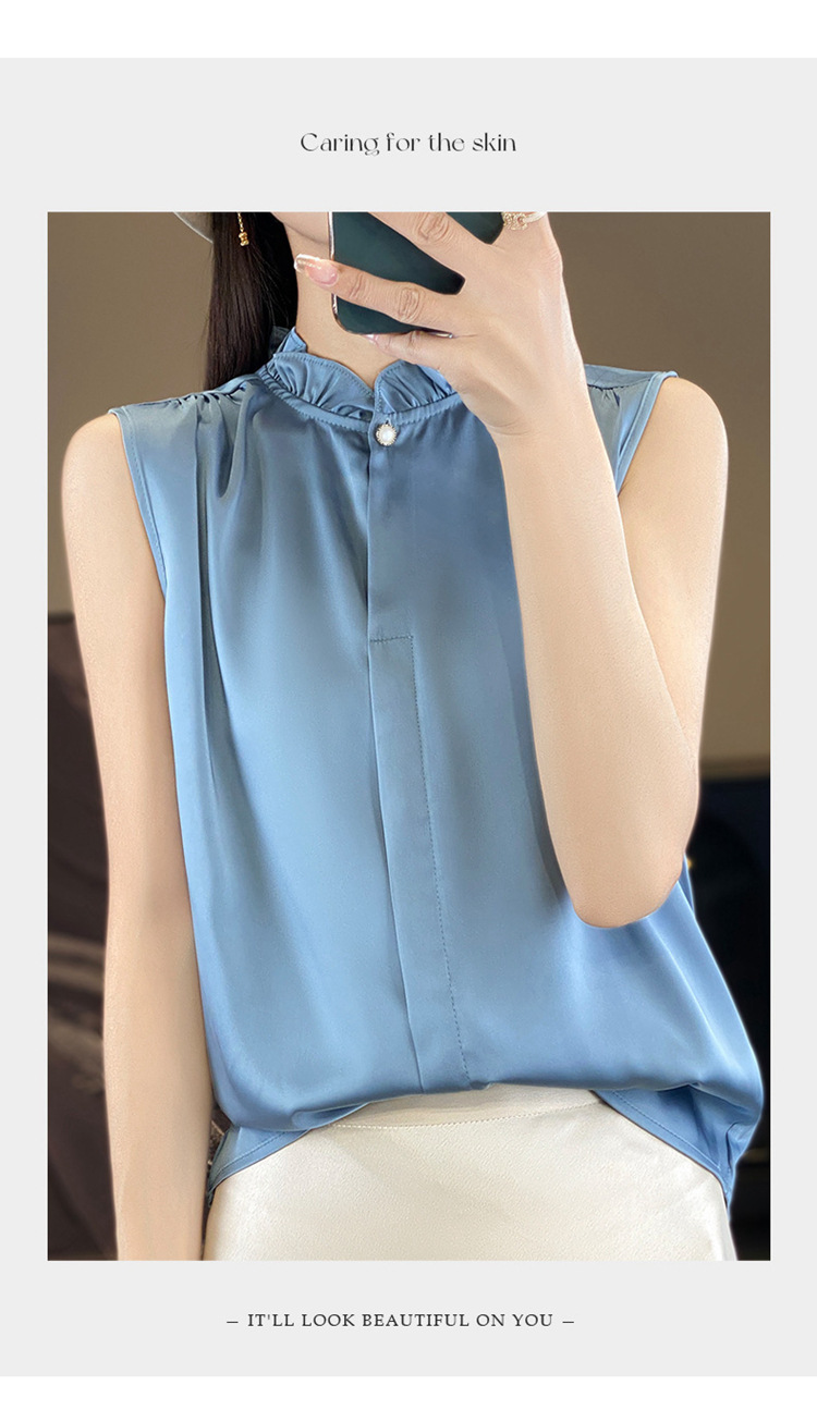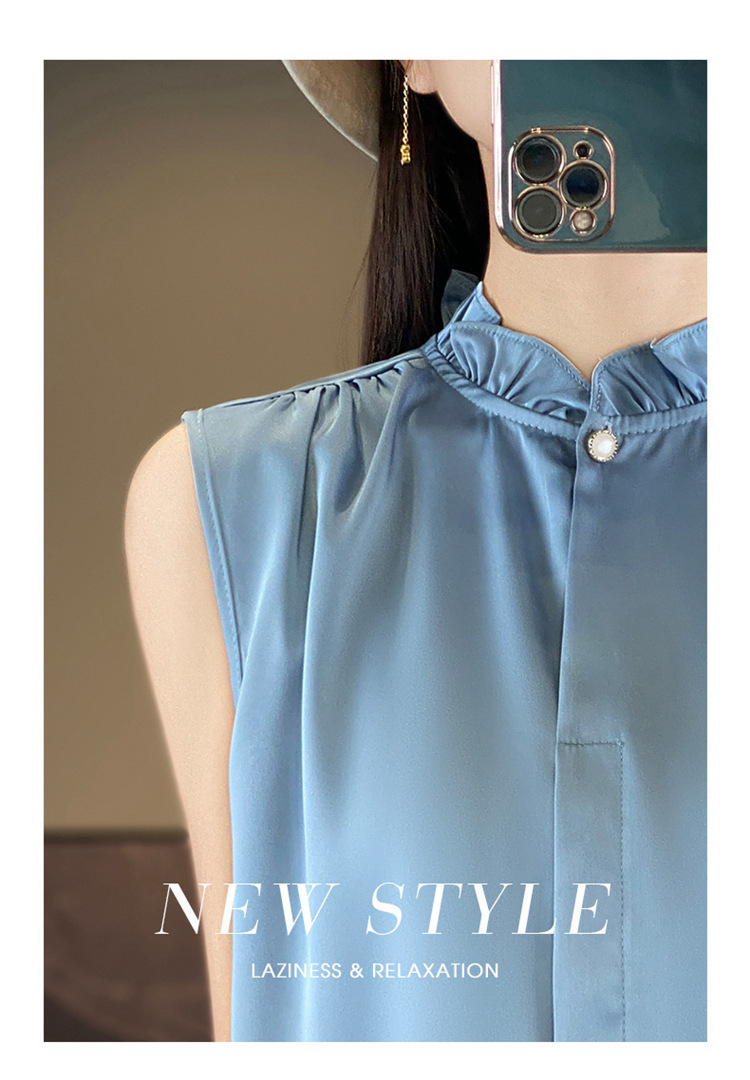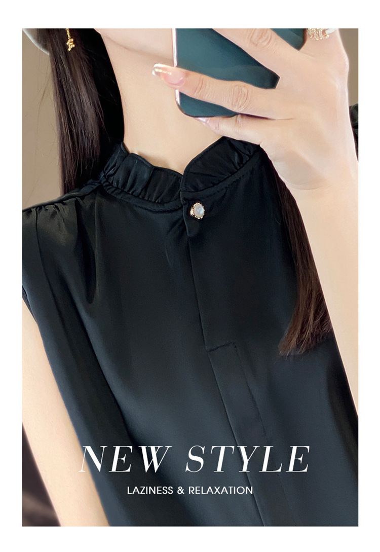 새로운 봄과 여름 곰팡이 레이스 칼라 여성용 민소매 원 버튼 조끼 새틴 슬림 얇은 우아한 셔츠스토어 가기