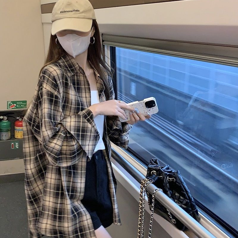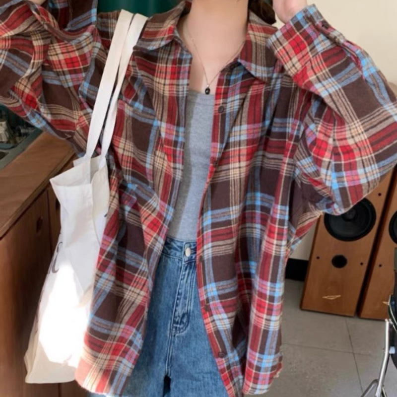 2025 봄과 가을 새로운 빈티지 격자 무늬 셔츠 여성용 코트 긴 소매 얇은 카디건 탑 느슨한 게으른 스타일 셔츠스토어 가기