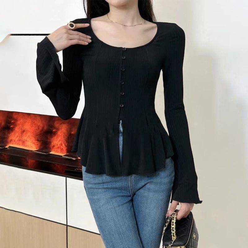 순수한 욕망 핑크 할로우 아웃 긴팔 티셔츠 여성용 봄과 여름 빈티지 젠틀 불규칙한 슬림 핏 이너 카디건 칙 탑