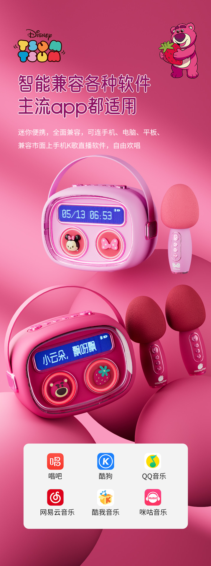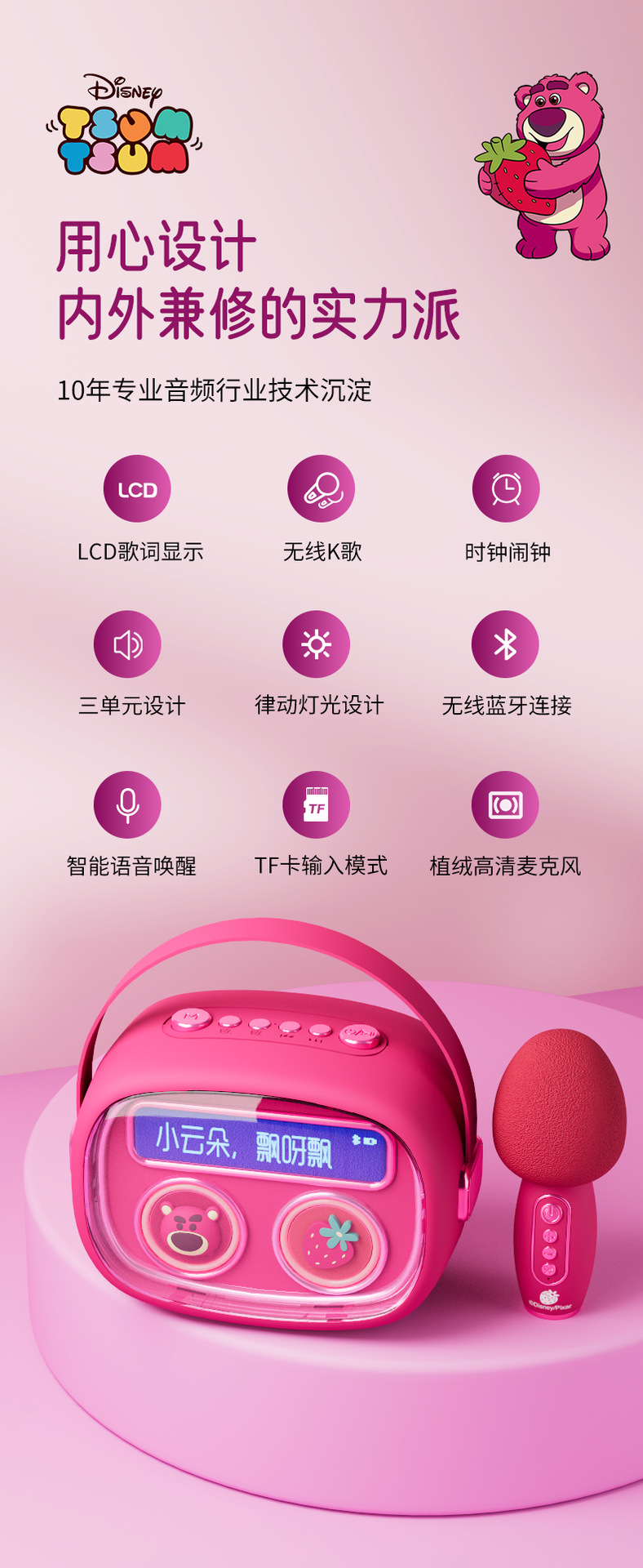 插卡功能支持MP3格式音乐。(TF卡下载带有歌词MP3文件即可)