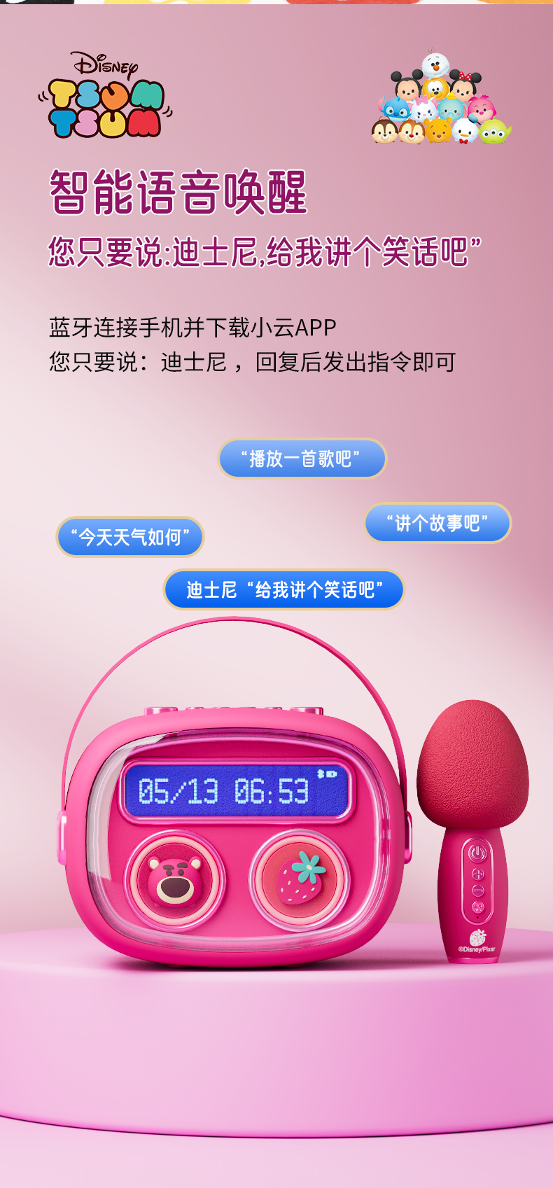 智能语音唤醒(蓝牙连接手机并下载小云APP,您只要说:迪士尼 ,回复后发出指令即可)