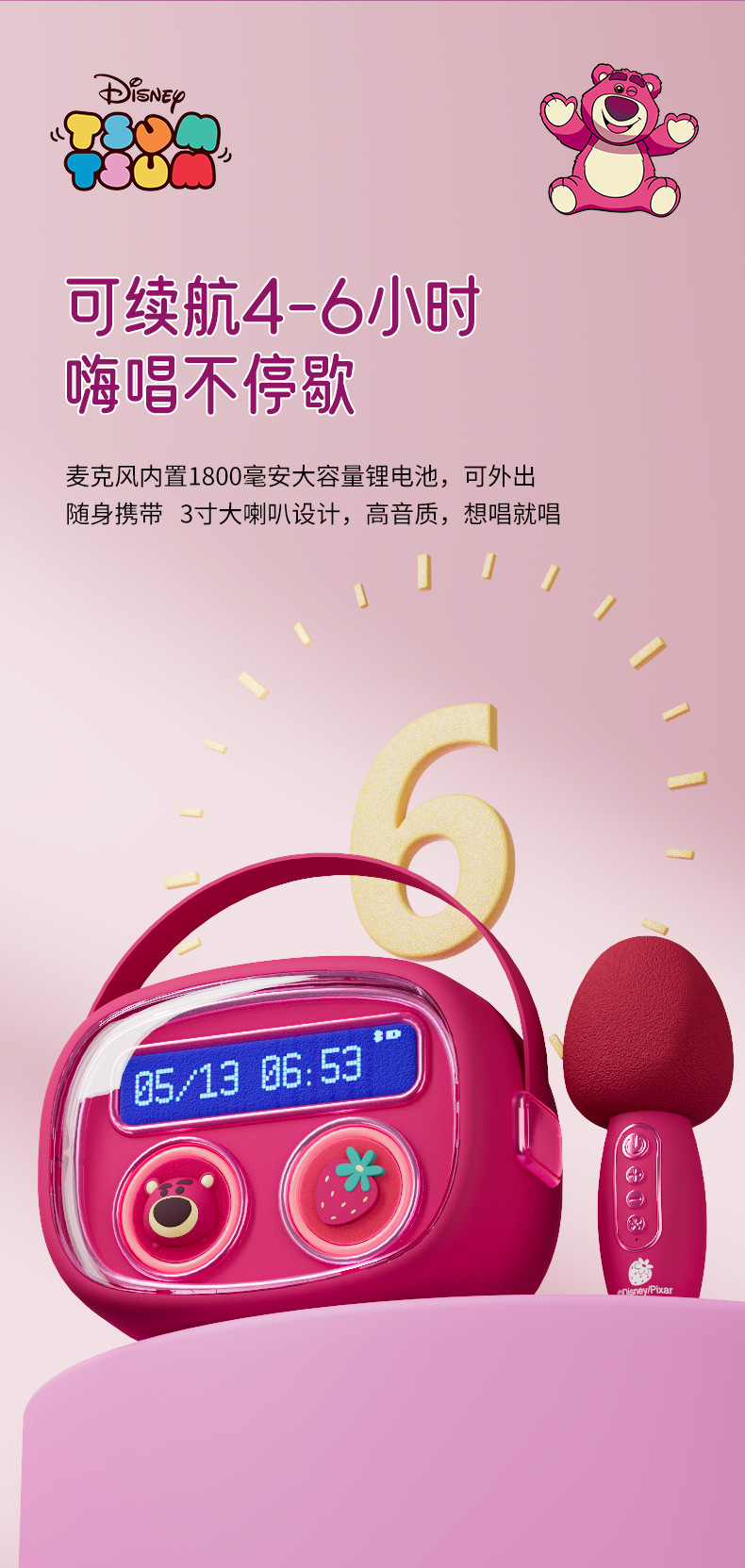 TF卡支持格式:MP3 扬声器单元:72mm , 电池容量:1800毫安 麦克风电池:500毫安 充电电压:DC4.8-5V