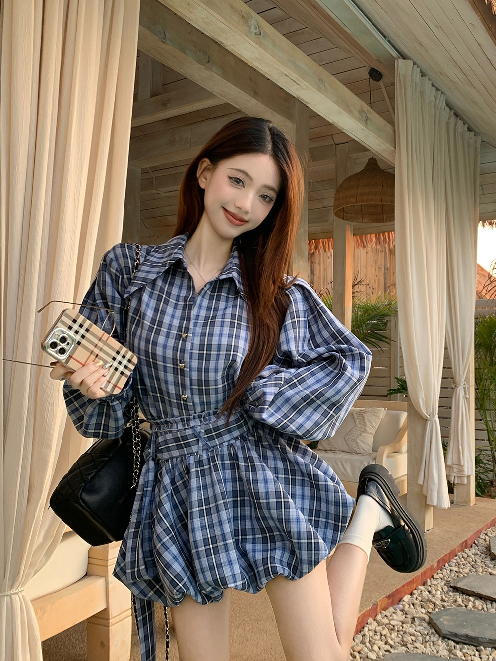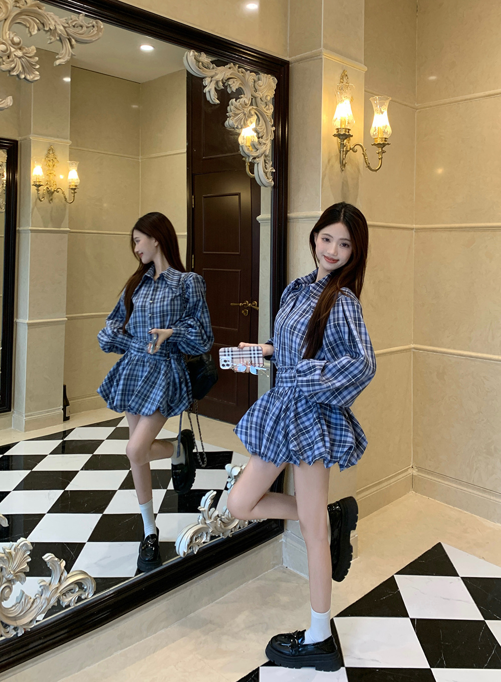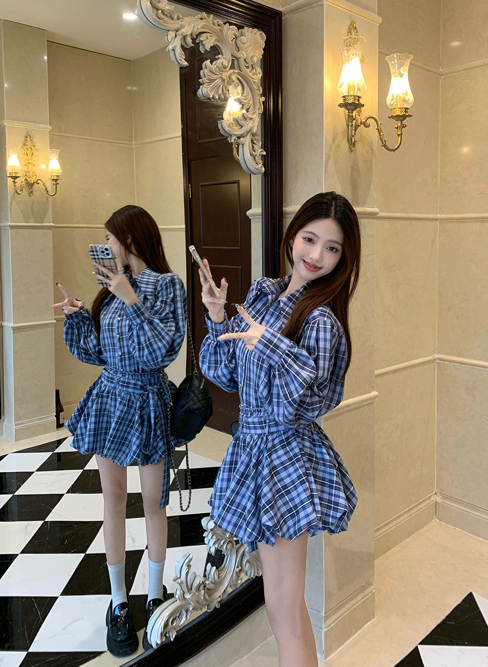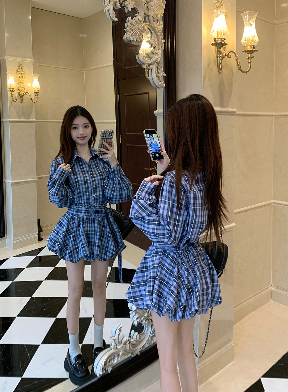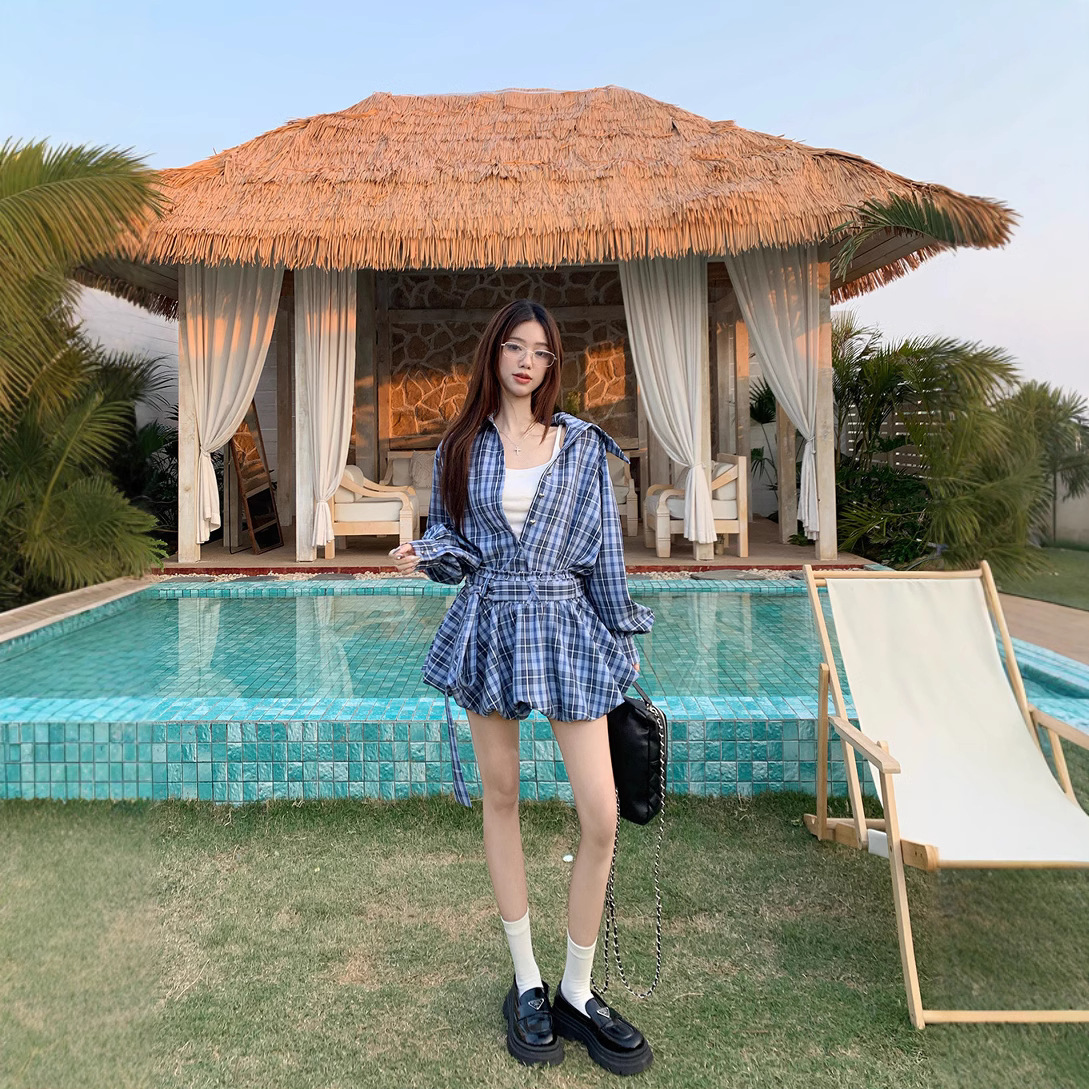 리얼 샷 ~ 2025 봄 새로운 연인 핫 소녀 순수 복고풍 체크 셔츠 스커트 바지 패션 세트 76612스토어 가기