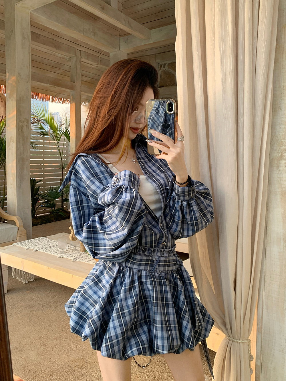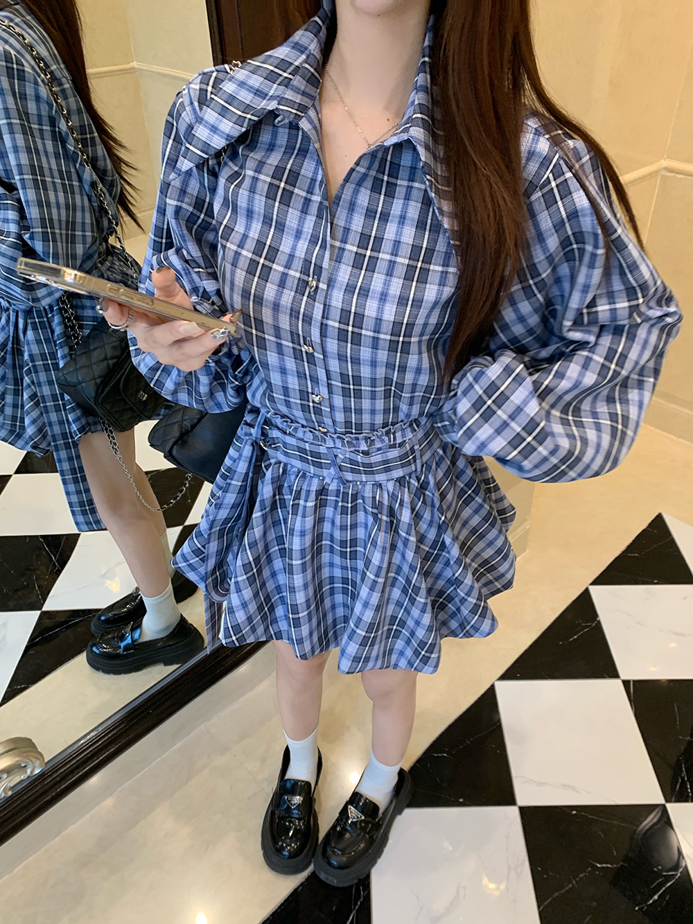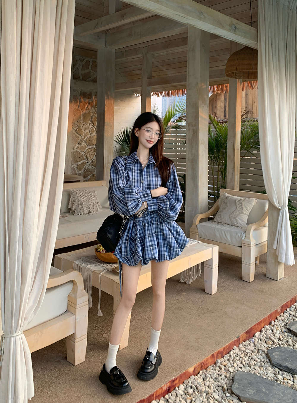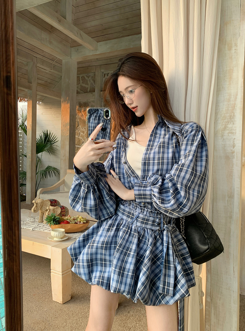 리얼 샷 ~ 2025 봄 새로운 연인 핫 소녀 순수 복고풍 체크 셔츠 스커트 바지 패션 세트 76612스토어 가기