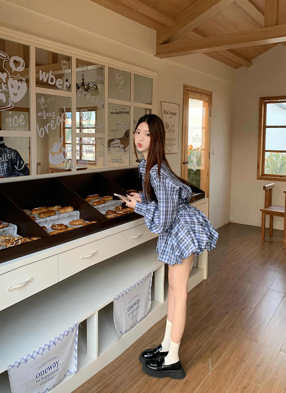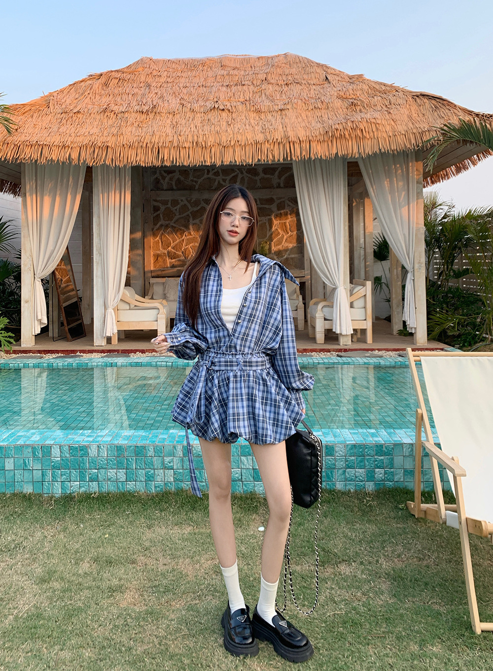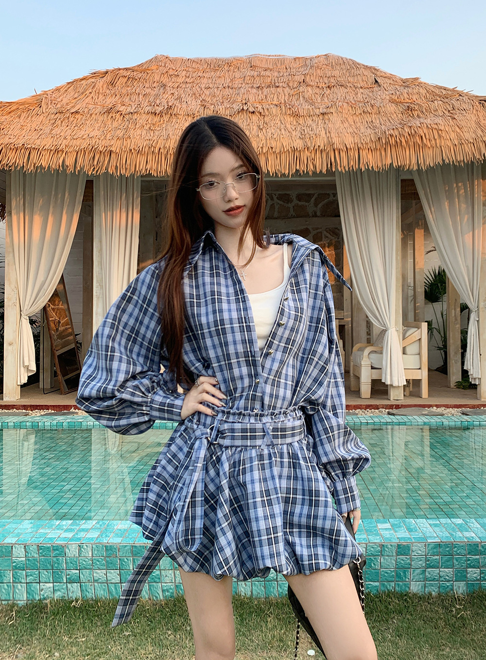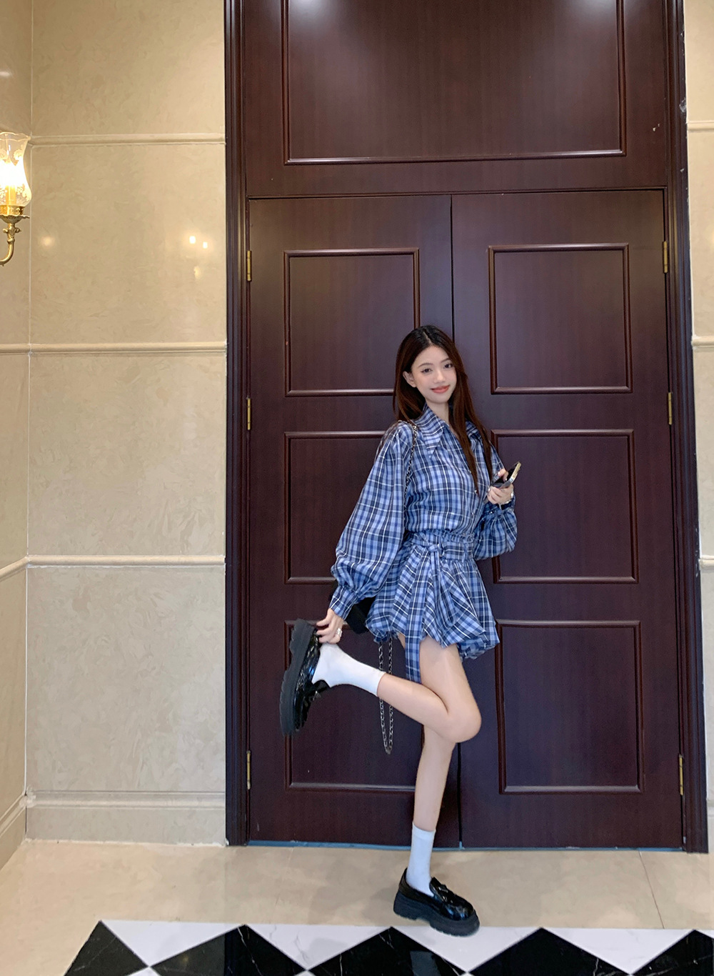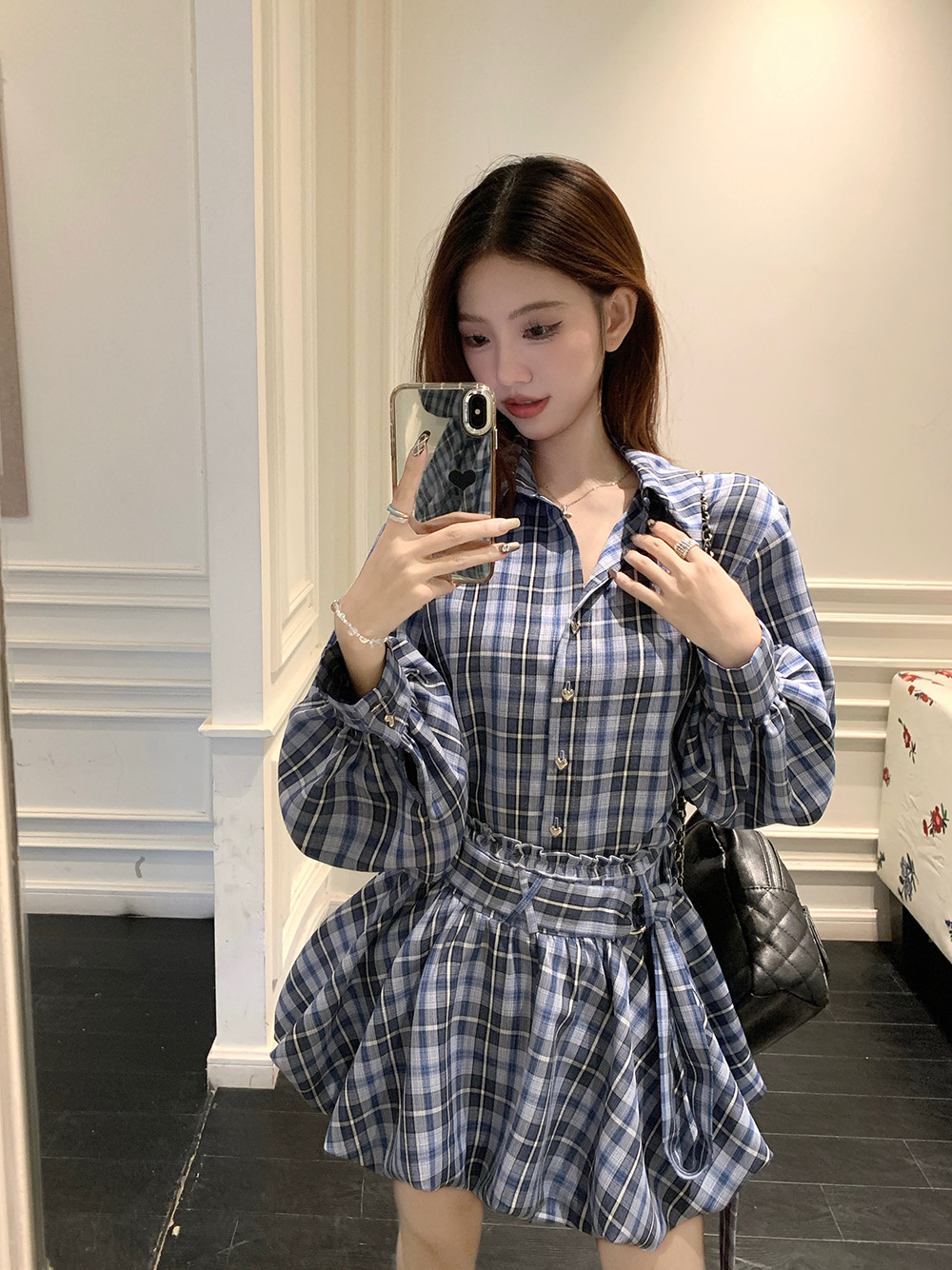 리얼 샷 ~ 2025 봄 새로운 연인 핫 소녀 순수 복고풍 체크 셔츠 스커트 바지 패션 세트 76612스토어 가기