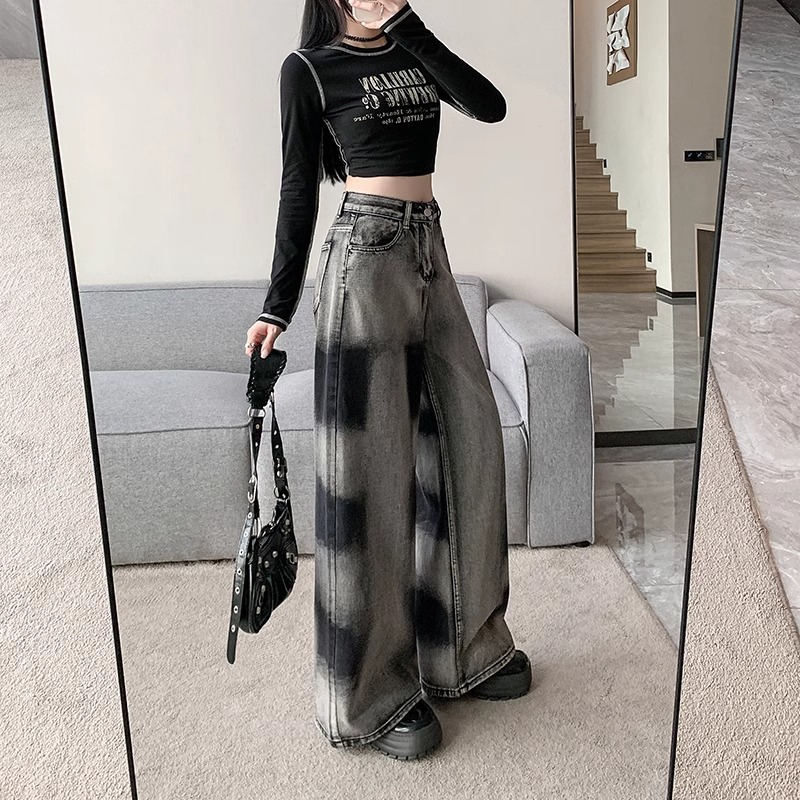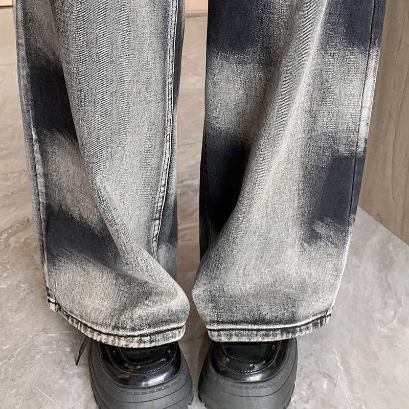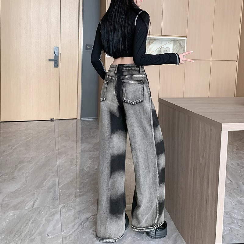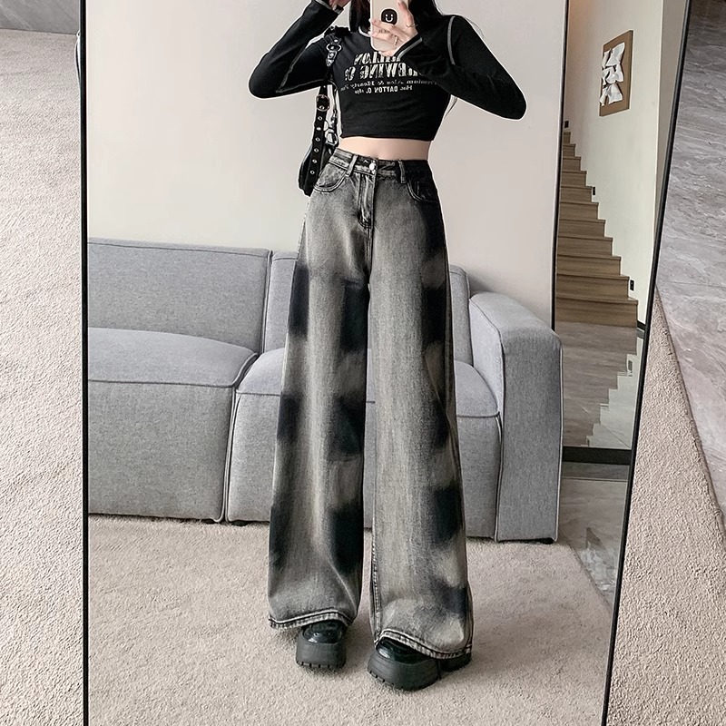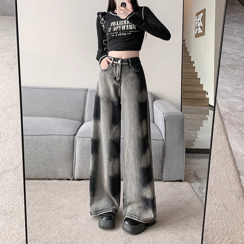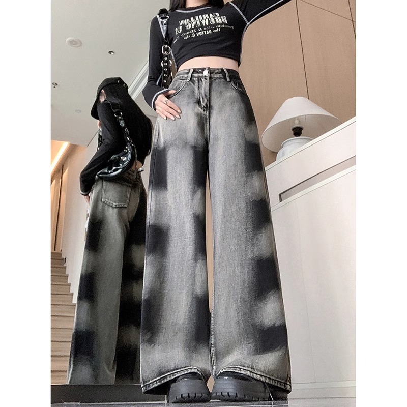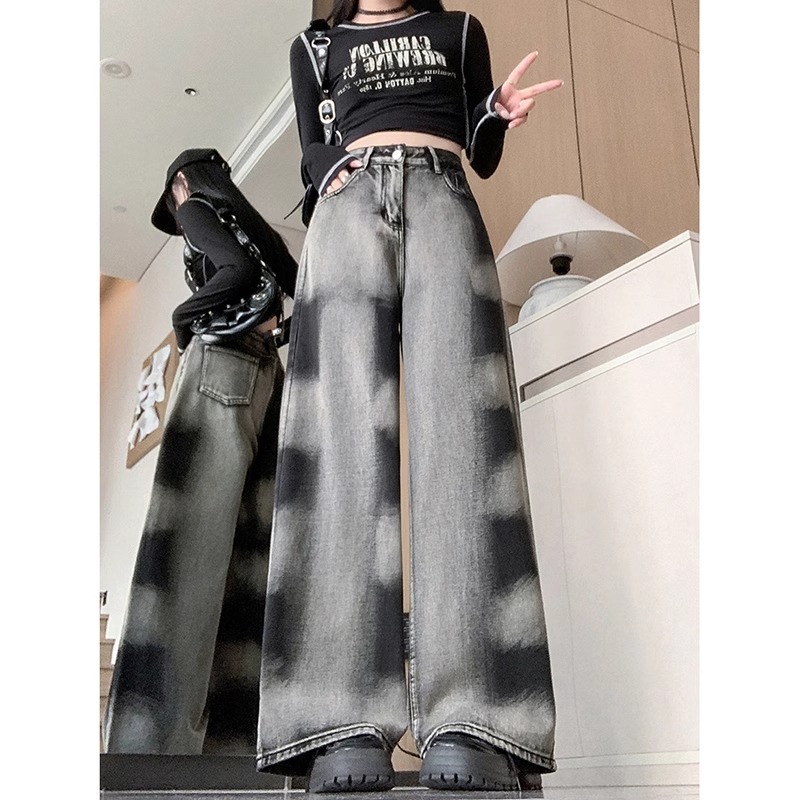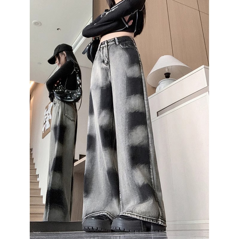 18 개의 트렌디 한 2025 레트로 중공업 타이 다이 청바지 여성용 루즈 스트레이트 바운스 하이 웨이스트 슬리밍 캐주얼 팬츠