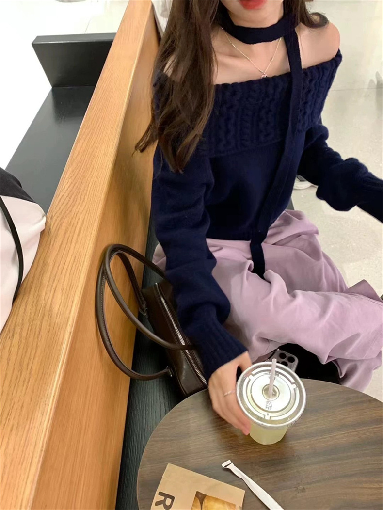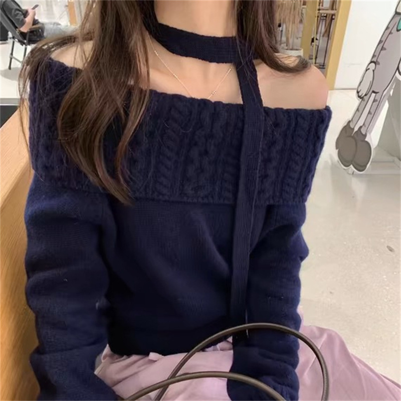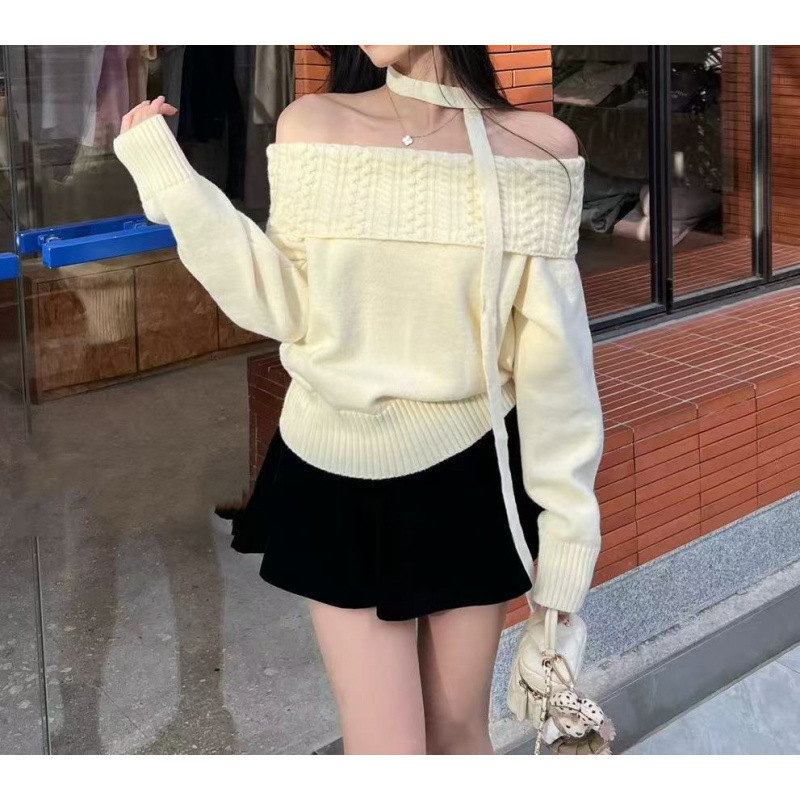 2025 새로운 디자인 센스 오프 숄더 그레이 트위스트 스웨터 여성의 봄과 가을 캐주얼 소프트 왁스 루즈 니트 탑스토어 가기
