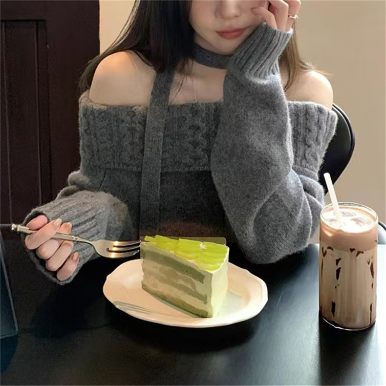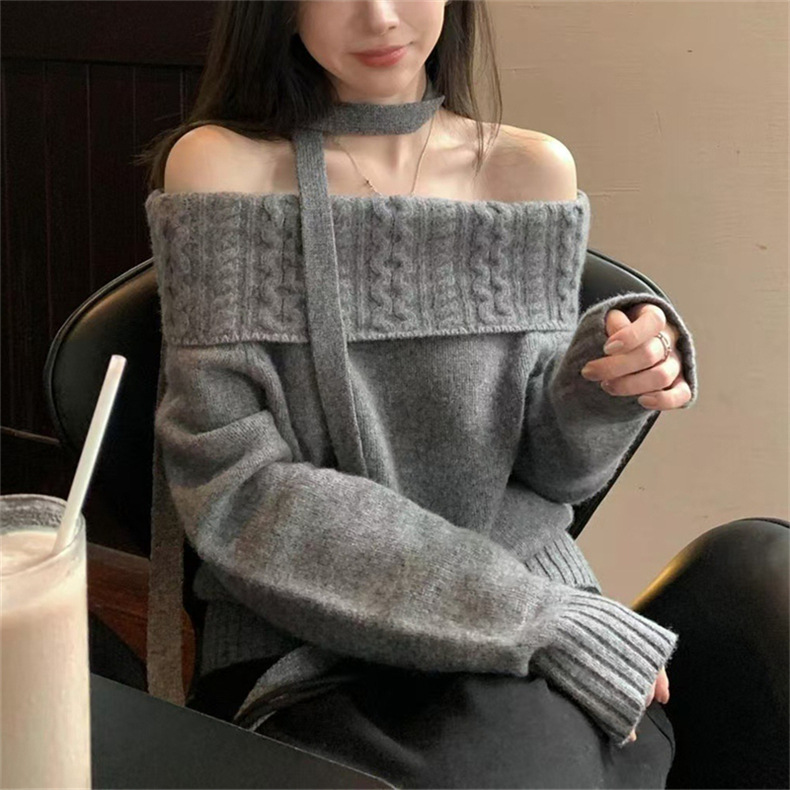 2025 새로운 디자인 센스 오프 숄더 그레이 트위스트 스웨터 여성의 봄과 가을 캐주얼 소프트 왁스 루즈 니트 탑