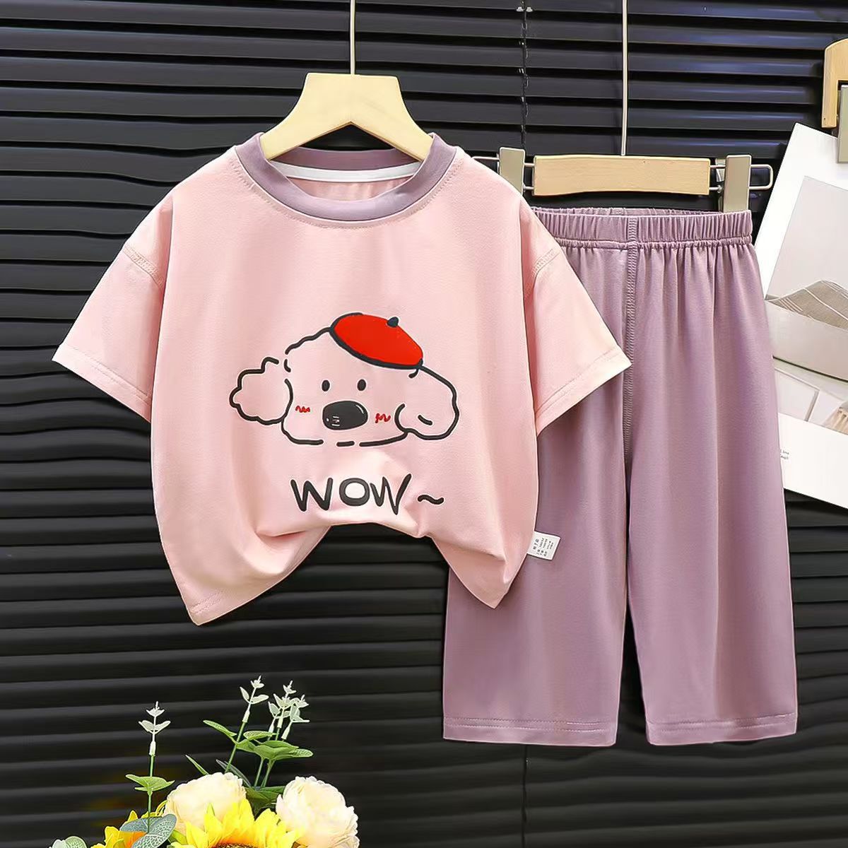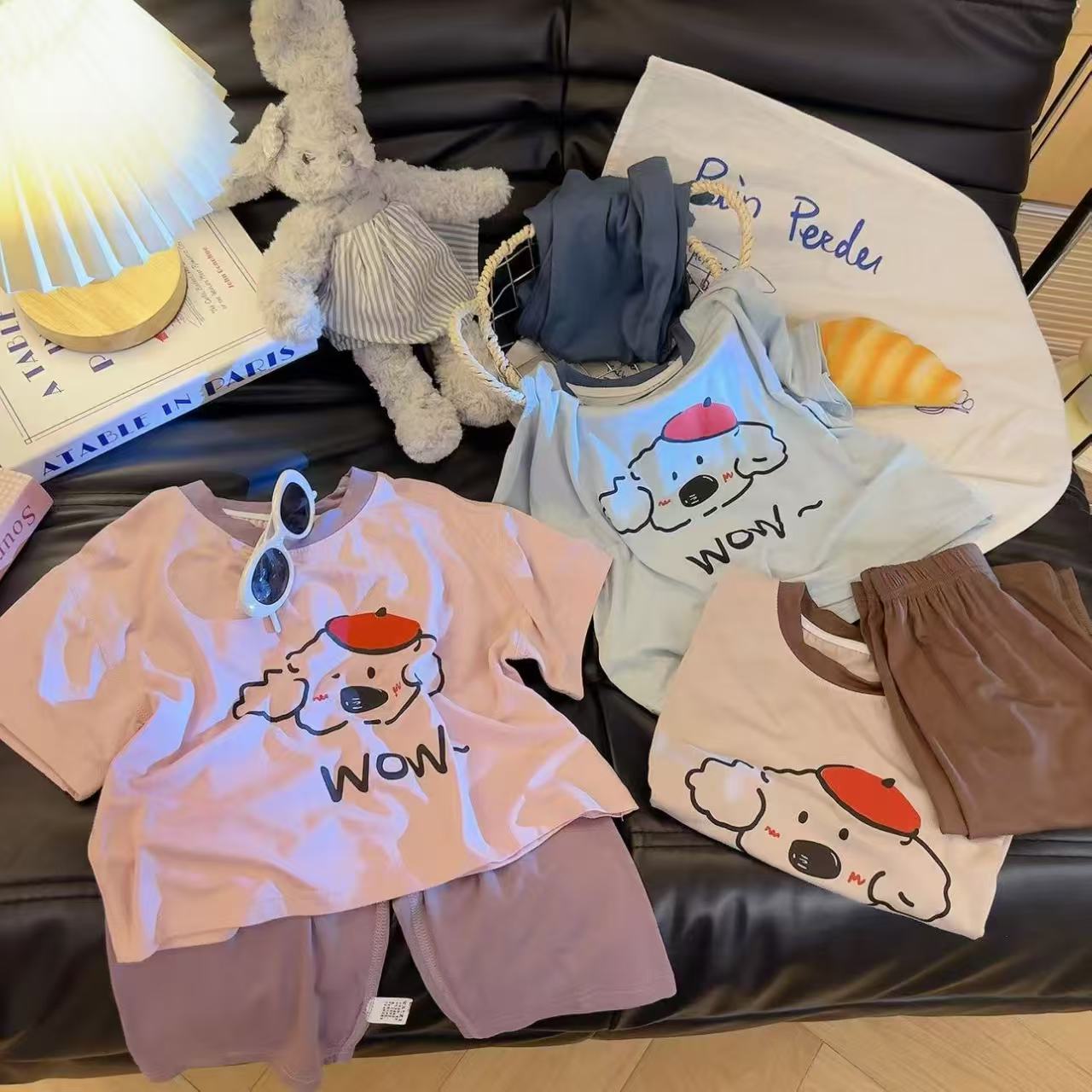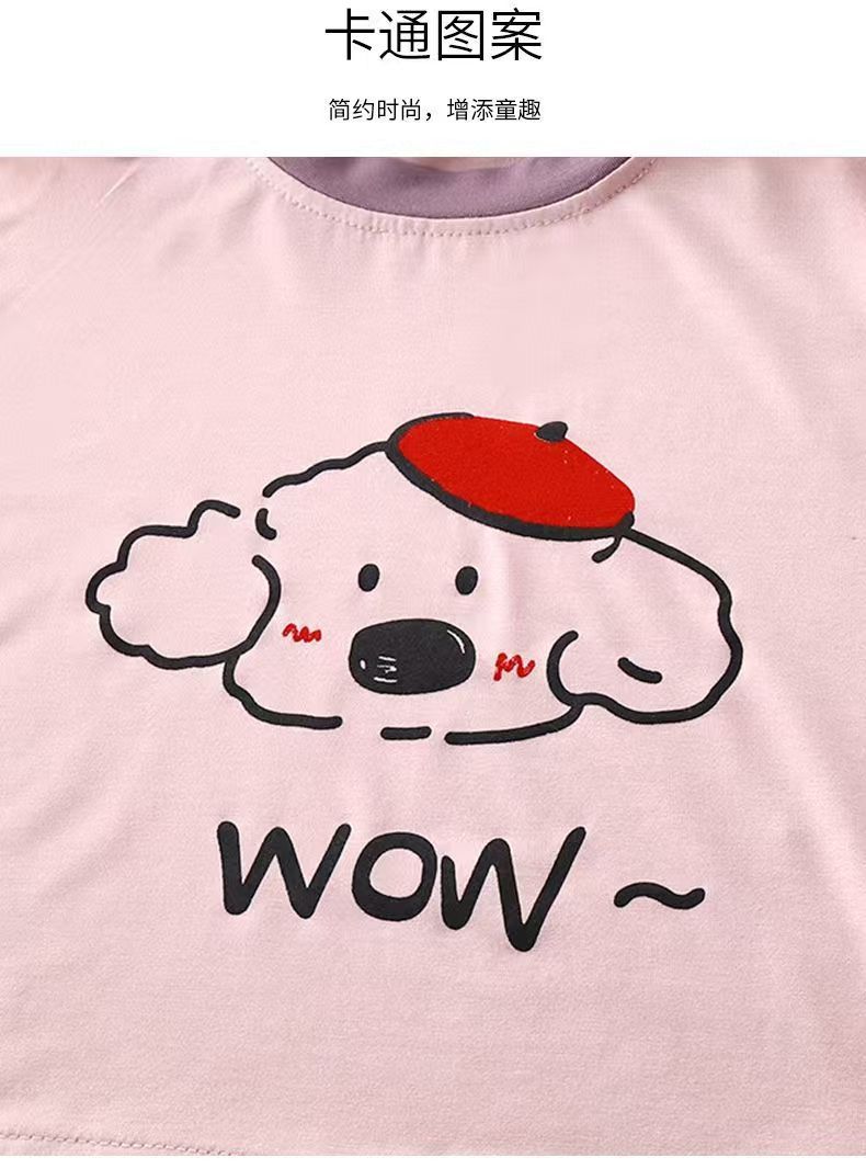 여름 새로운 에어컨 옷 귀여운 강아지 만화 얇은 둥근 목 반팔 반바지 세트 모달 홈 옷스토어 가기