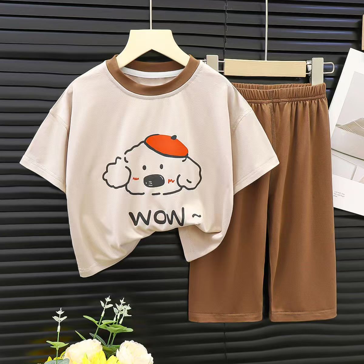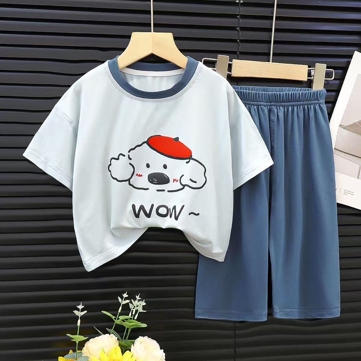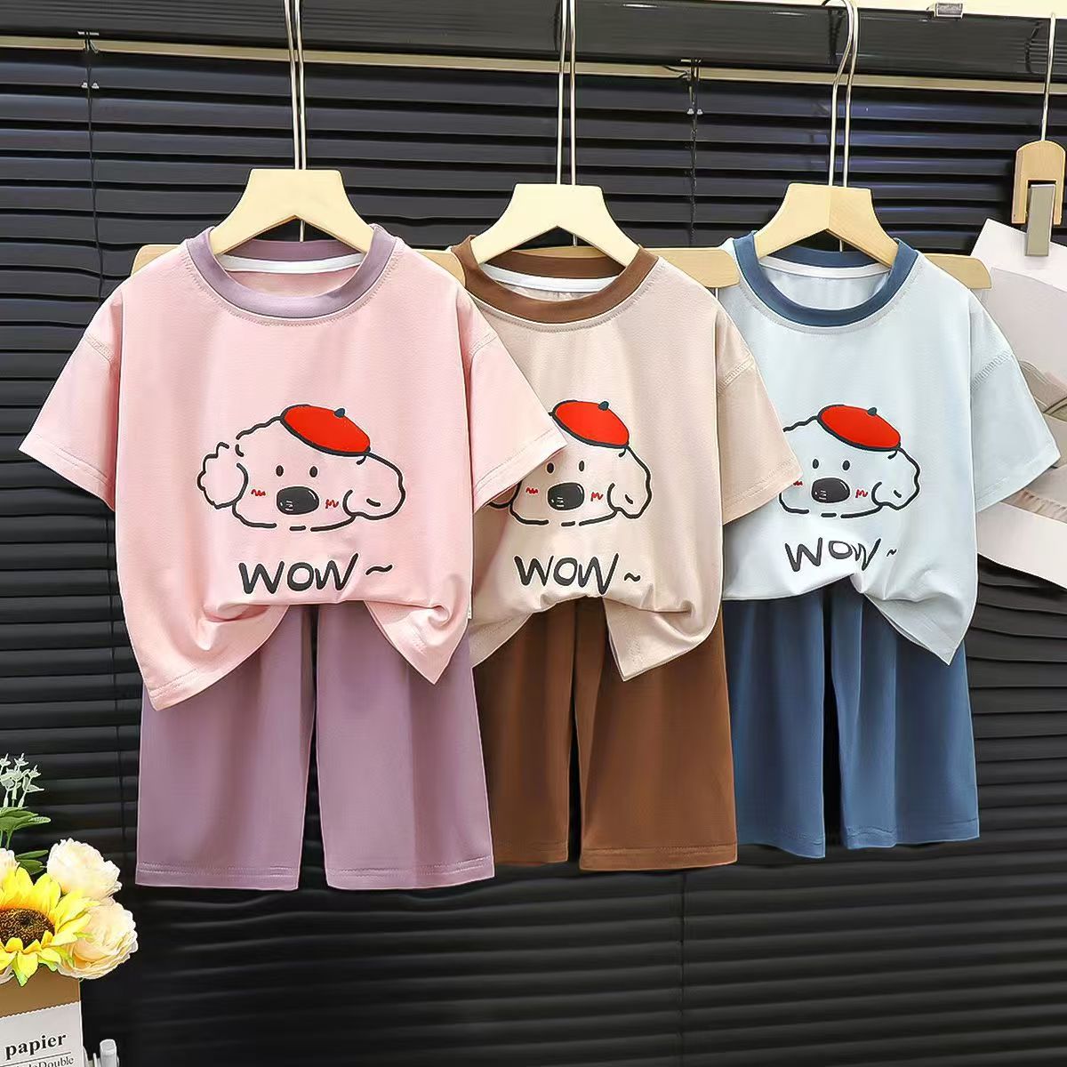 여름 새로운 에어컨 옷 귀여운 강아지 만화 얇은 둥근 목 반팔 반바지 세트 모달 홈 옷스토어 가기