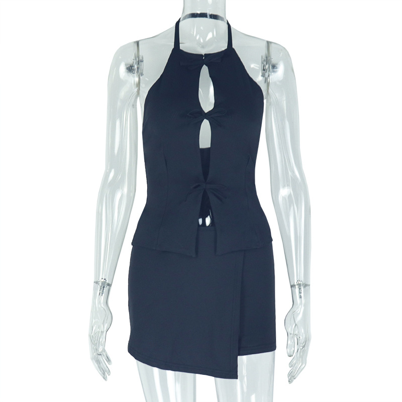 유럽과 미국 스타일의 국경 기질 여성의 새로운 여름 단색 속이 빈 주름 가방 엉덩이 스커트 투피스 여성 파티스토어 가기