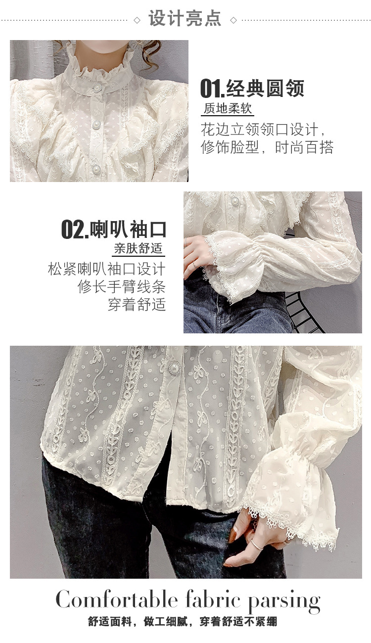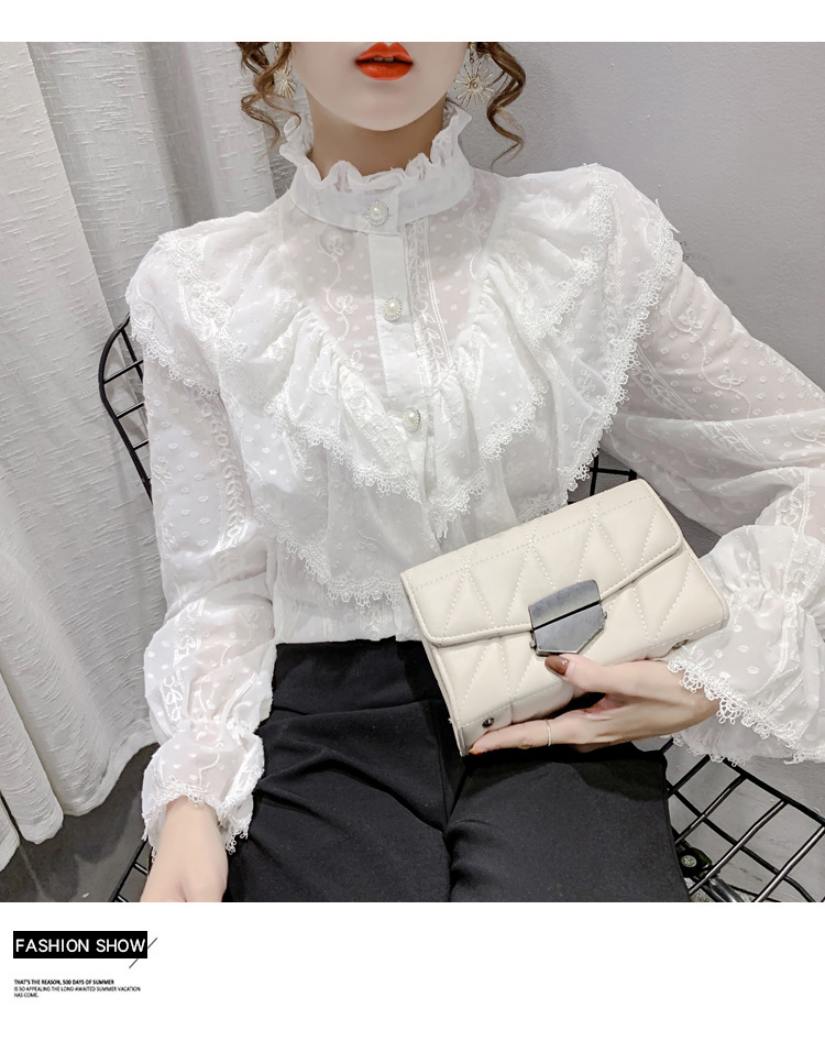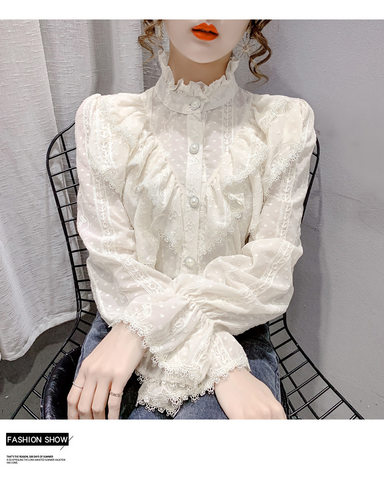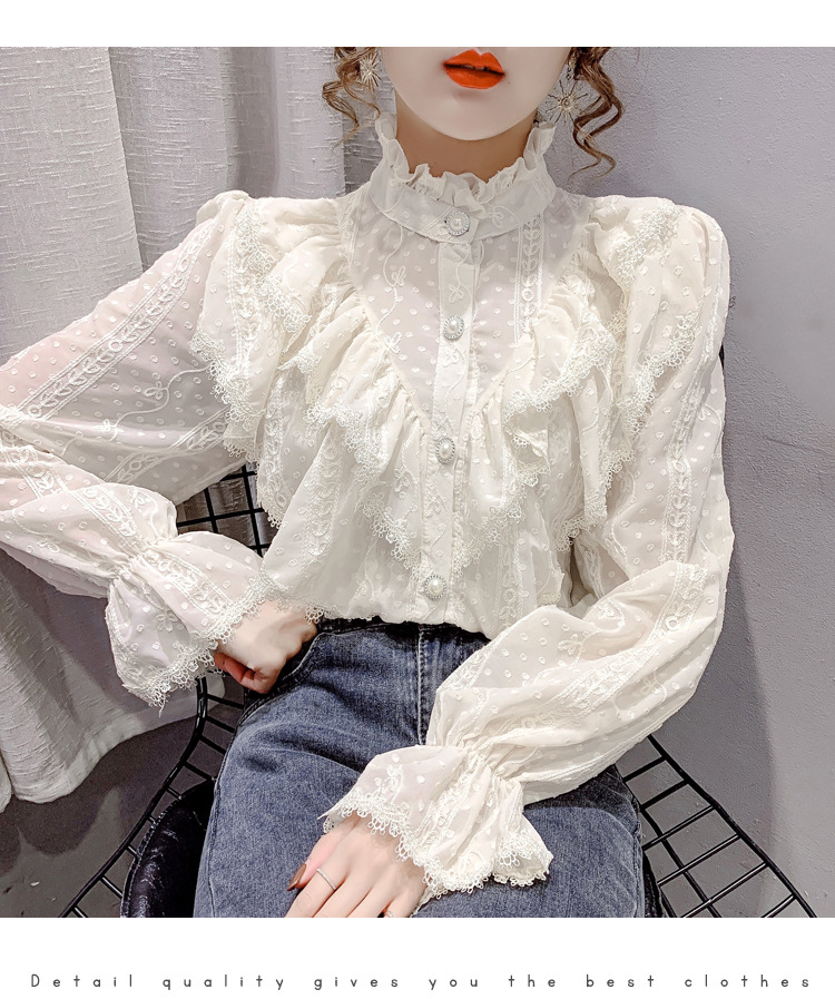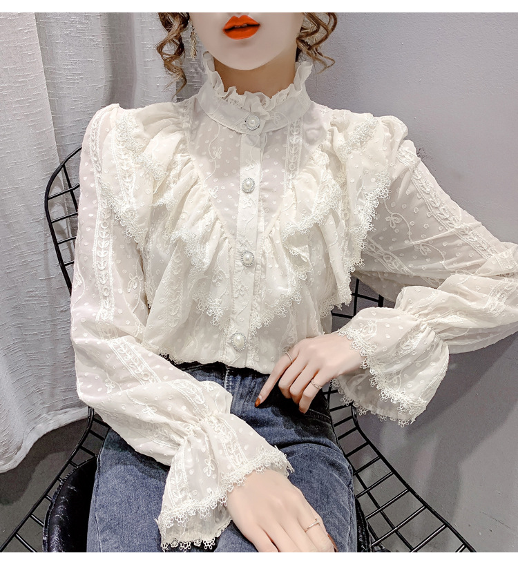 2025 봄 새로운 슈퍼 페어리 러플 트럼펫 소매 폴카 도트 쉬폰 셔츠 예술적 모리 자수 도트 셔츠
